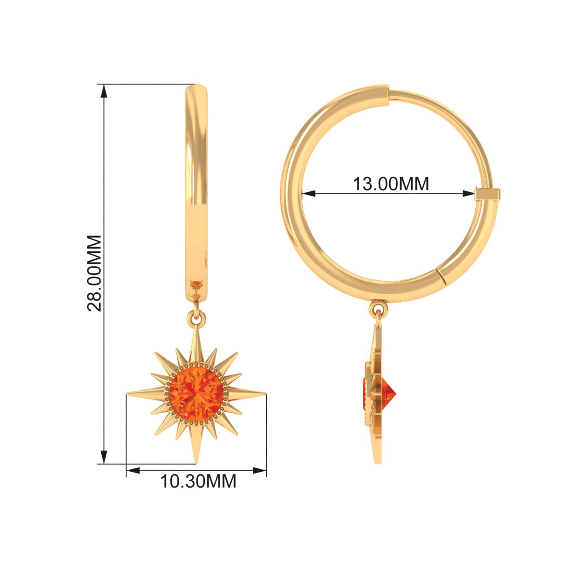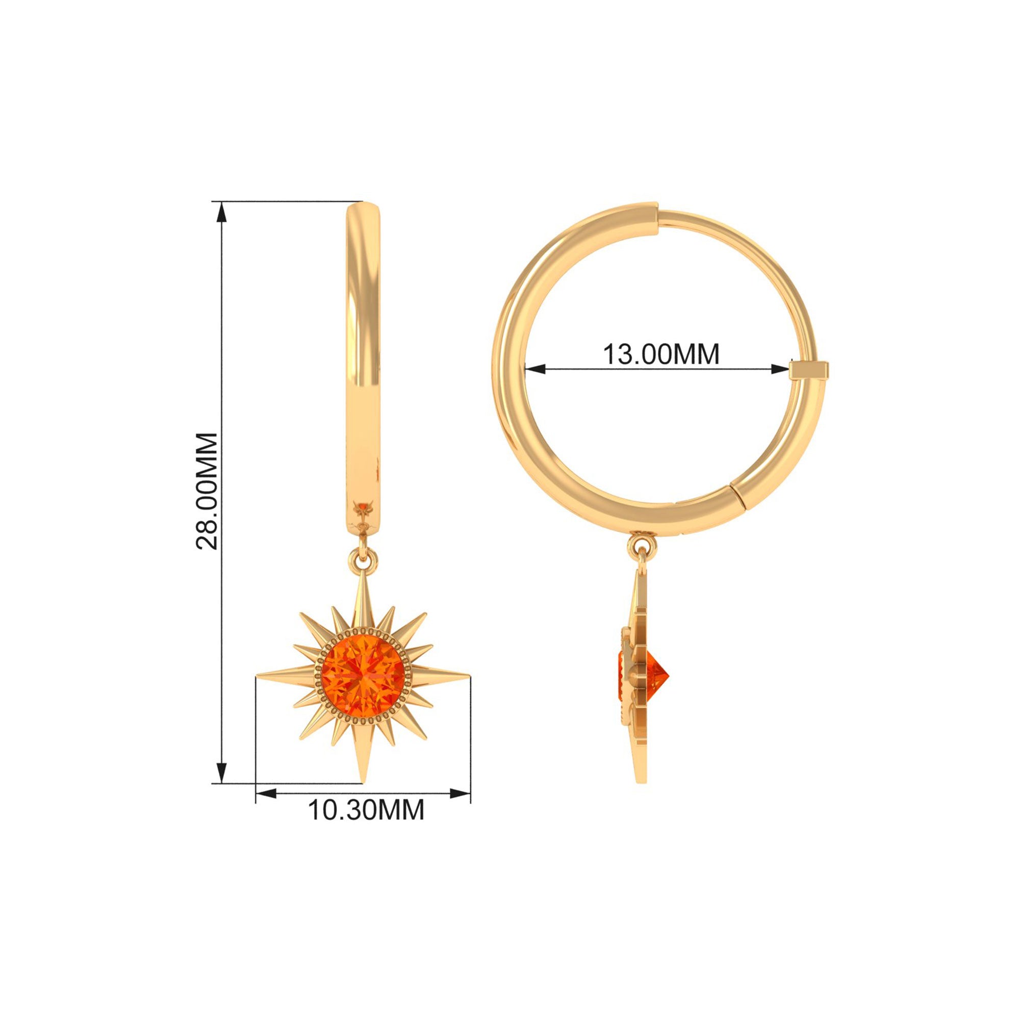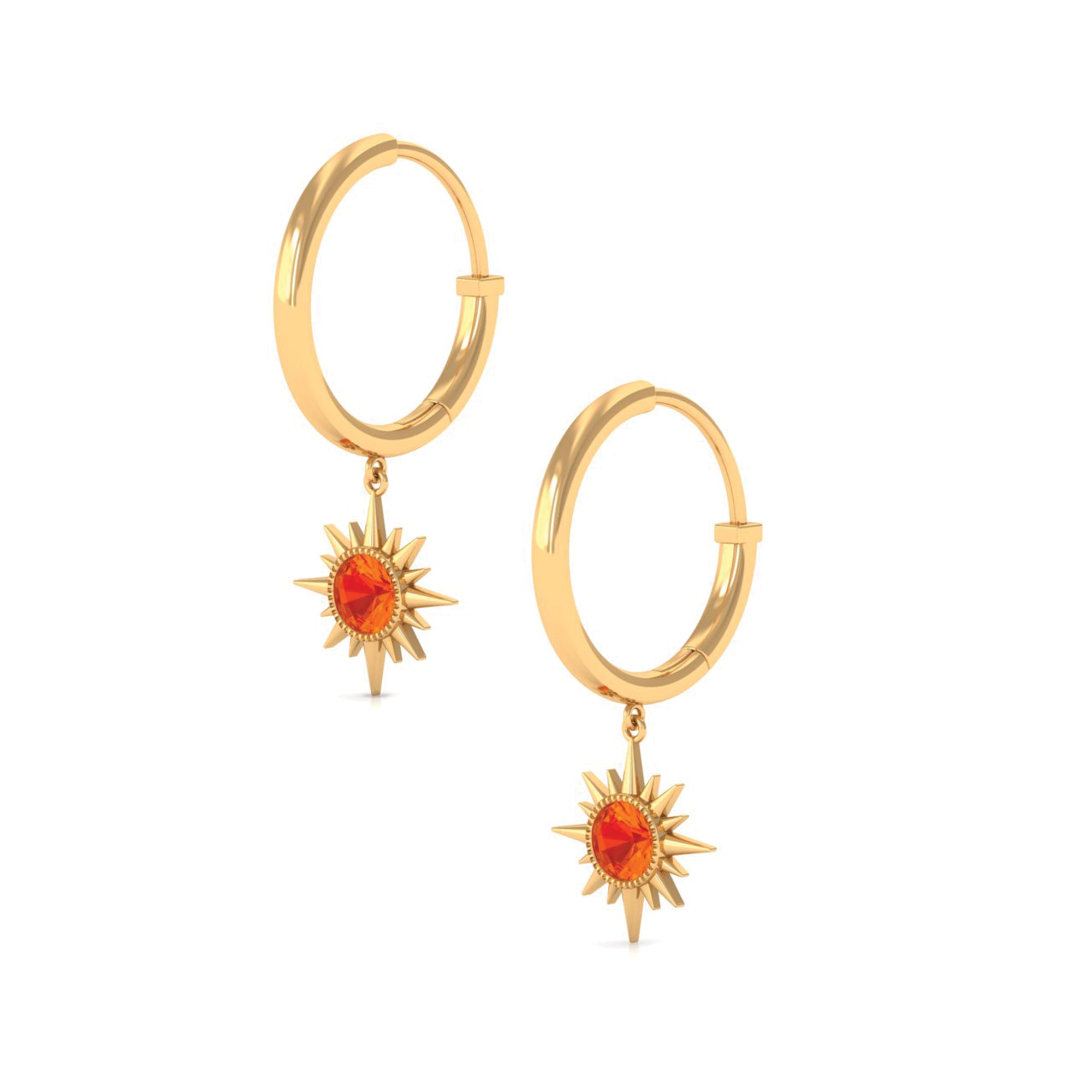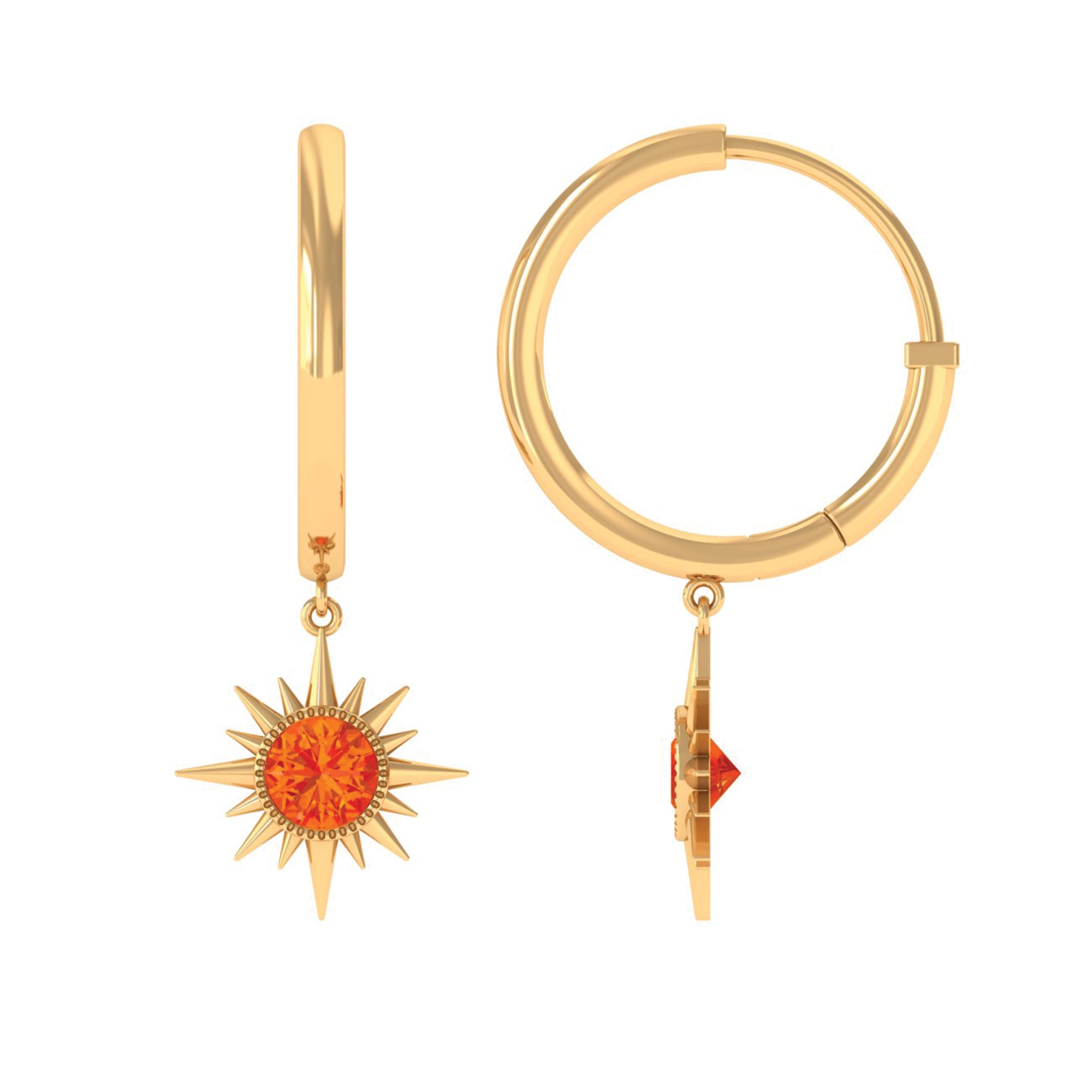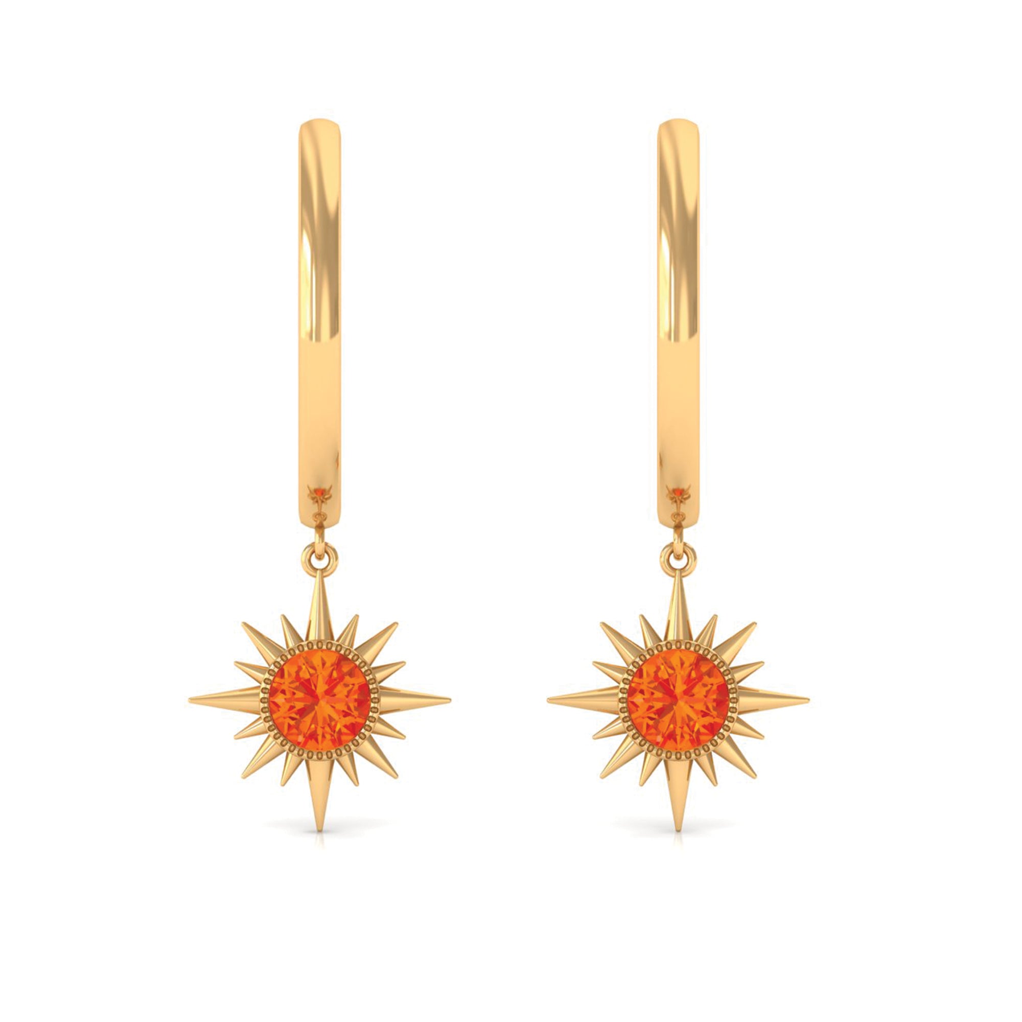 Flaunt with these beautiful Sunburst Drop Hoop Earrings adorned with Round Cut Orange Sapphire set in Milgrain Bezel Setting. These Stud Earrings are Composed of Solid Gold.
