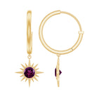 Flaunt with these beautiful Sunburst Drop Hoop Earrings adorned with Round Cut Rhodolite set in Milgrain Bezel Setting. These Stud Earrings are Composed of Solid Gold.