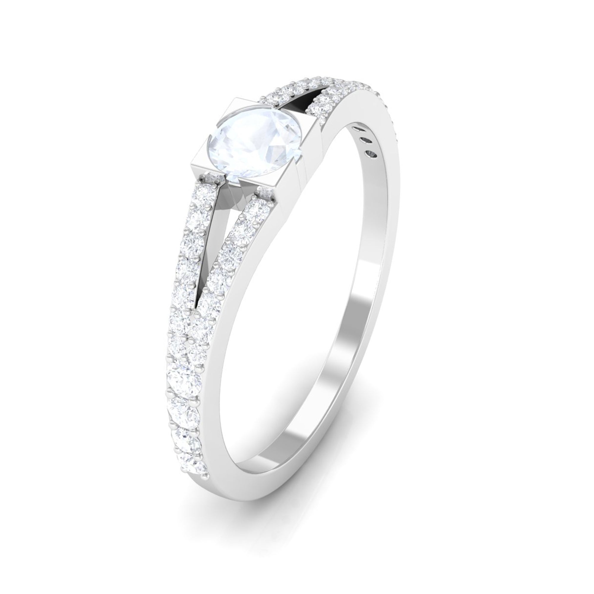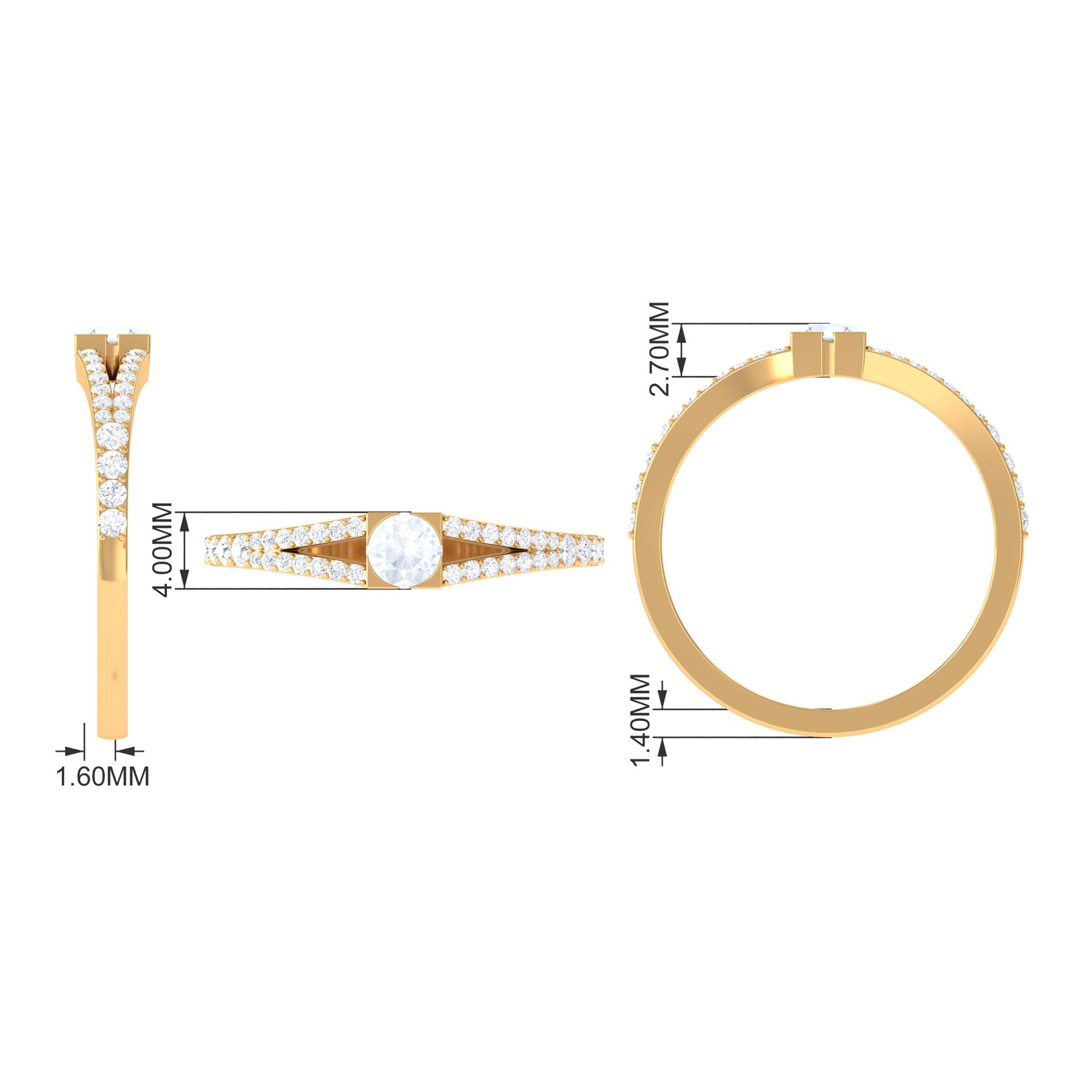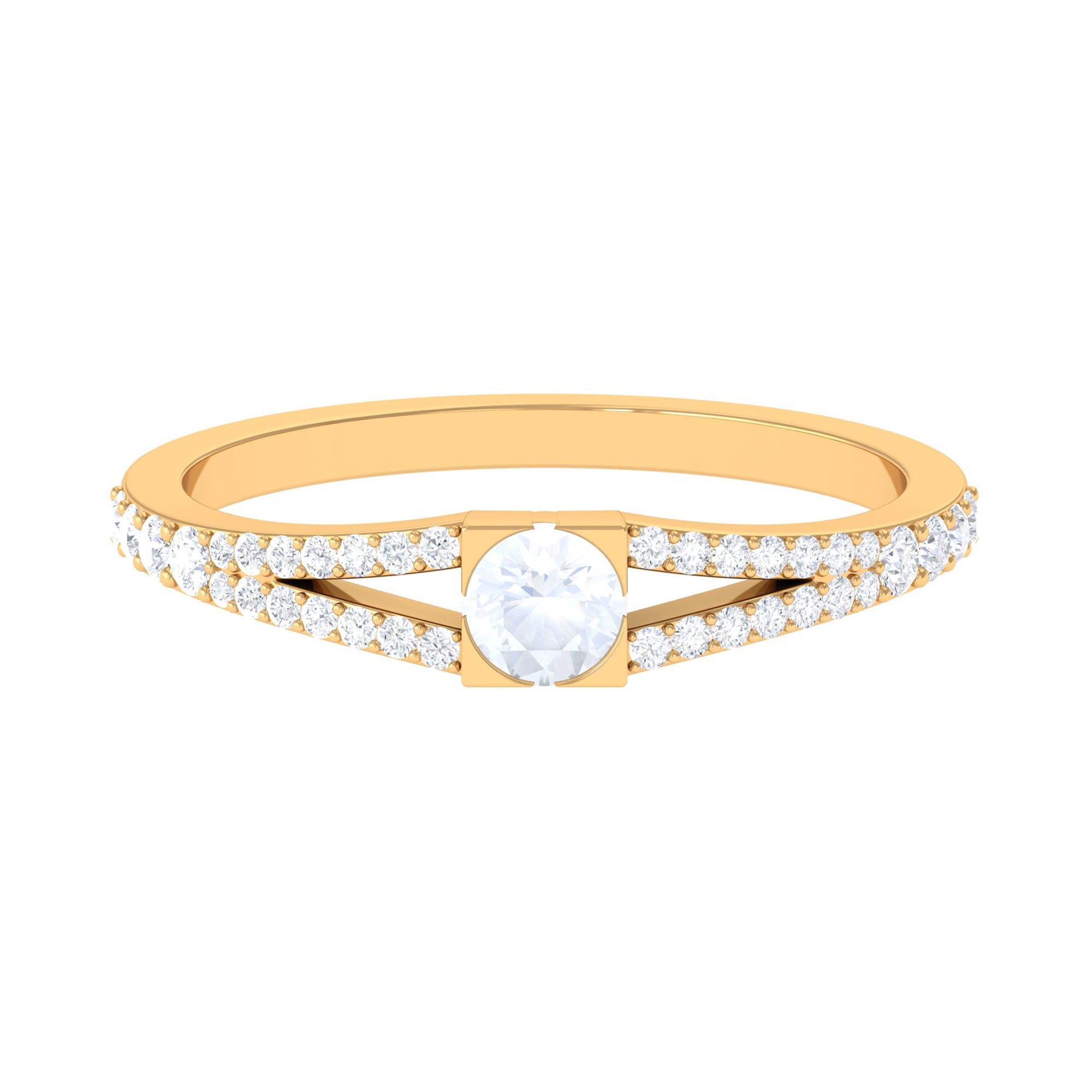 Here is Minimal yet Captivating Moonstone Promise Ring for Women. It features Round Moonstone sitting in the center with Diamond Accented Split Shank. The Gold Ring is ideal for June Born Down to Earth Women.
