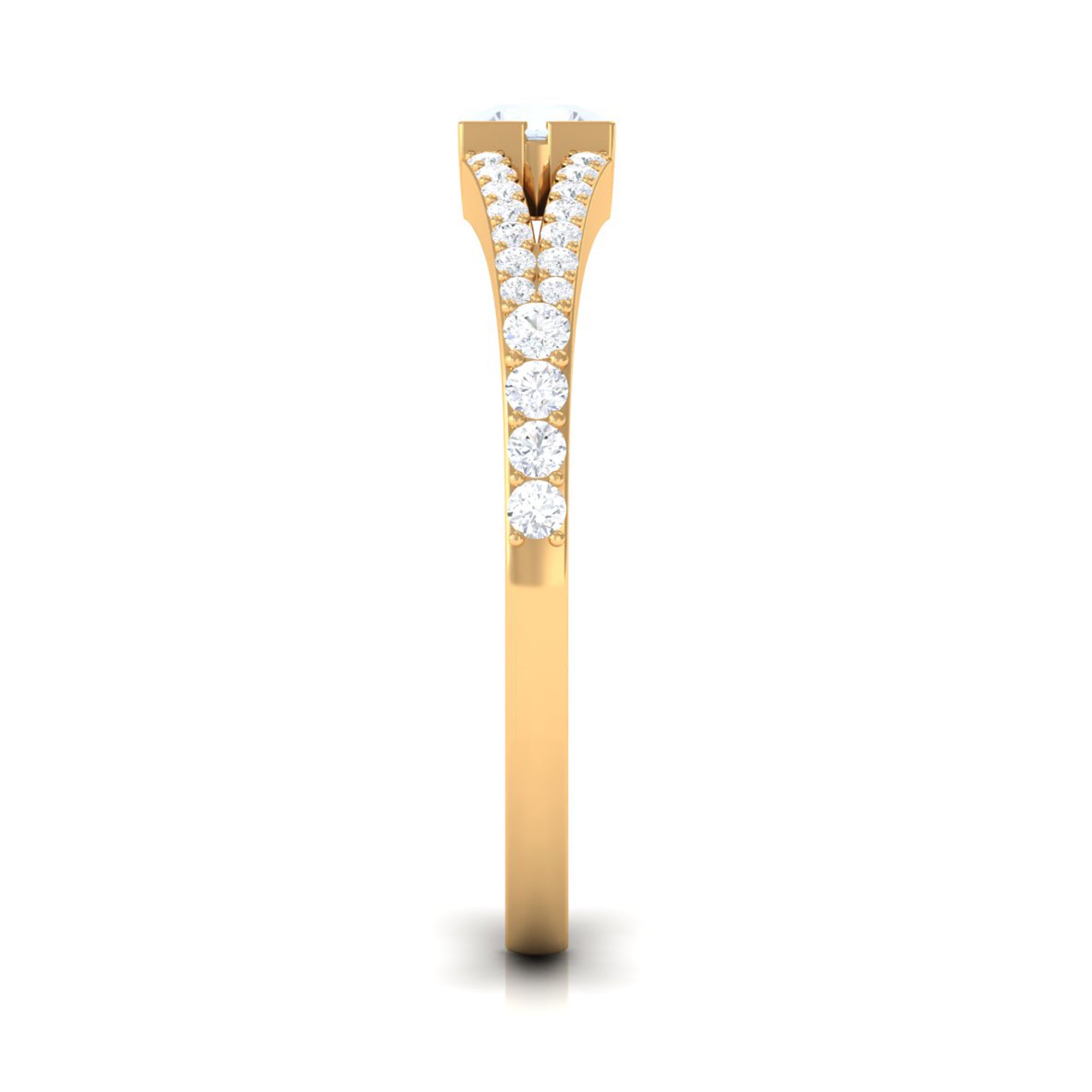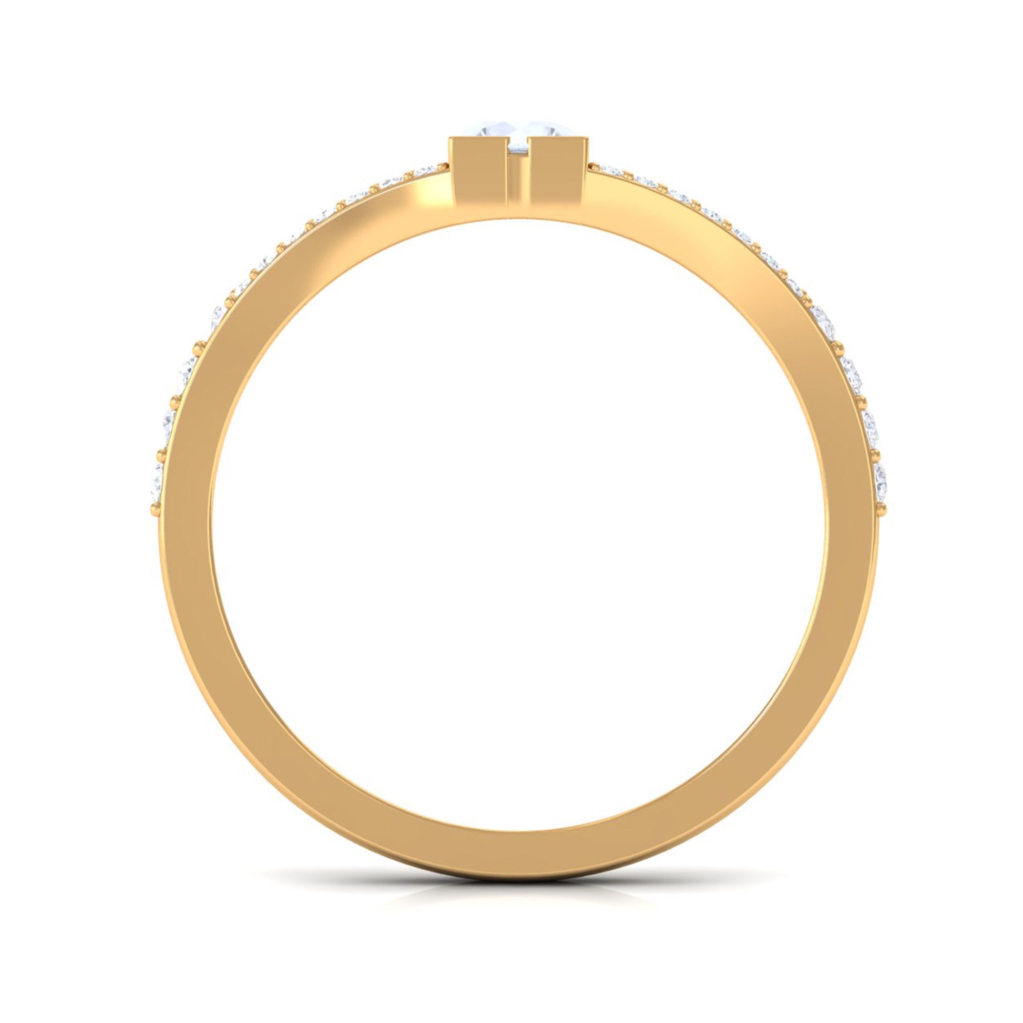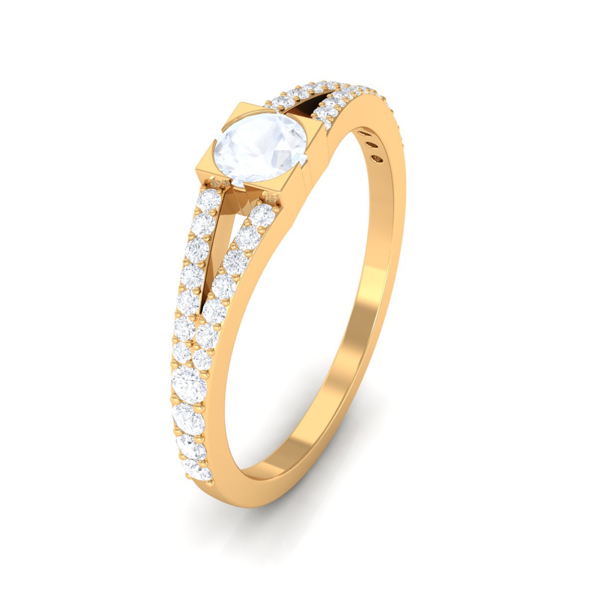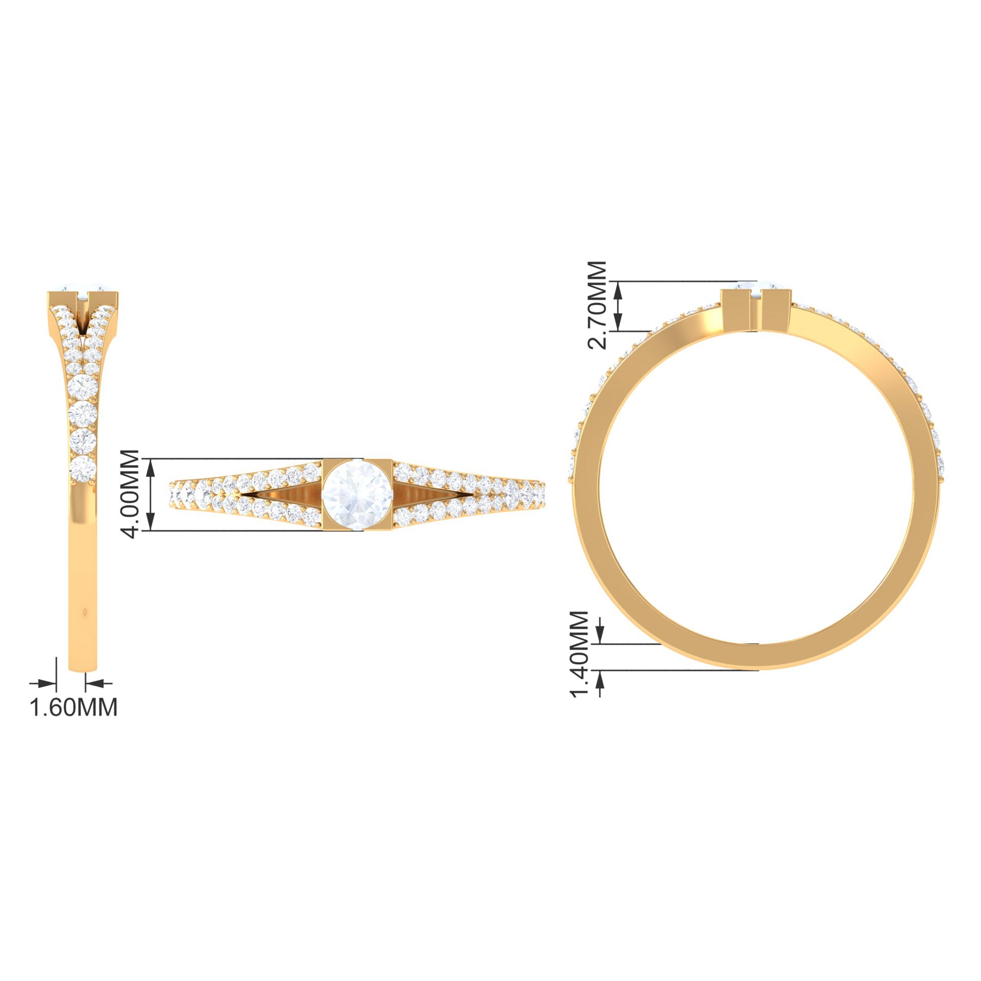 Here is Minimal yet Captivating Moonstone Promise Ring for Women. It features Round Moonstone sitting in the center with Diamond Accented Split Shank. The Gold Ring is ideal for June Born Down to Earth Women.
