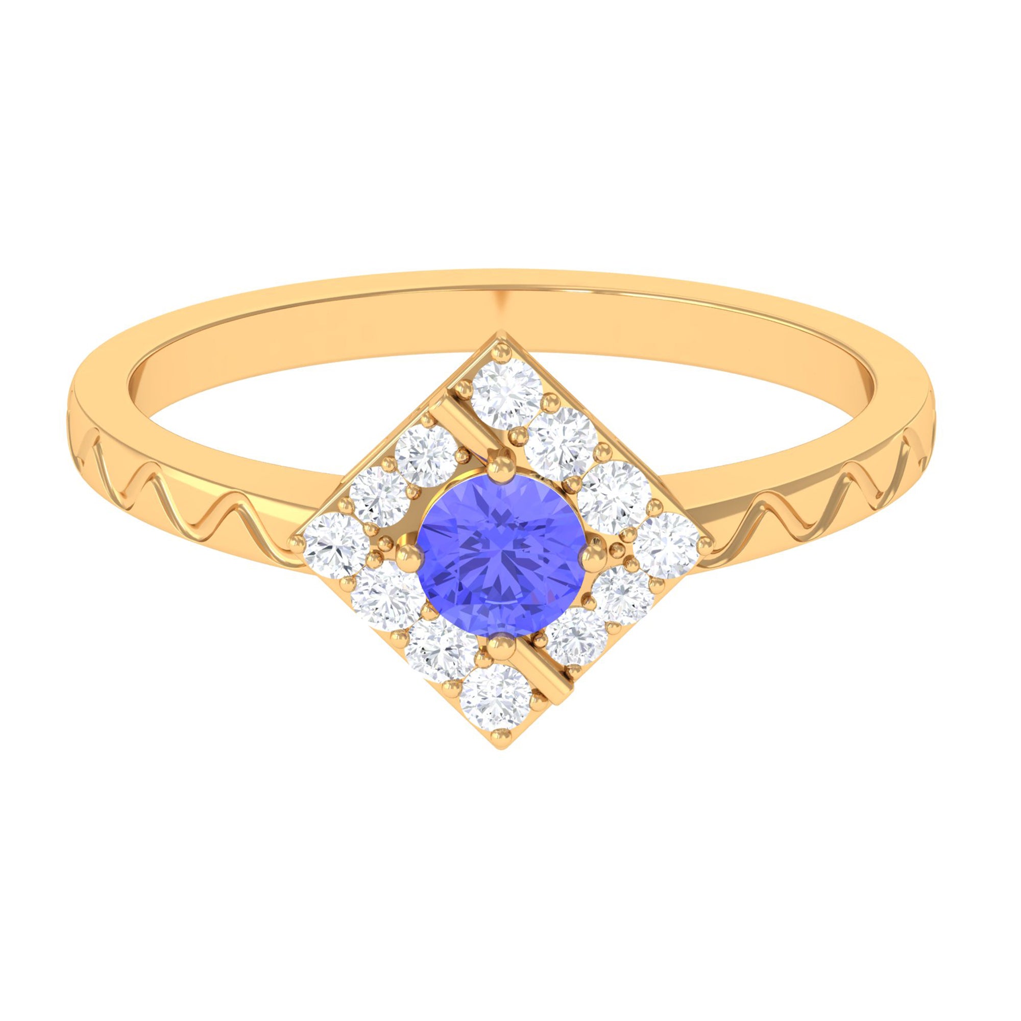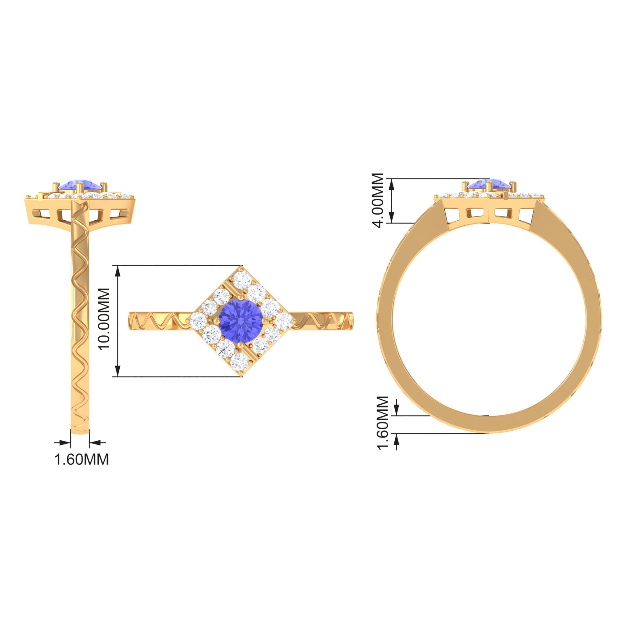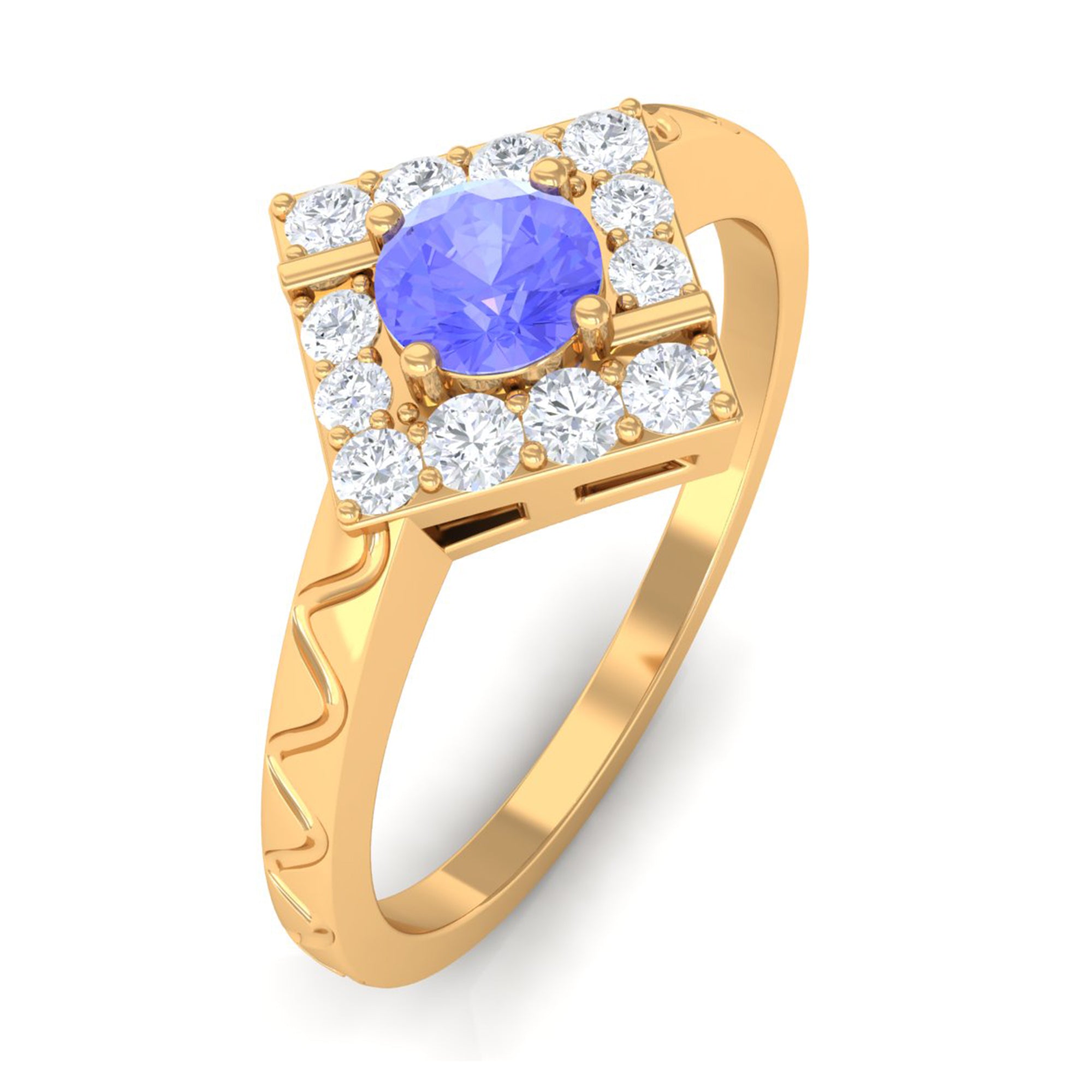 Be the center of attention with this delightful and sparkling Tanzanite Ring. It is embellished with Round Shape Tanzanite in Prong Setting with Gold Textured Details. This Minimal Tanzanite Ring with Diamond Halo is composed in Gold.