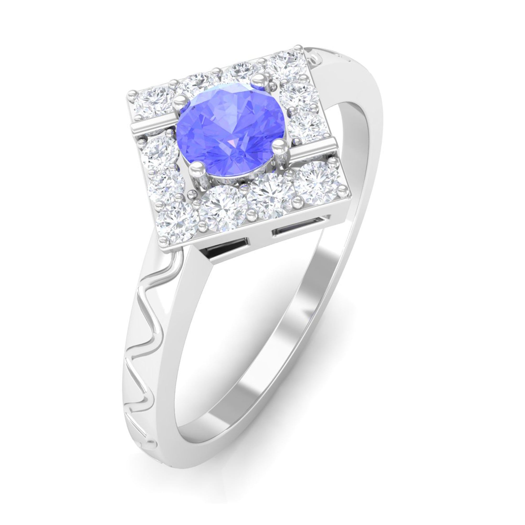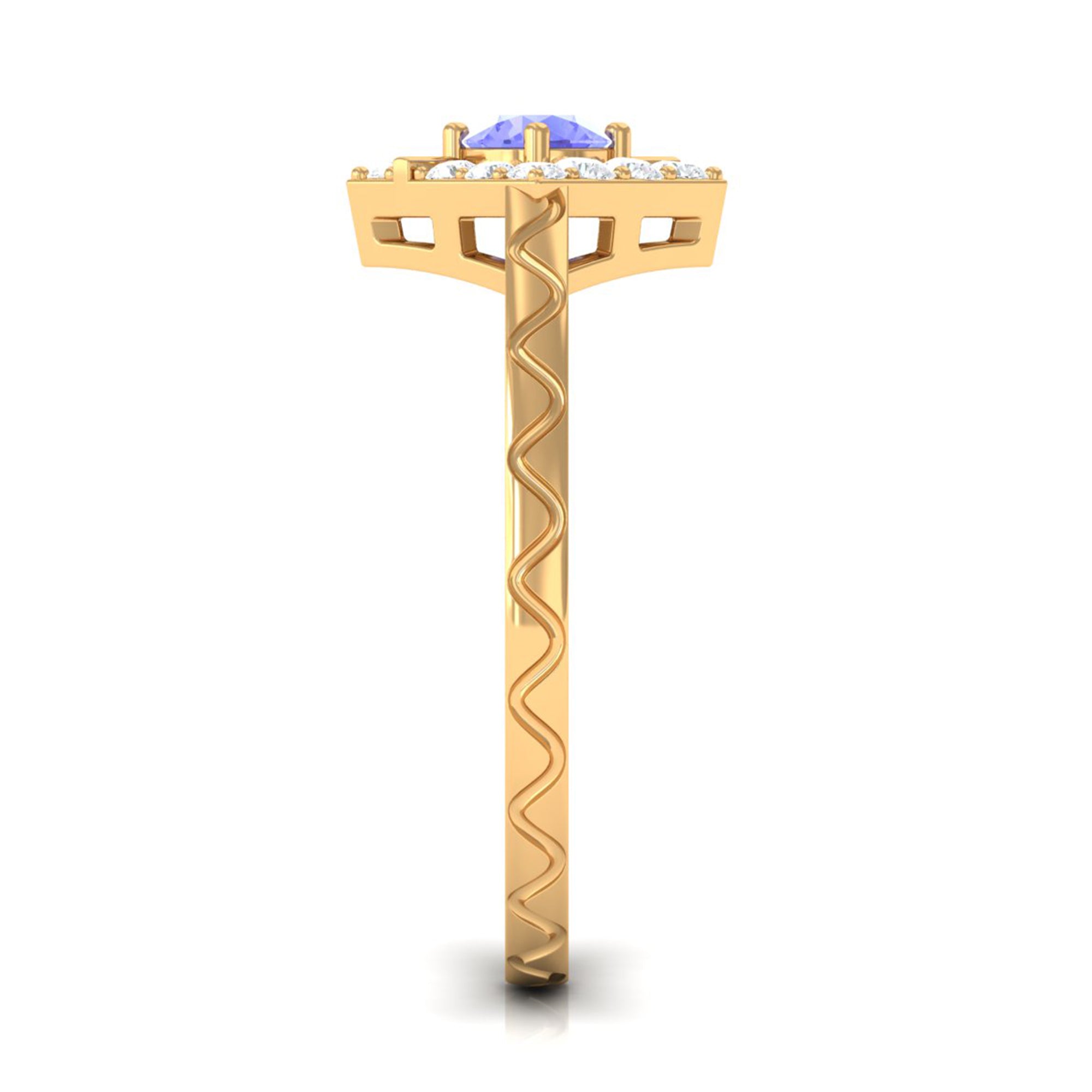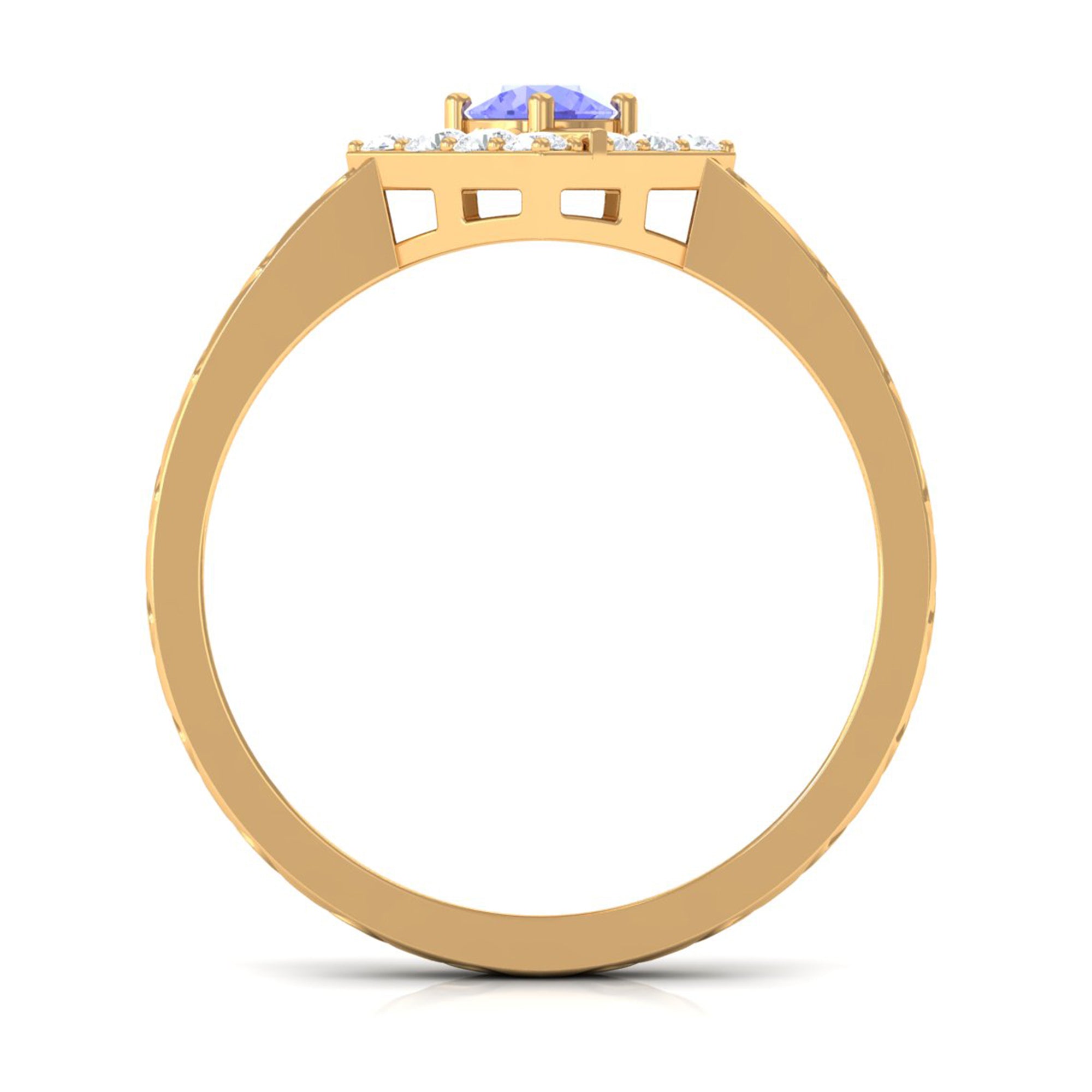 Be the center of attention with this delightful and sparkling Tanzanite Ring. It is embellished with Round Shape Tanzanite in Prong Setting with Gold Textured Details. This Minimal Tanzanite Ring with Diamond Halo is composed in Gold.