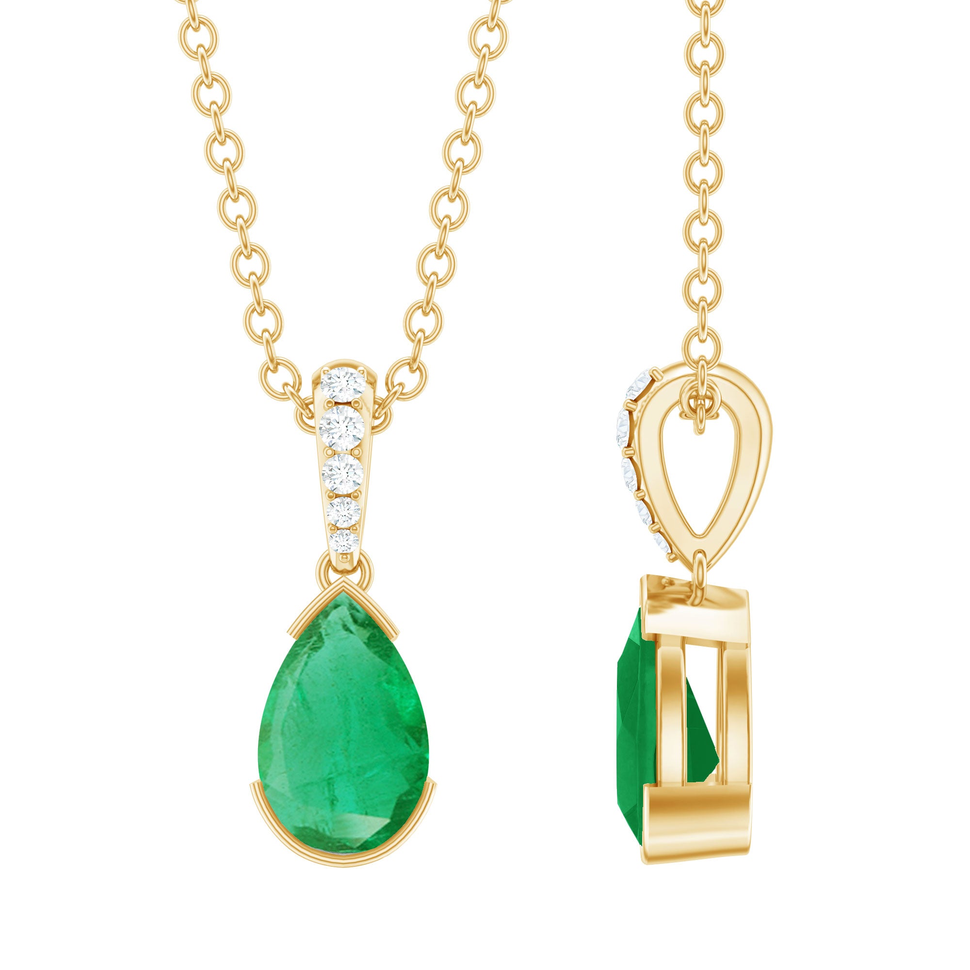 Be Unique with this Lovely Solitaire Pendant is embellished with Pear Shape Emerald set as a Solitaire in a Half Bezel Setting with Round Shape Diamond in an Accent Bail, crafted in solid gold.