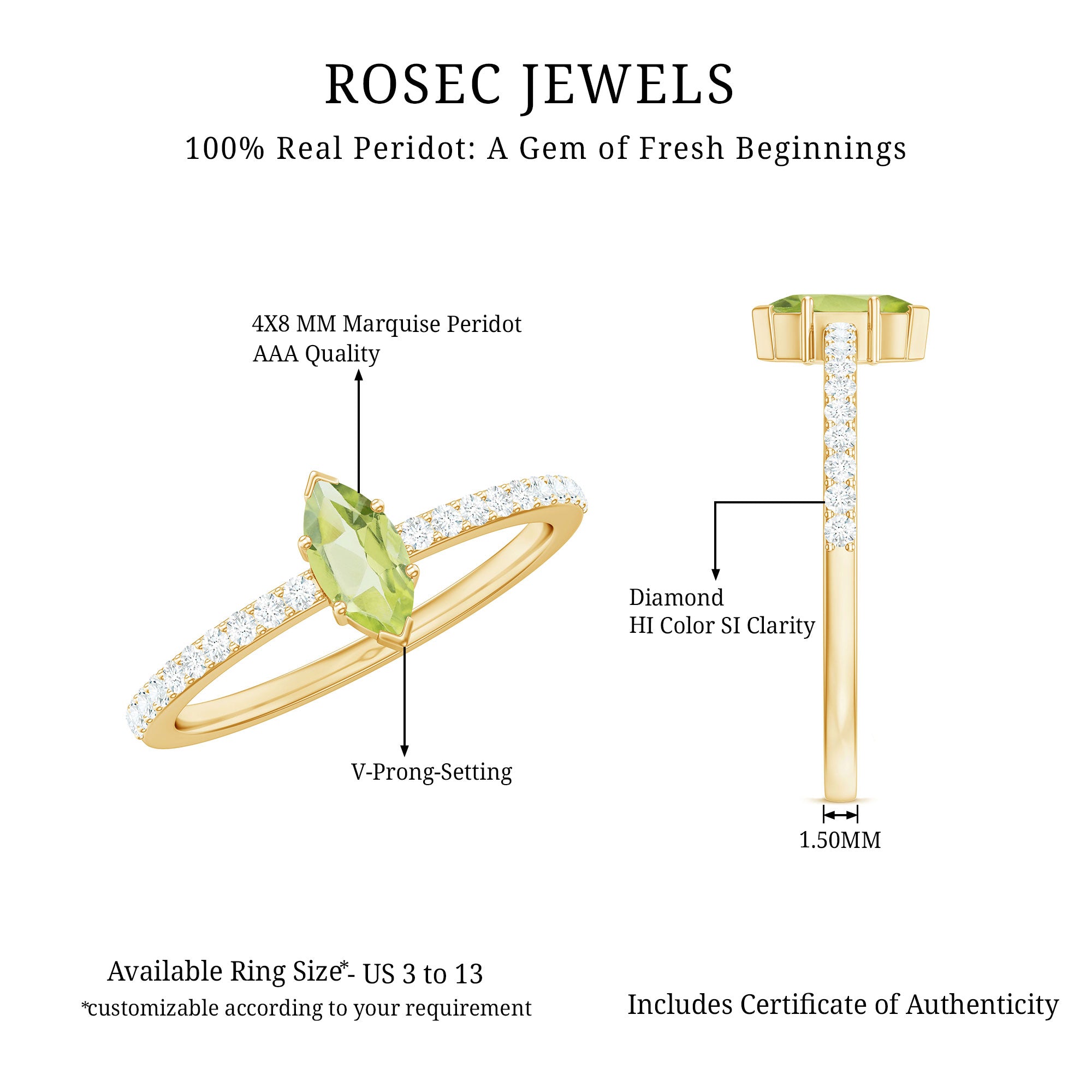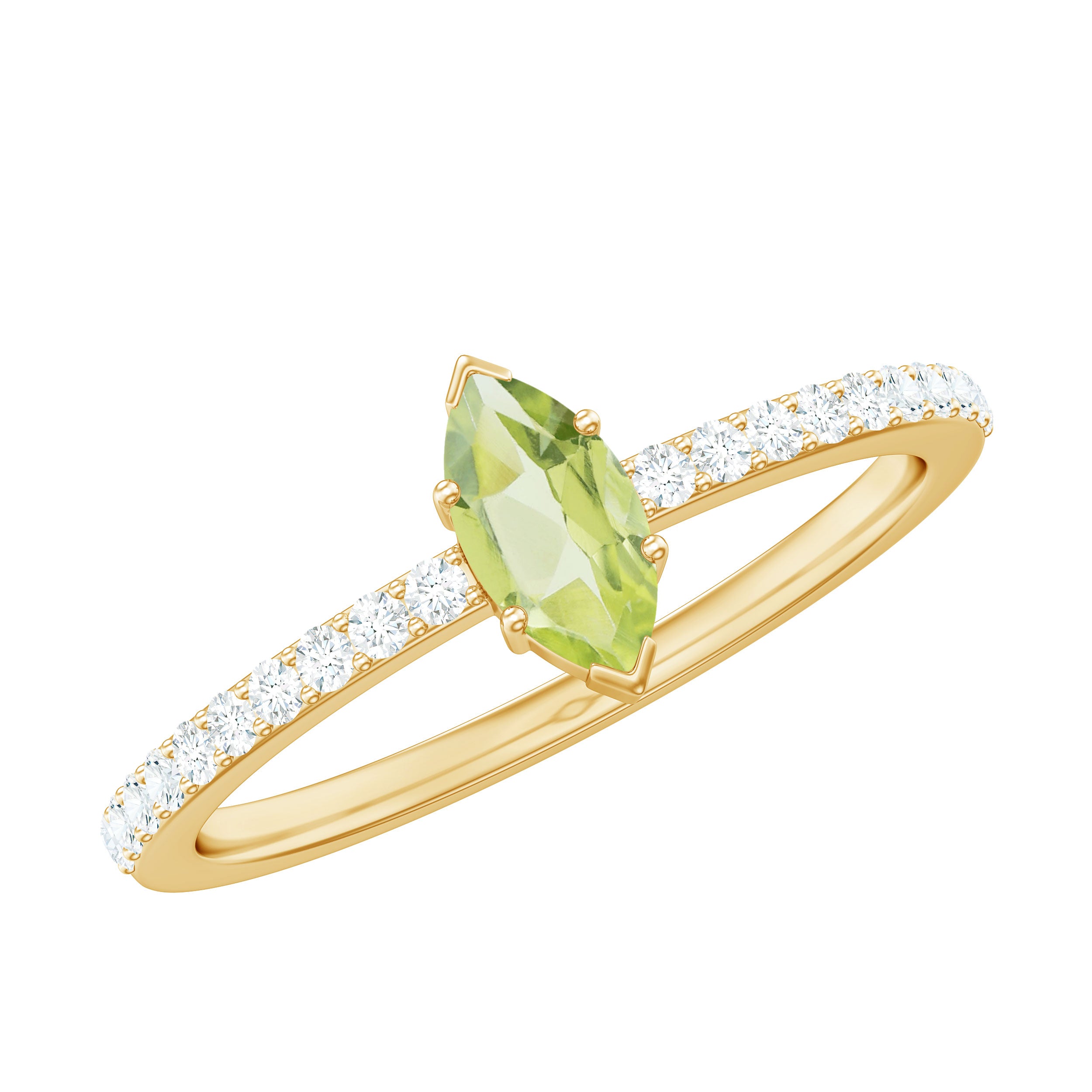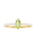 Propose to her with this alluring Promise Ring and make her fall in love with you. This Solitaire Ring is decorated with Marquise Cut Peridot in V Prong Setting with Diamond Stones studded over the intriguing shank. This Peridot and Diamond Ring will surely be the right choice for your lady love.