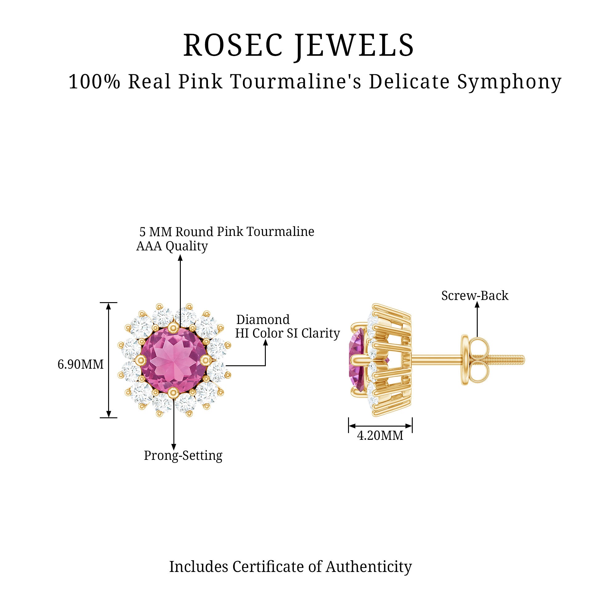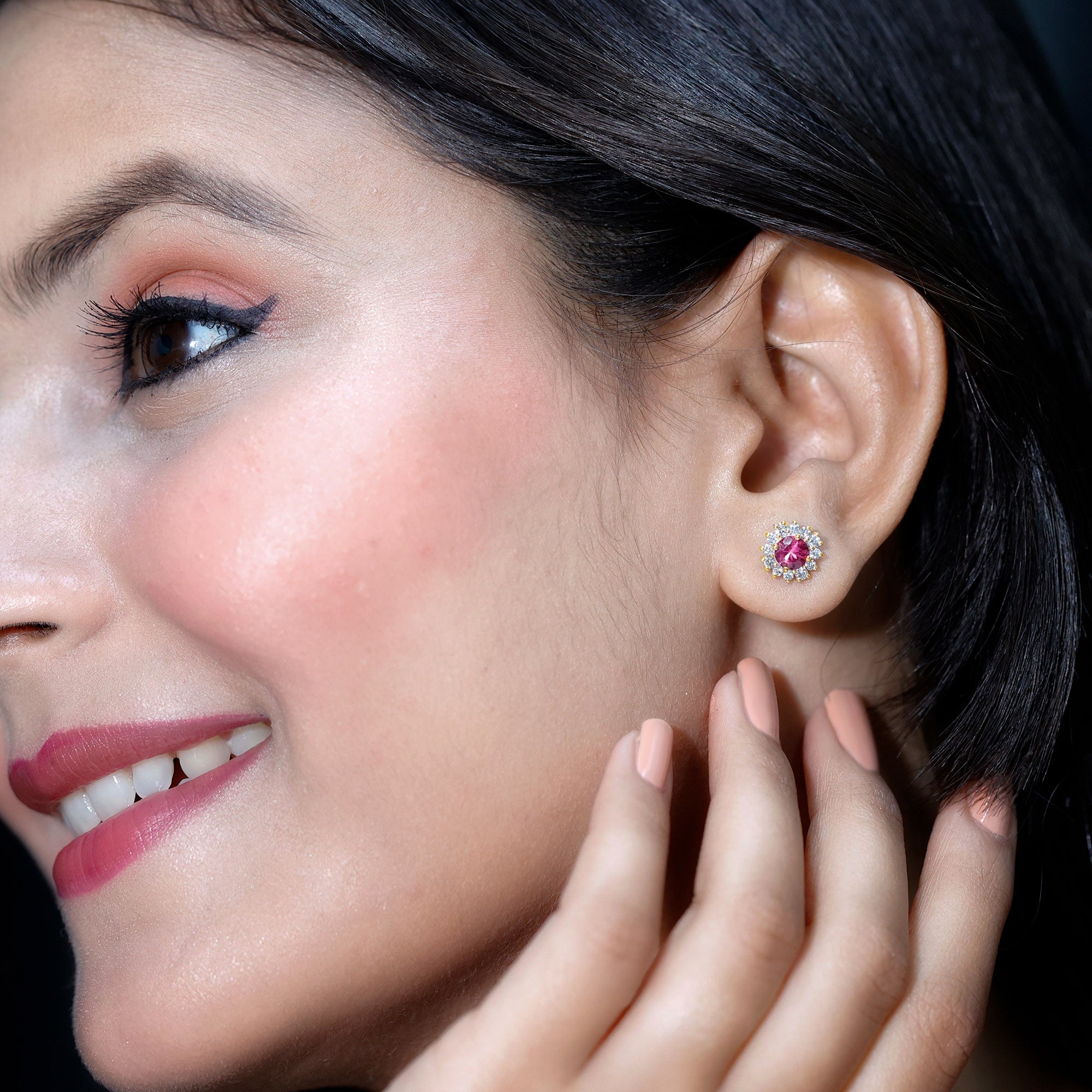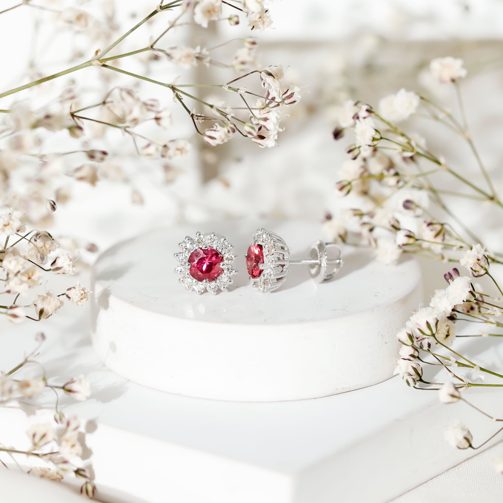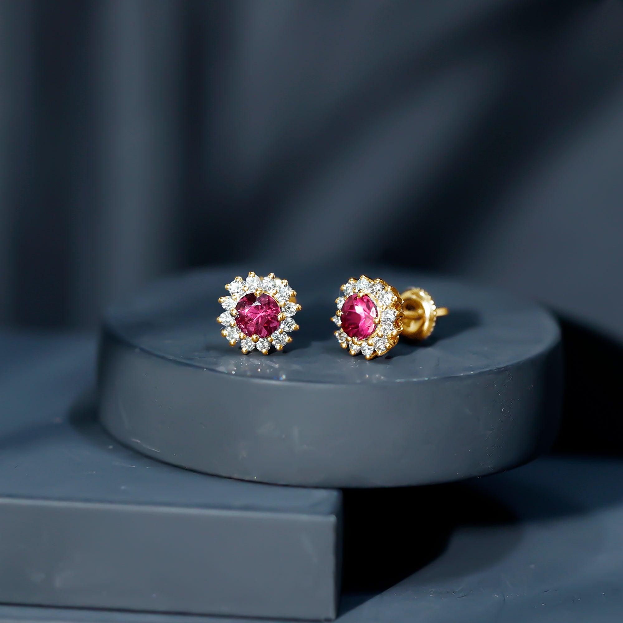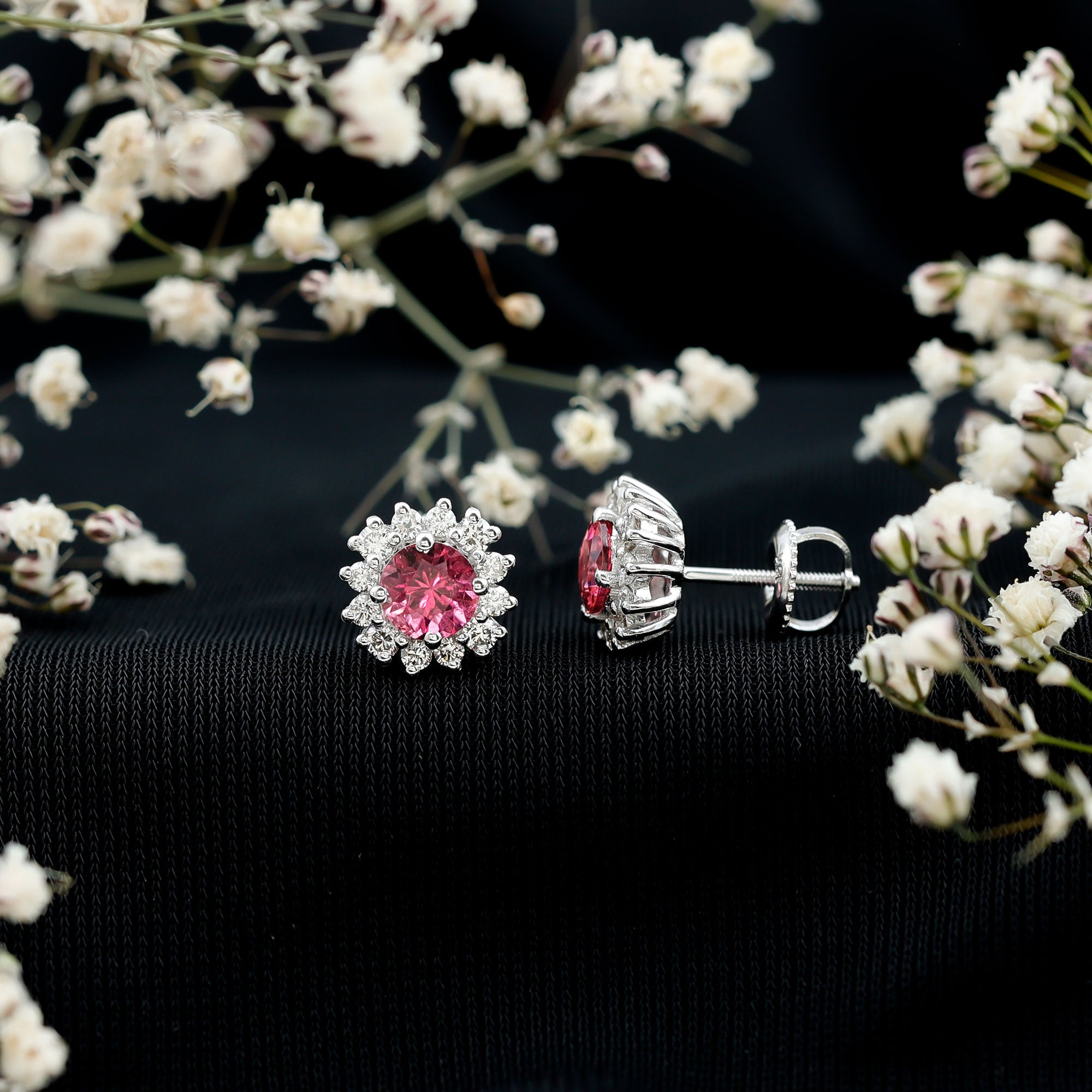 A Celebration without Gift is Incomplete, a Gift of Jewelry will bring smiles of delight on Mothers Day. Explore these Stud Earrings adorned with Round Shape Pink Tourmaline in Prong Setting with Halo Diamond, crafted in Solid Gold Metal.