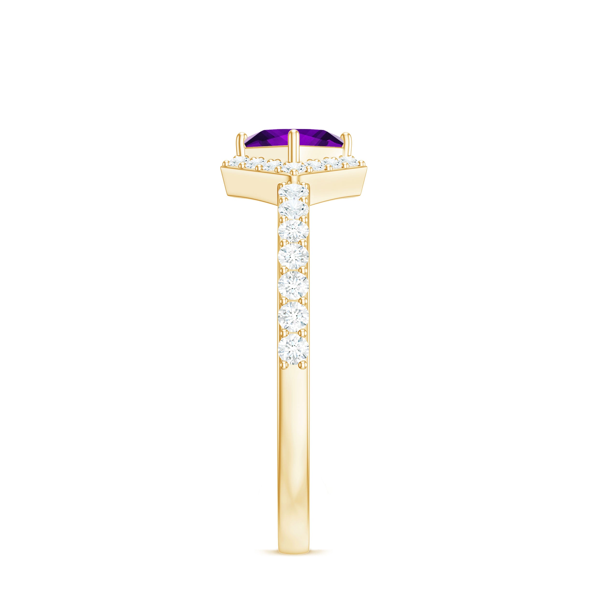 Buy this eye-catching Half Halo Promise Ring for your lady love. An embroidered diagonal set of princess cut Amethysts are set in the center, with round Diamond stones in a half halo and on the shank. Suitable for February-born women, this gold Metal Amethyst Promise Ring is made of gold metal.