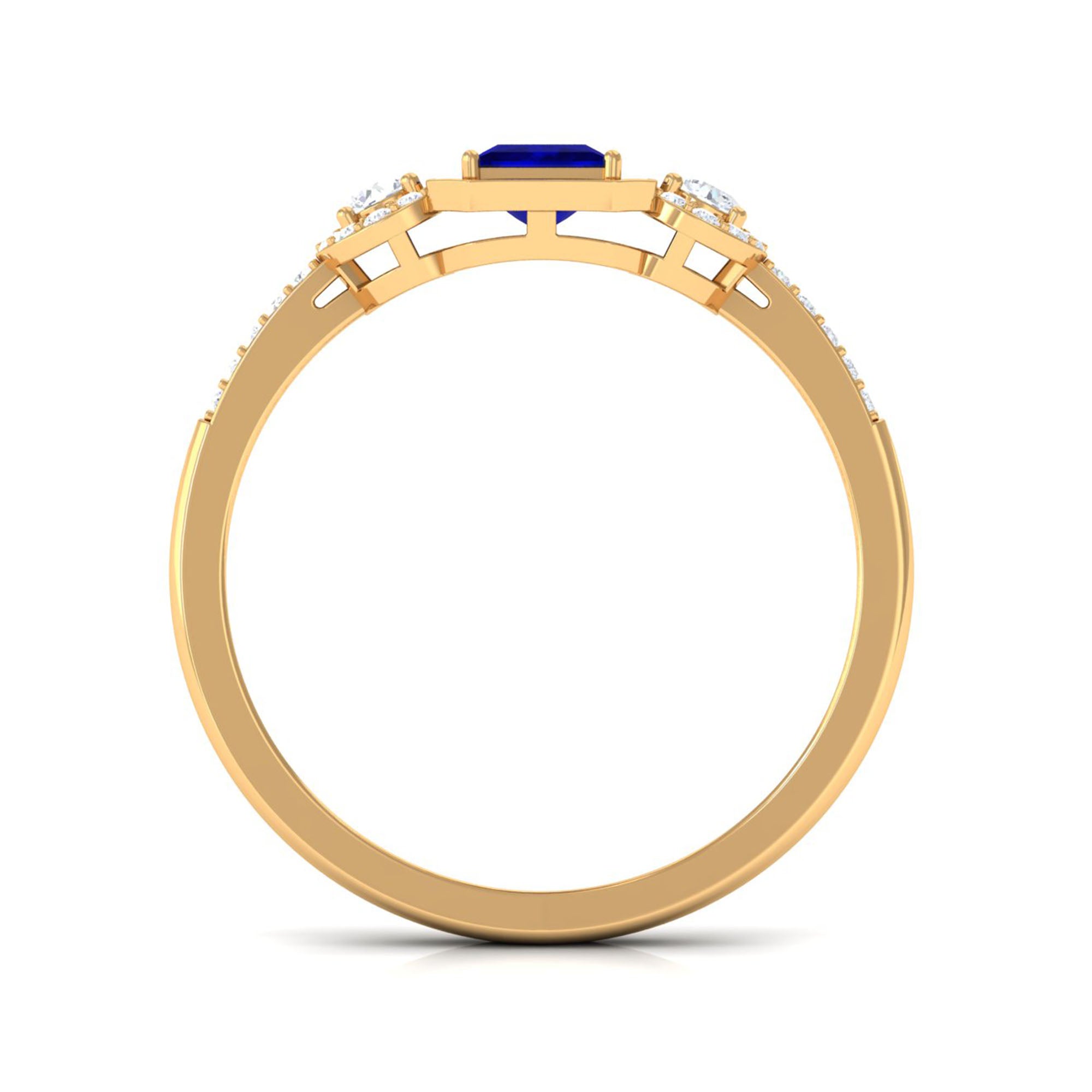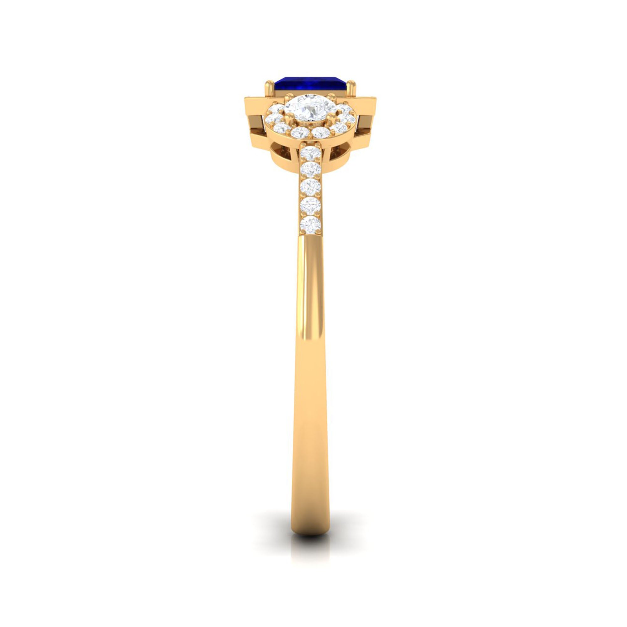A perfect masterpiece of love and romance between you too, this Blue Sapphire Engagement Ring is embellished with Diamond Halo. The Princess Cut Blue Sapphire is held in Prong Setting and Diamond flanked on both side accentuates its beauty. This Blue Sapphire and Diamond Ring will add effortless grace and charm to your look