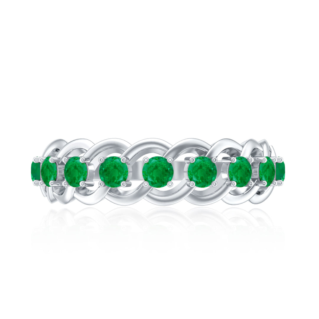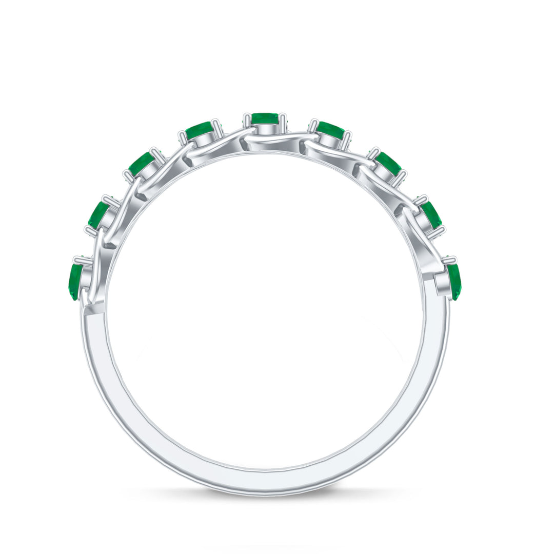 Weave your love into something extraordinary with this Half Eternity Band, a ring that beautifully blends timeless elegance with intricate design. The enchanting Braided pattern, crafted with perfection, creates a unique sense of movement and depth, symbolizing the twists and turns of a love that only grows stronger. The vibrant Emerald stones are carefully placed over the braided band, their rich green hue a perfect reflection of enduring strength of your bond. This Braided Ring captures the essence of love that is constantly evolving while remaining deeply rooted in tradition. Its elegant design adds just the right touch of sophistication, making this Emerald Band Ring the perfect choice for an anniversary, milestone or any occasion that celebrates your unique journey together. Whether worn alone or stacked with other bands, this Emerald Anniversary Ring is a timeless reminder of the love you share, radiant and unbreakable. Presented in a signature jewelry box and available in various sizes, this Fine Band is ready to accompany you on your journey of forever.