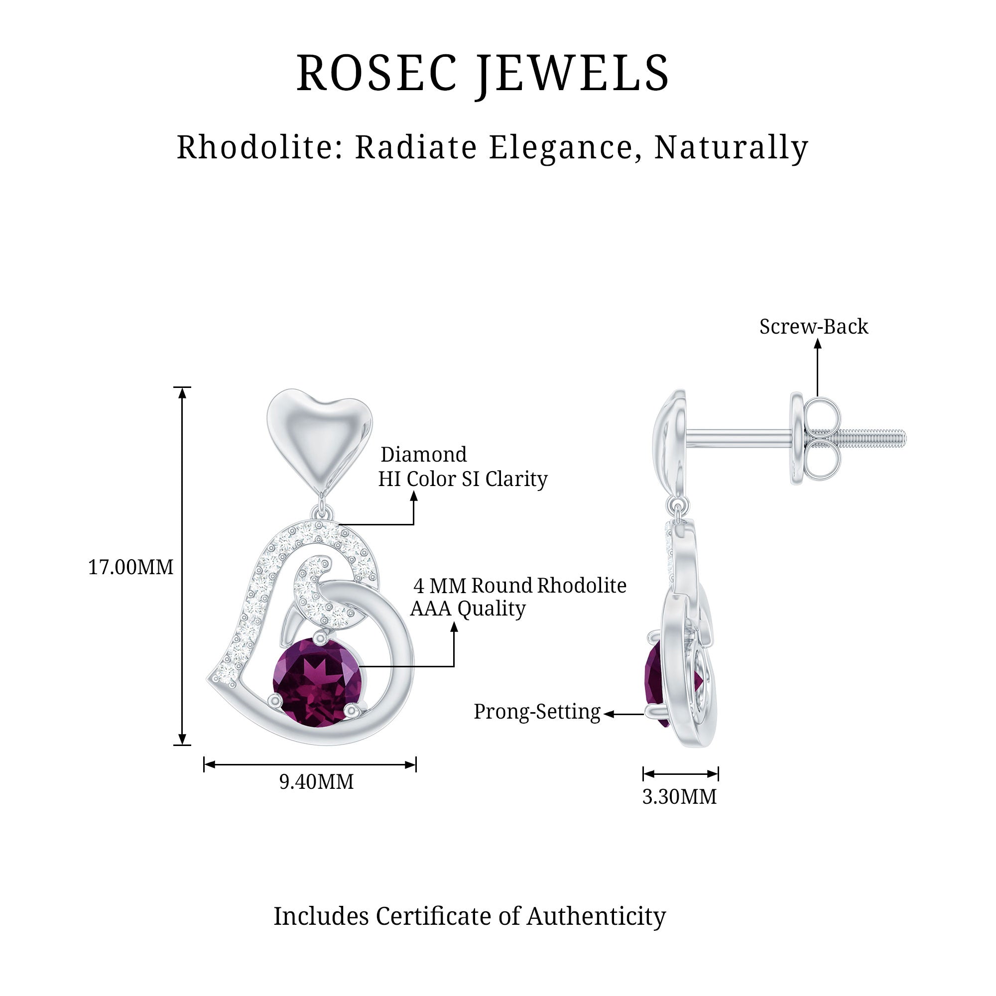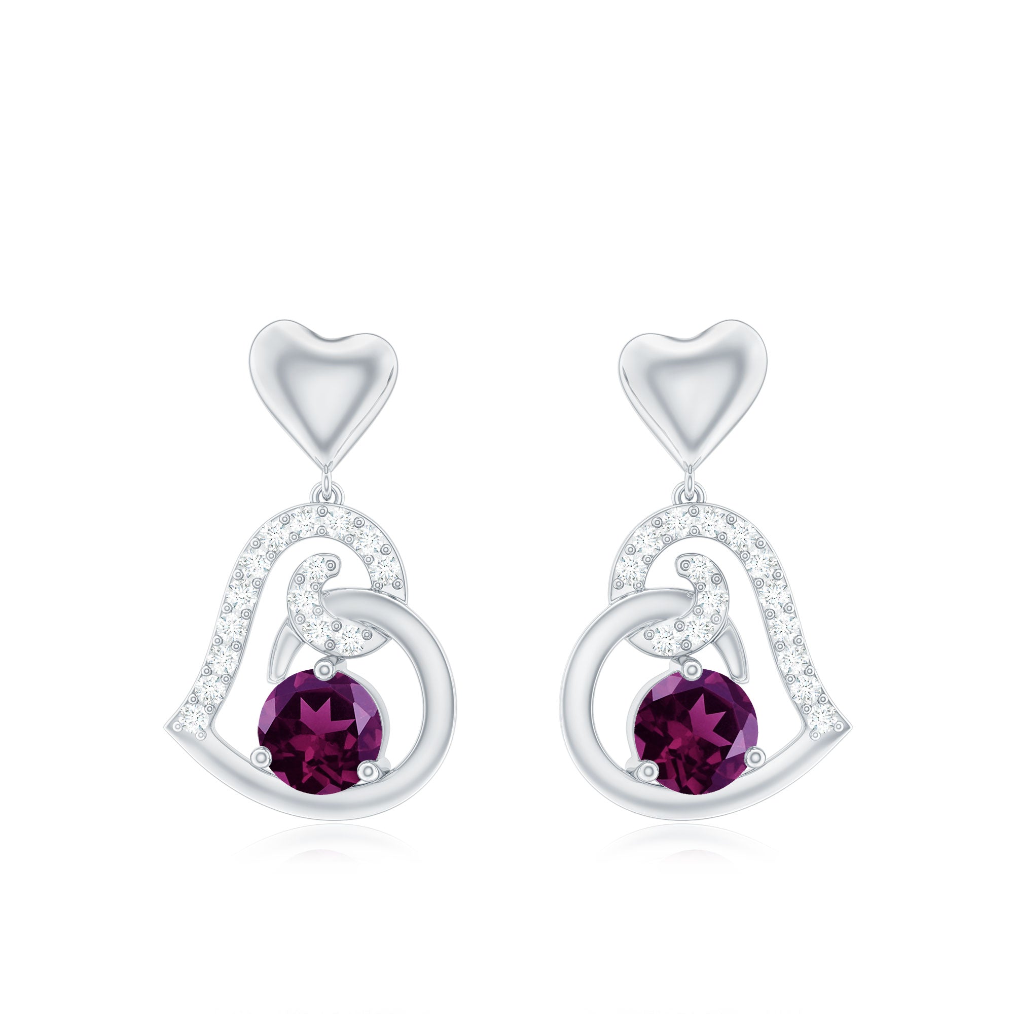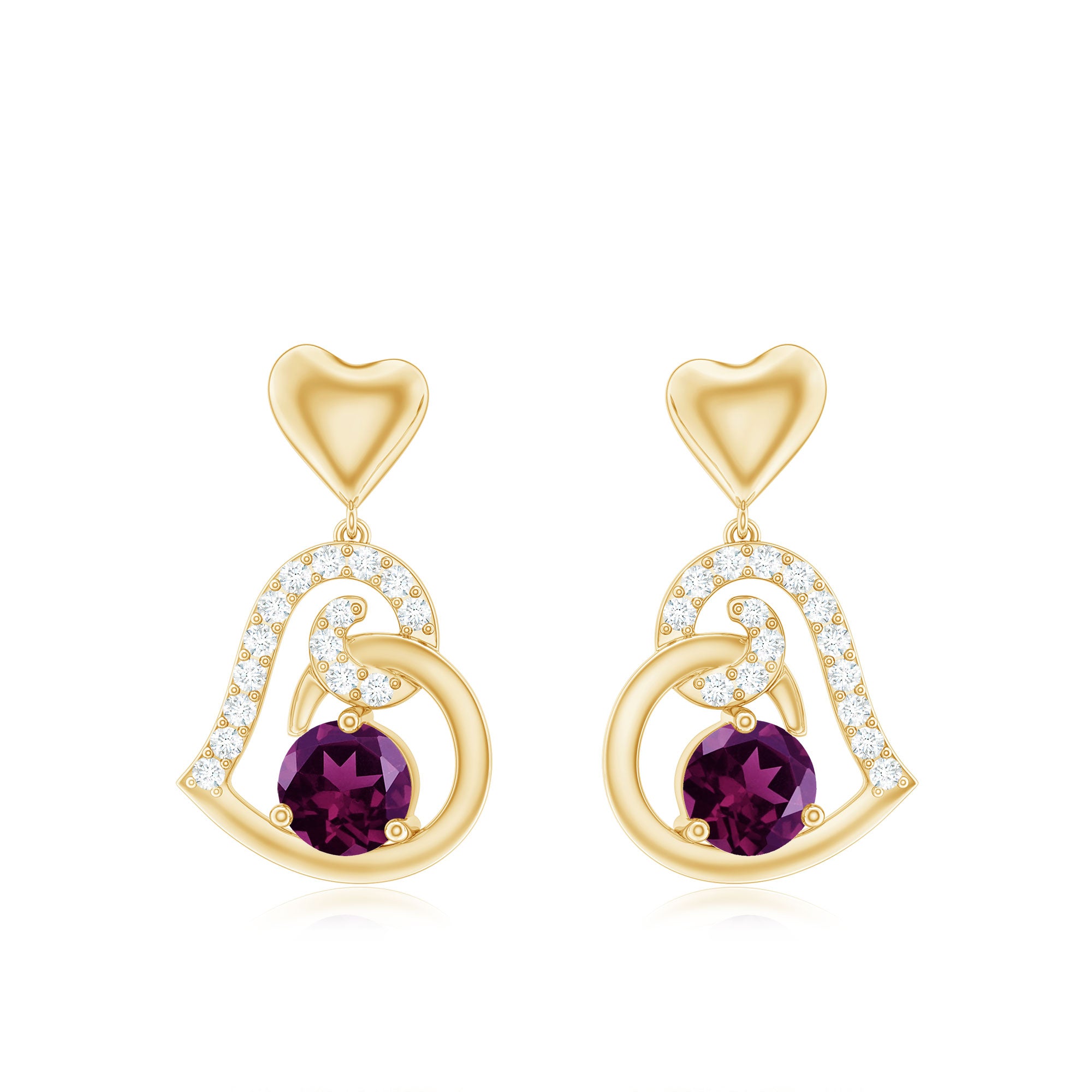 Be Dazzle with these beautiful Heart Drop Earrings embellished with Round Shape Rhodolite as Solitaire in 3 Prong Setting and Round Shape Diamond in Prong Setting, Crafted in Solid Gold.