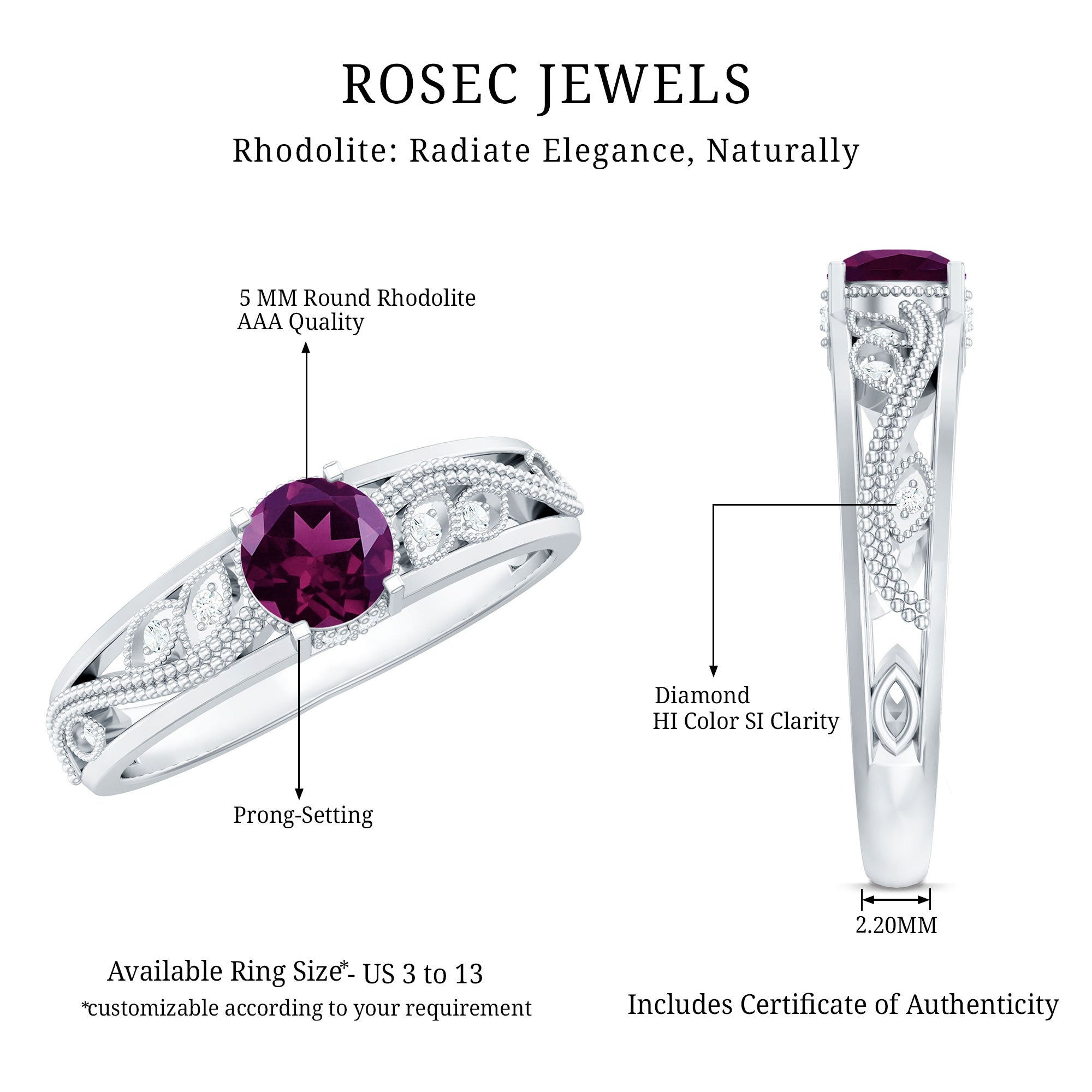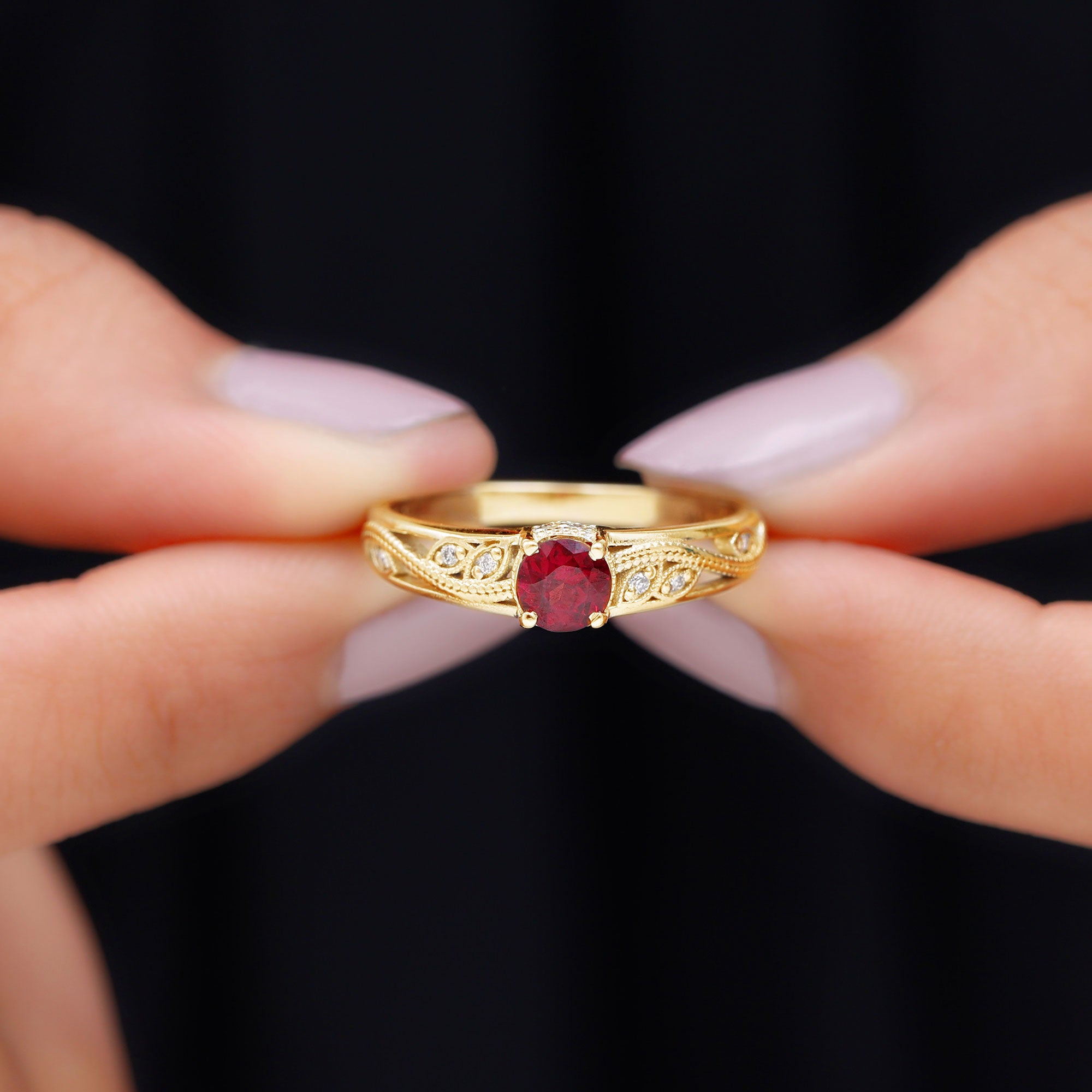 A Phenomenal and Classic Wedding Gold Ring is adorned with 5 MM Round Shaped Rhodolite is set in the center and small Round Shape Diamond enhance the beauty of shank. Solitaire Engagement Ring is composed of Gold. Minimalist Beaded Engraved design ring is a perfect anniversary gift for your partner.
