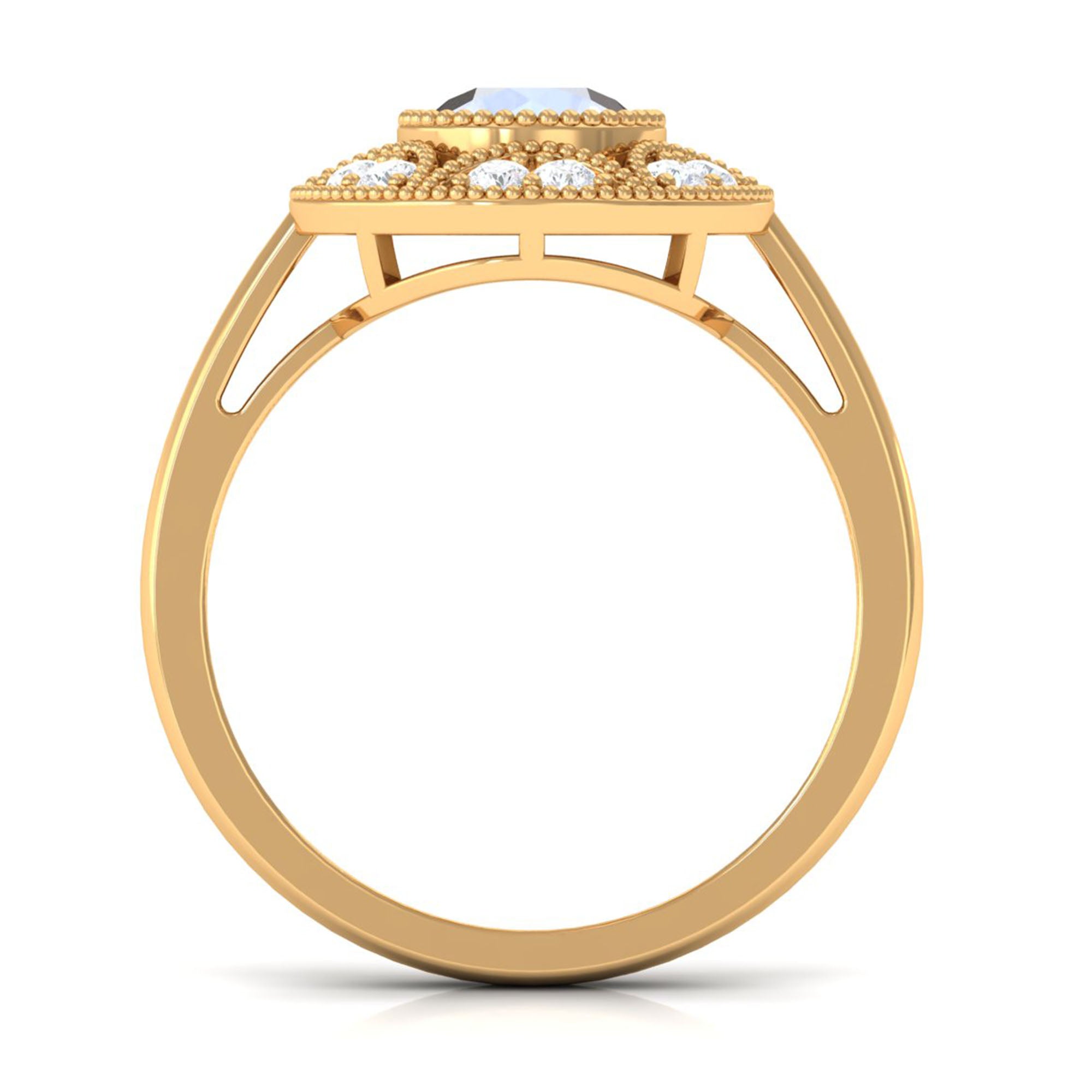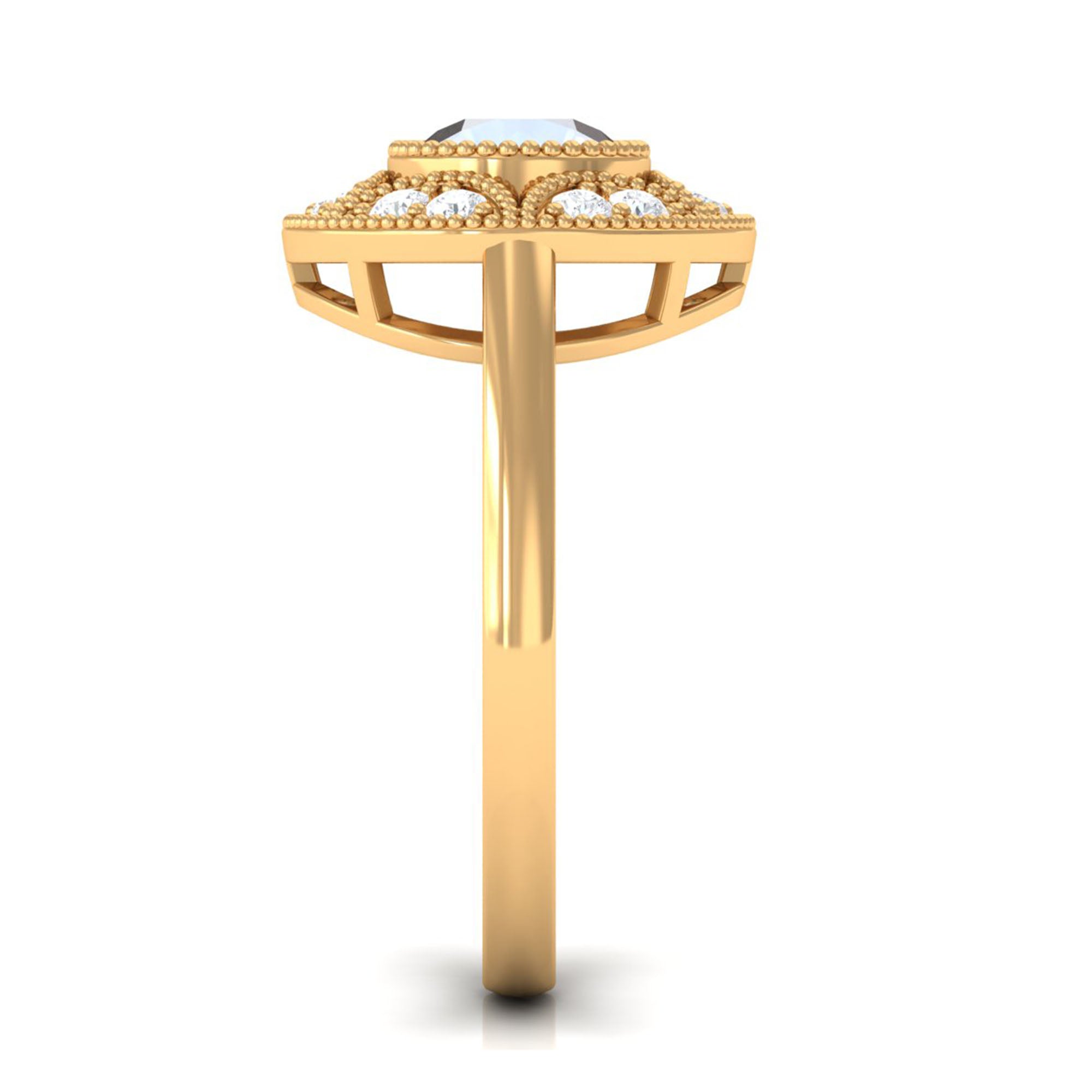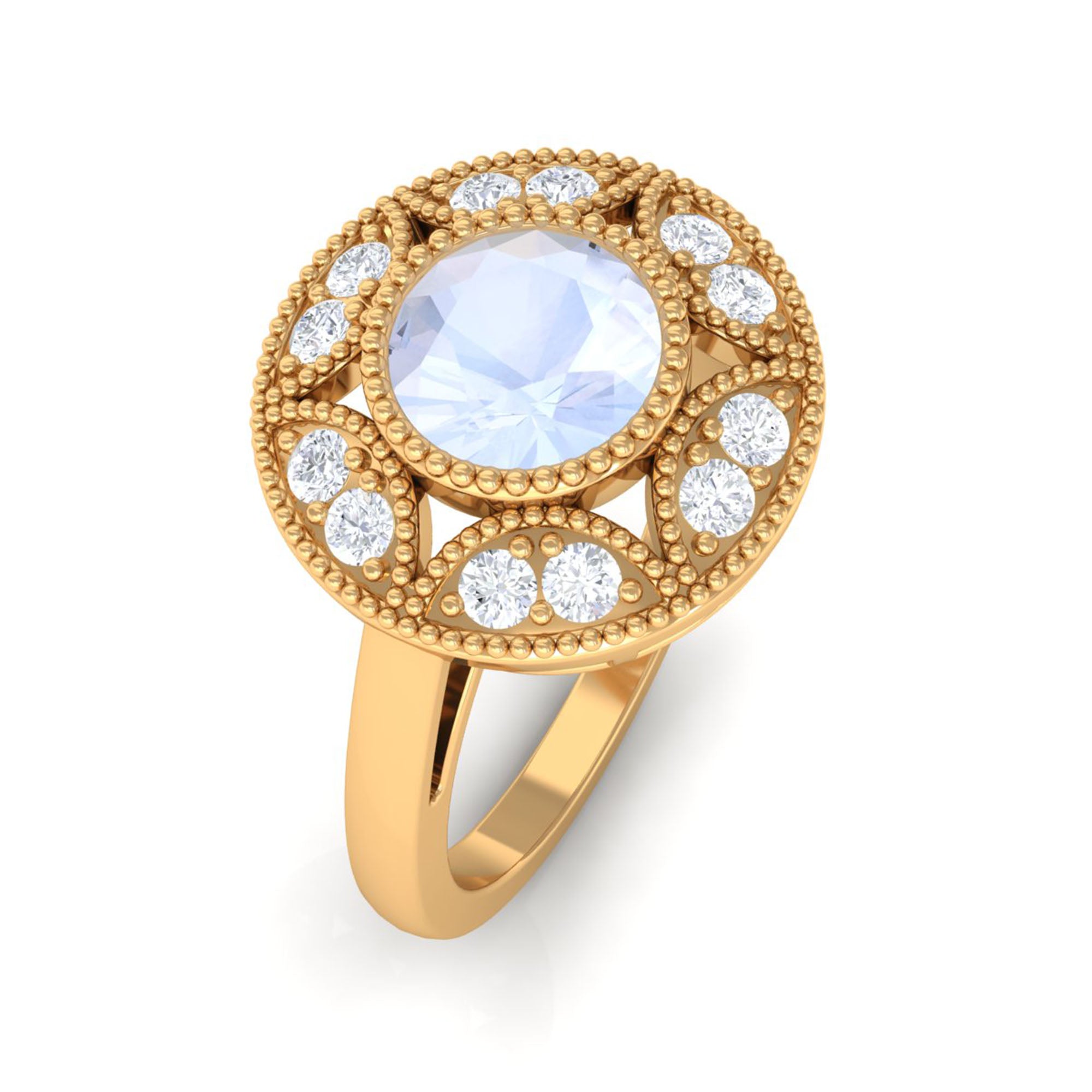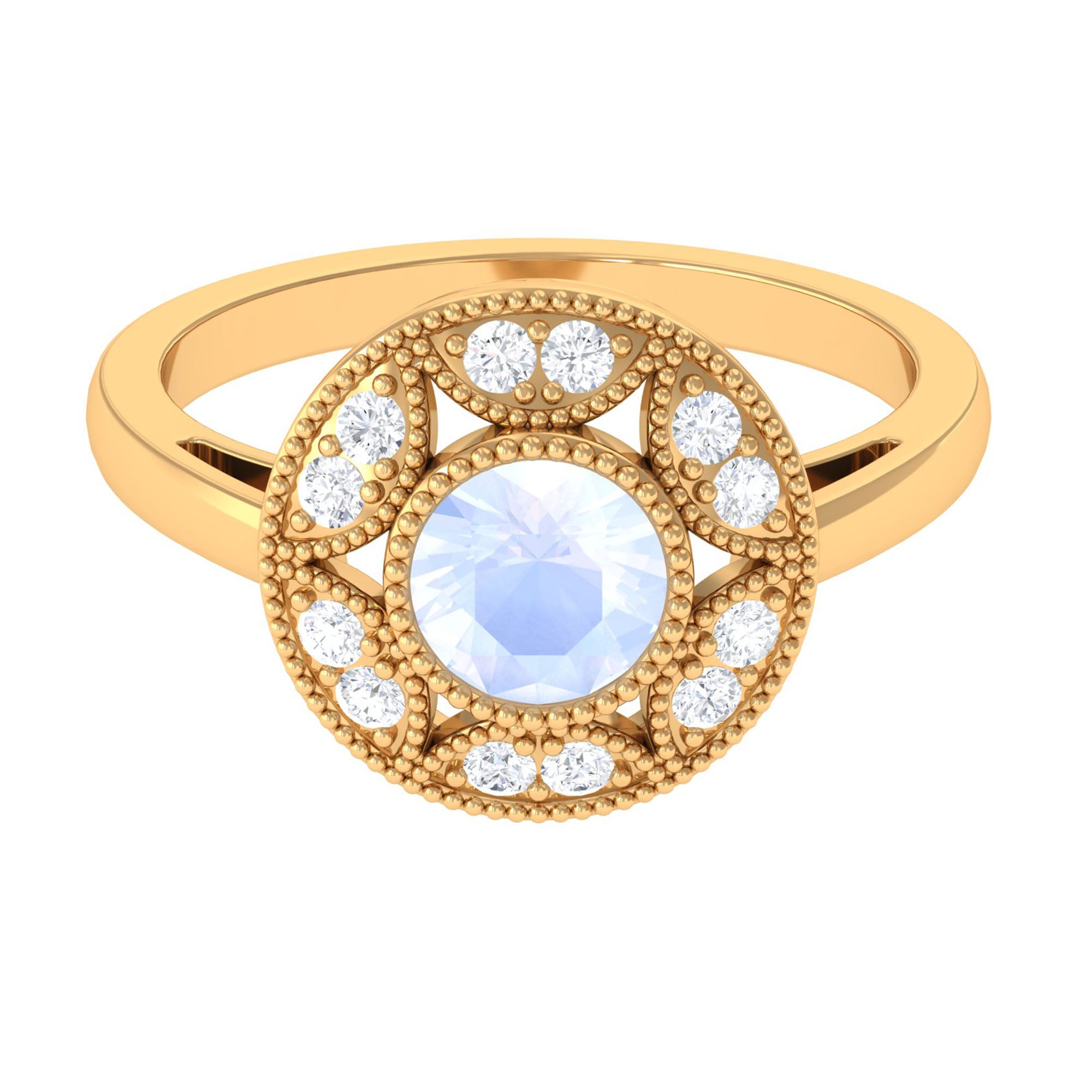 Start your journey of Love with this Beautiful Moonstone Engagement Ring. It is embellished with Round Shape Moonstone in beaded bezel setting set in the center with Diamond accent all around. This Vintage Engagement Ring is crafted in Gold to make it a piece of women Fine Jewelry. Buy this enchanting Moonstone Gold Engagement Ring for the love of your life and make her eyes glitter.