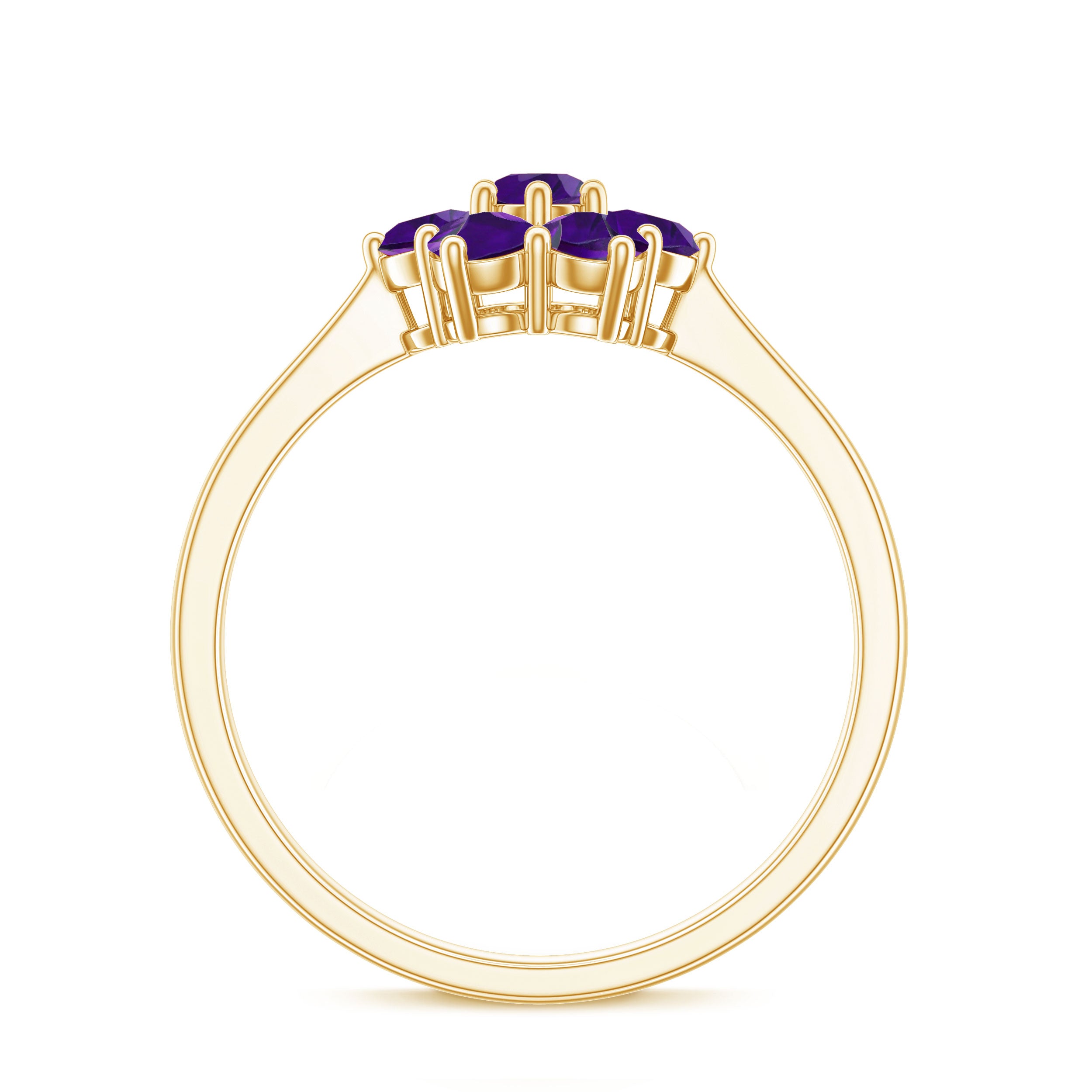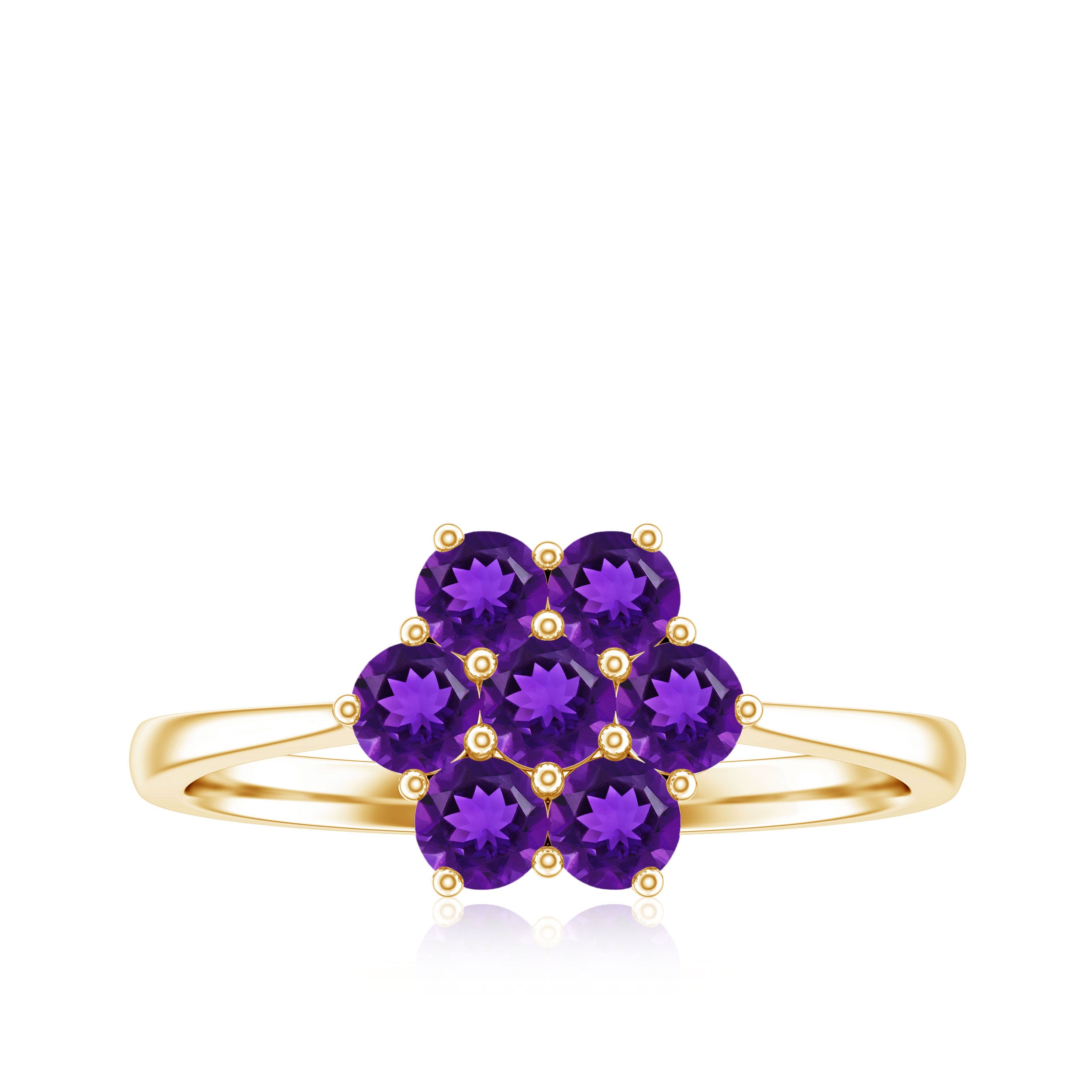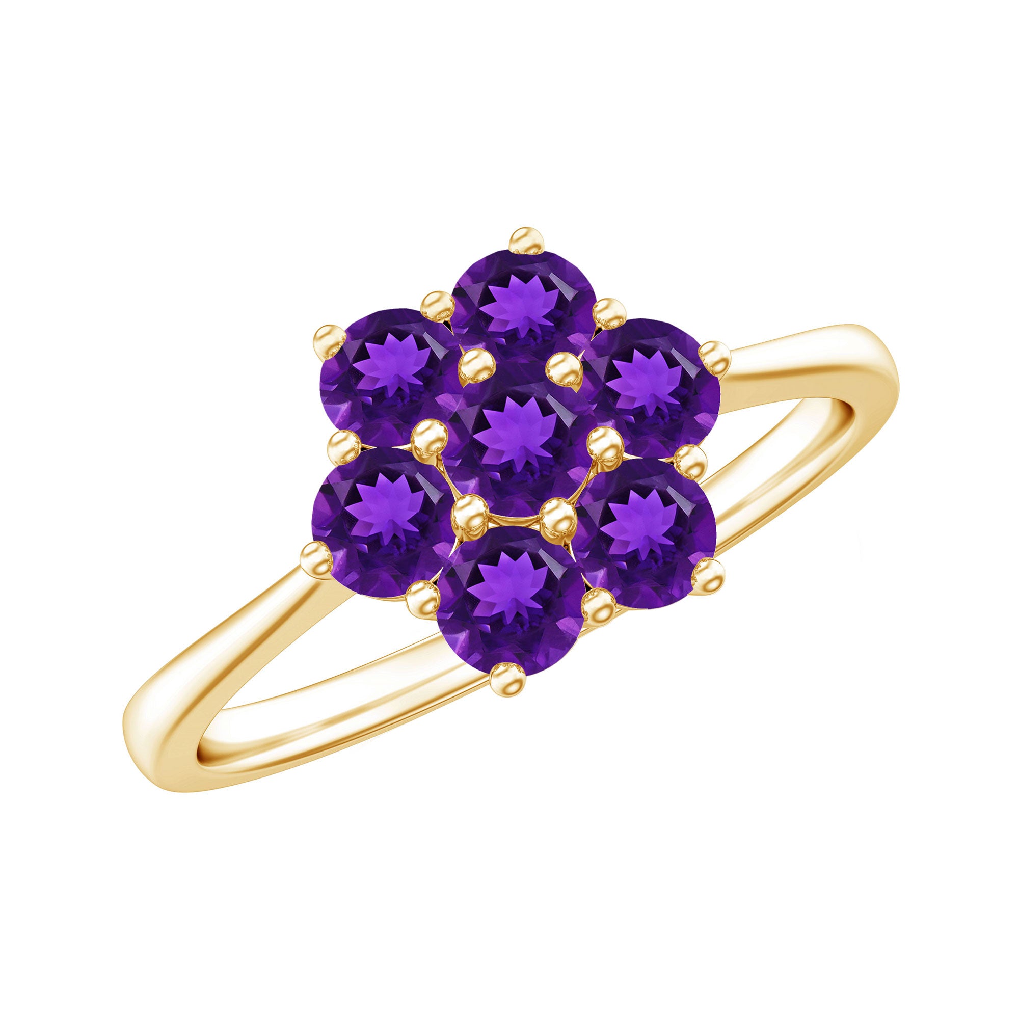 A Simple but Classic Flower Ring are embellished with Round Shape Amethyst is beautifully studded in the cluster prong setting. This stunning floral design enhances the beauty of the ring is composed of Solid Gold.