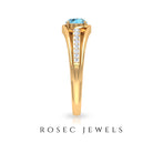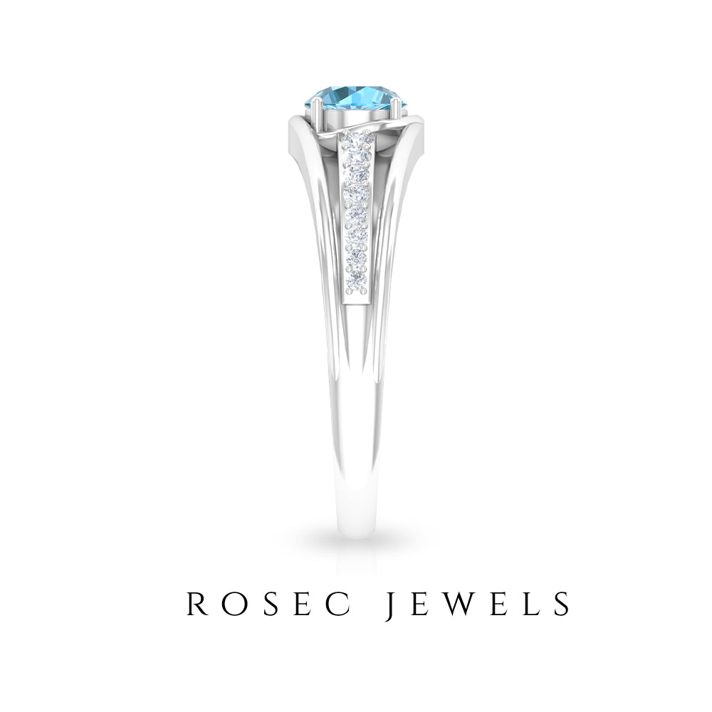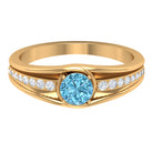 Classic Solitaire Ring For Women is set with Precious Round Shape Swiss Blue Topaz as Solitaire and Round Shape Diamond set as Side Stones in Prong Setting. This Gold Solitaire Ring is crafted in Solid Gold.