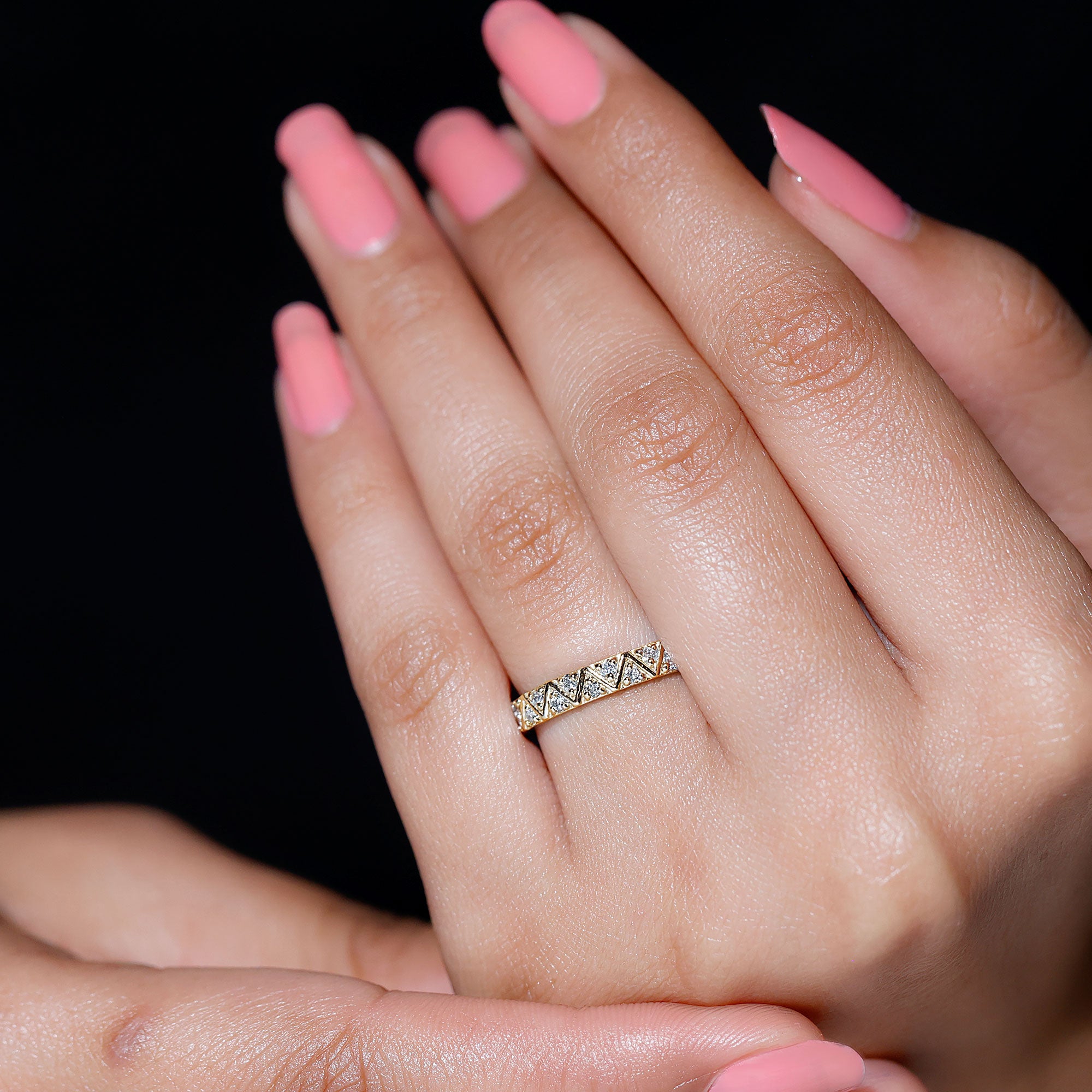 Unleash a cascade of brilliance with this Diamond Band Ring, a timeless testament to unwavering elegance. It is a stunning design featuring an unbroken circle of meticulously crafted Round Brilliant Cut Diamond in Surface Prong Setting with its inherent fire and sparkle. Crafted with exceptional precision, this Eternity Wedding Band serves as the perfect complement to the continuous line of diamonds that is a versatile masterpiece for the most special occasions. As a continuous line of unbroken symbols, this Diamond Wedding Ring is a timeless reminder of moments that endure. As a tangible expression of moments cherished and memories made, it is a celebration of everlasting allure, a whisper of luxury, and a luminous symbol of enduring beauty. Stack it with other rings or let it shine solo, its adaptable beauty is truly captivating. Crafted with exceptional care, this Diamond Eternity Ring is a testament to the promises you hold dear, a glittering reminder of love that shines brightly and forever.