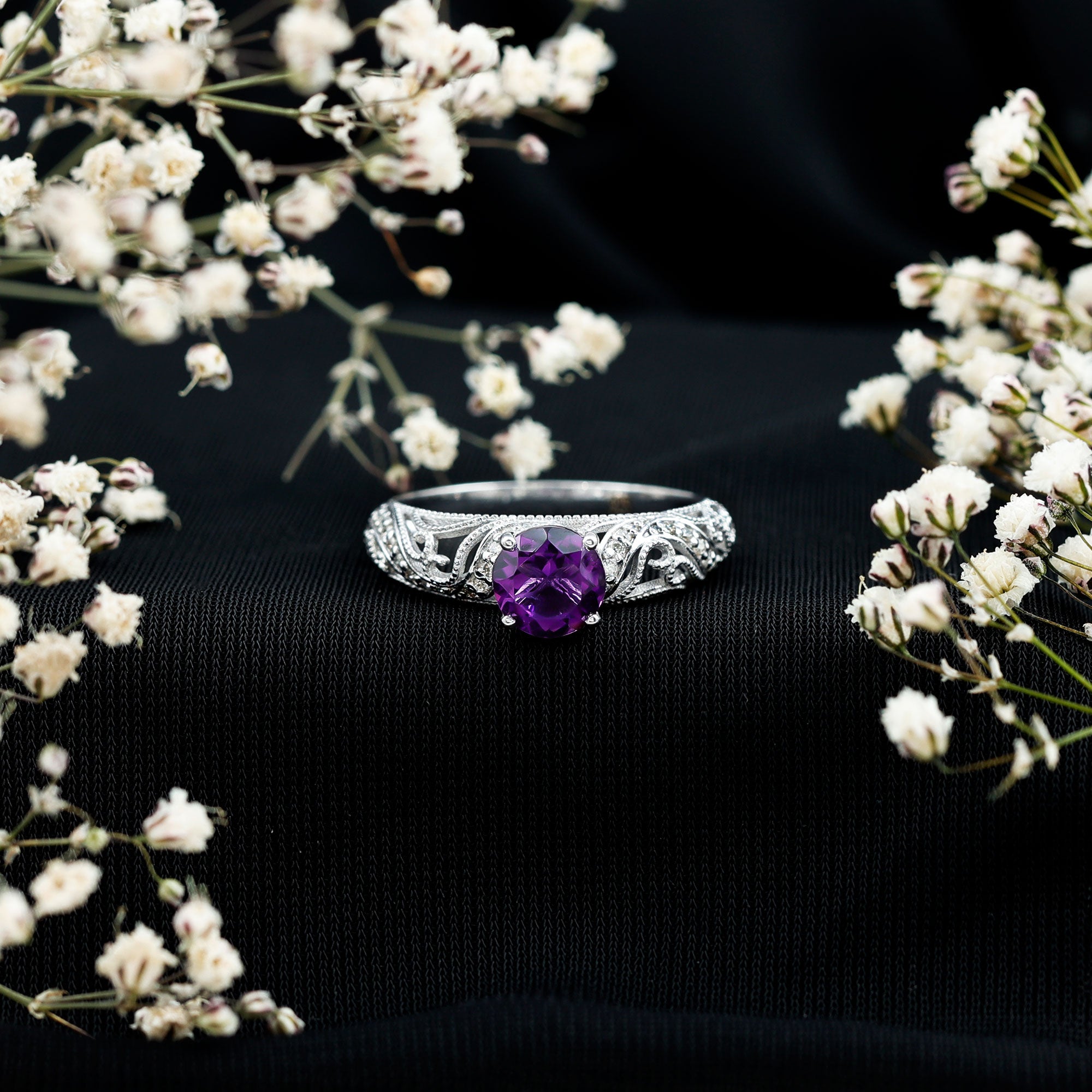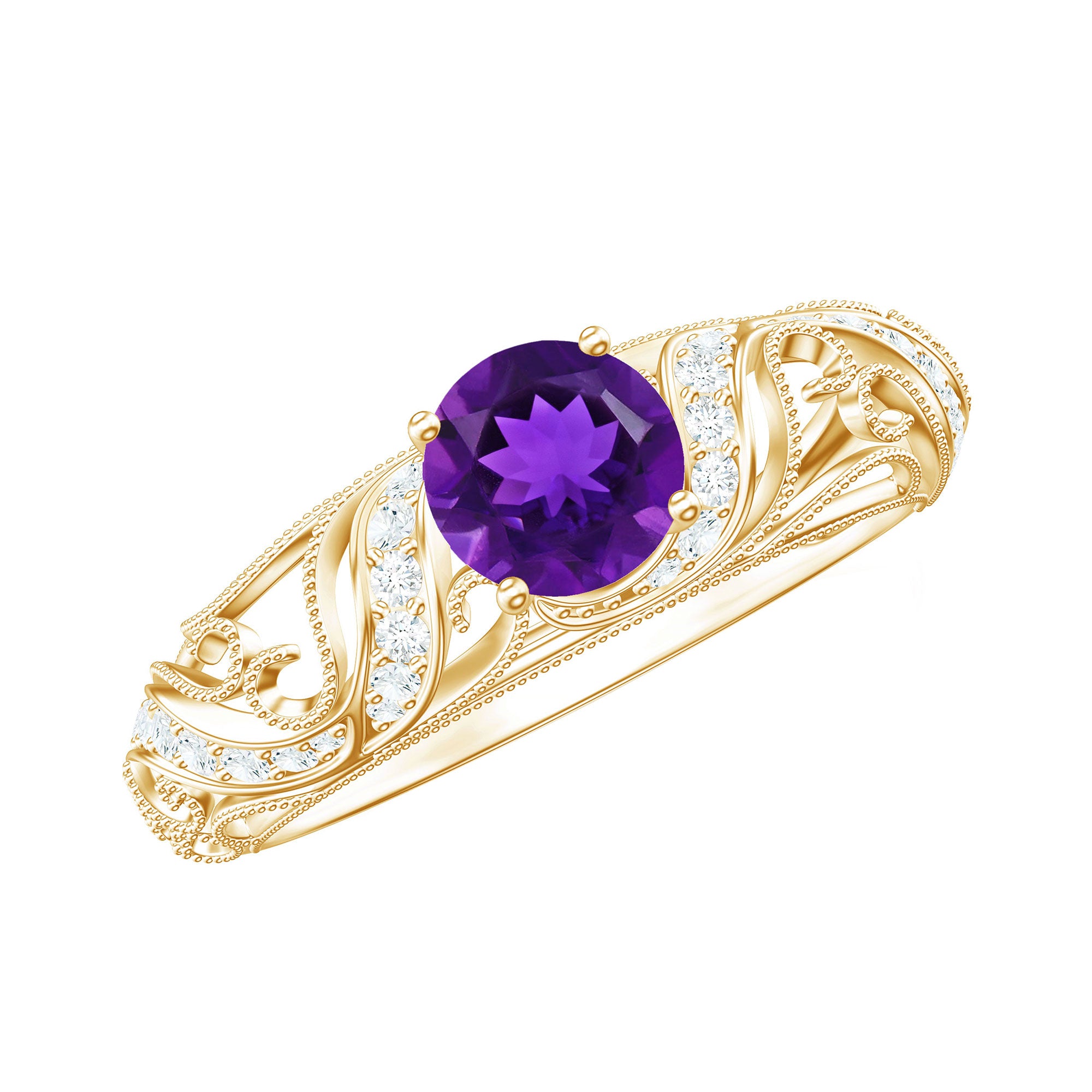 The brightness of Amethyst makes this vintage engagement ring more appealing. The Amethyst Ring is embellished with Round Diamond, glistening on the shank beautifully. The Amethyst Diamond Engagement Ring is accentuated with Beaded detailing, make your significant feel more precious with this Amethyst Ring.