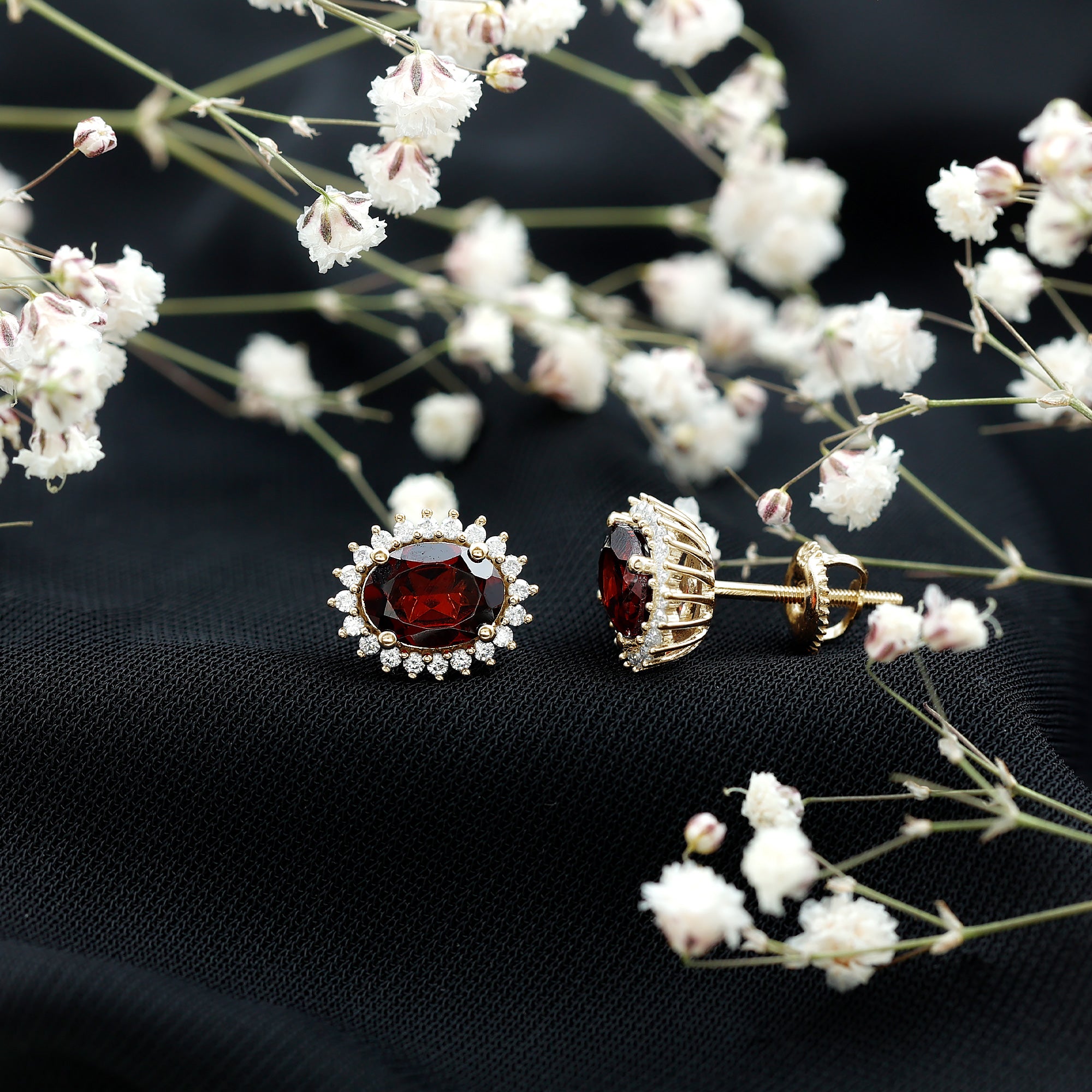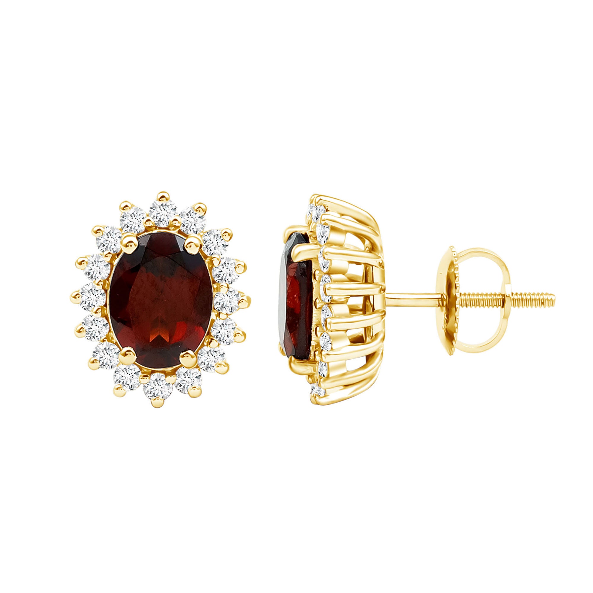 Surprise her on your anniversary with this Lovely and Classic Oval Shape Garnet Stud Earring. The centerpiece of this stunning earring is a Solitaire Oval Shape Garnet Gemstone set in a prong setting, encircled by Round Shape Moissanite as halo. Crafted in Gold, this Solitaire Gemstone Stud Earring is sure to make her heart skip a beat.
