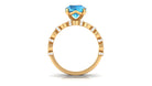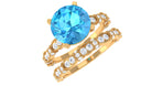 It is a Wedding and Engagement Ring Set for Women, adorned in Gold and features a Round Cut Swiss Blue Topaz embellished in Prong Setting with Round Brilliant Moissanite embellished in Prong Setting.