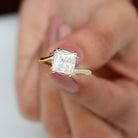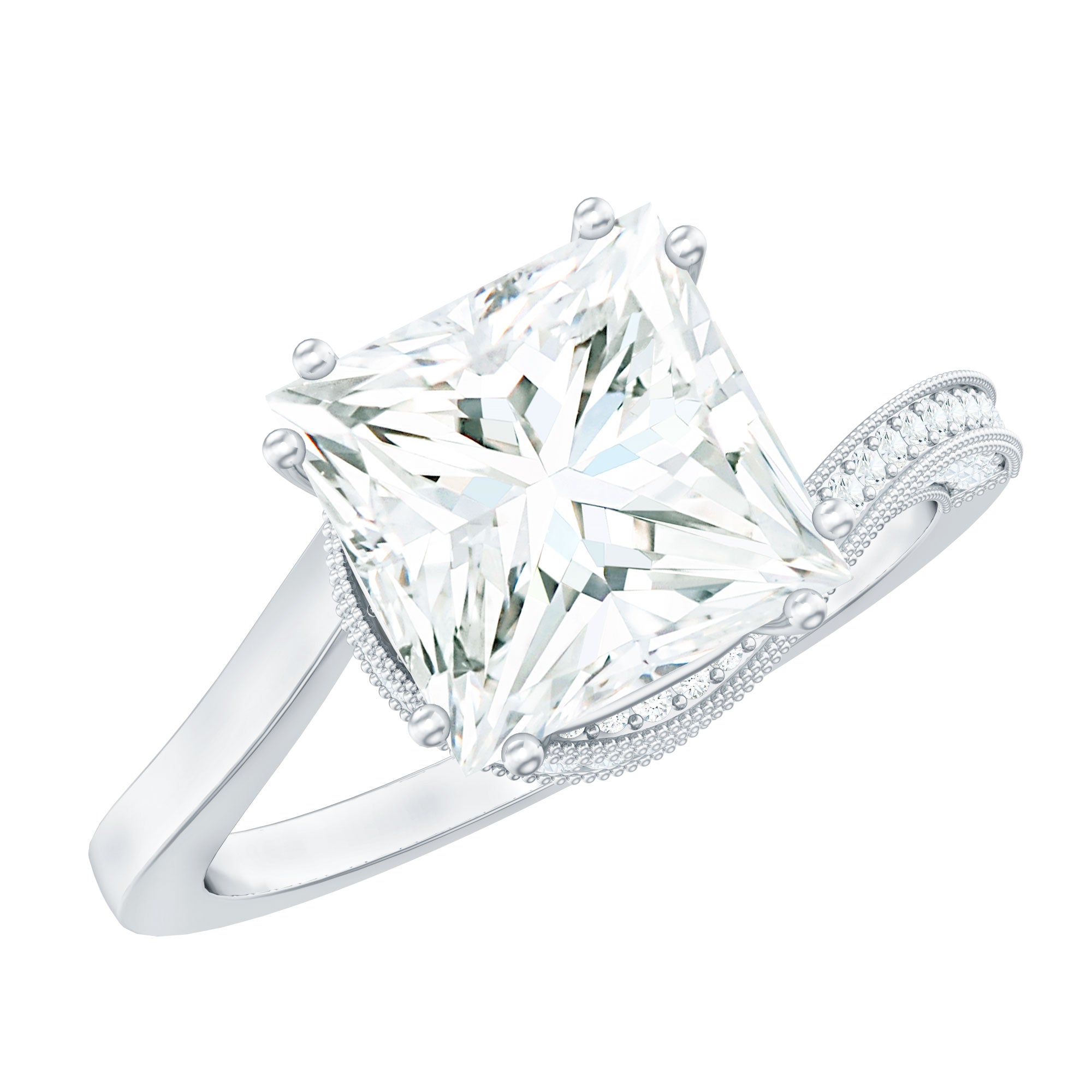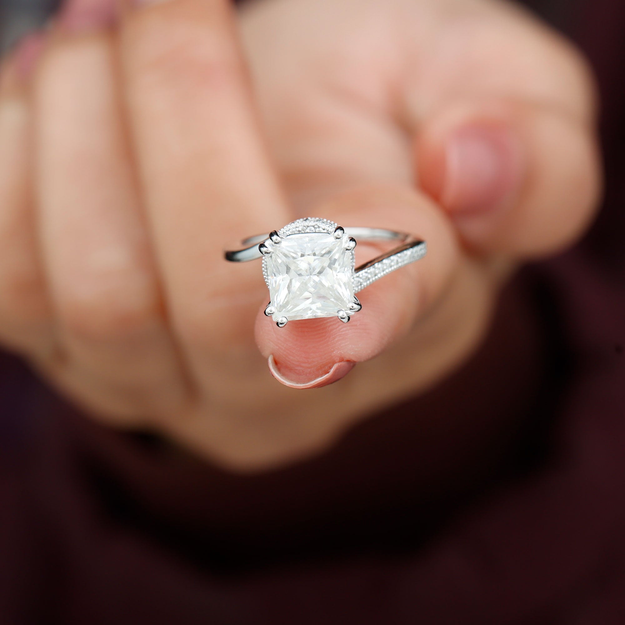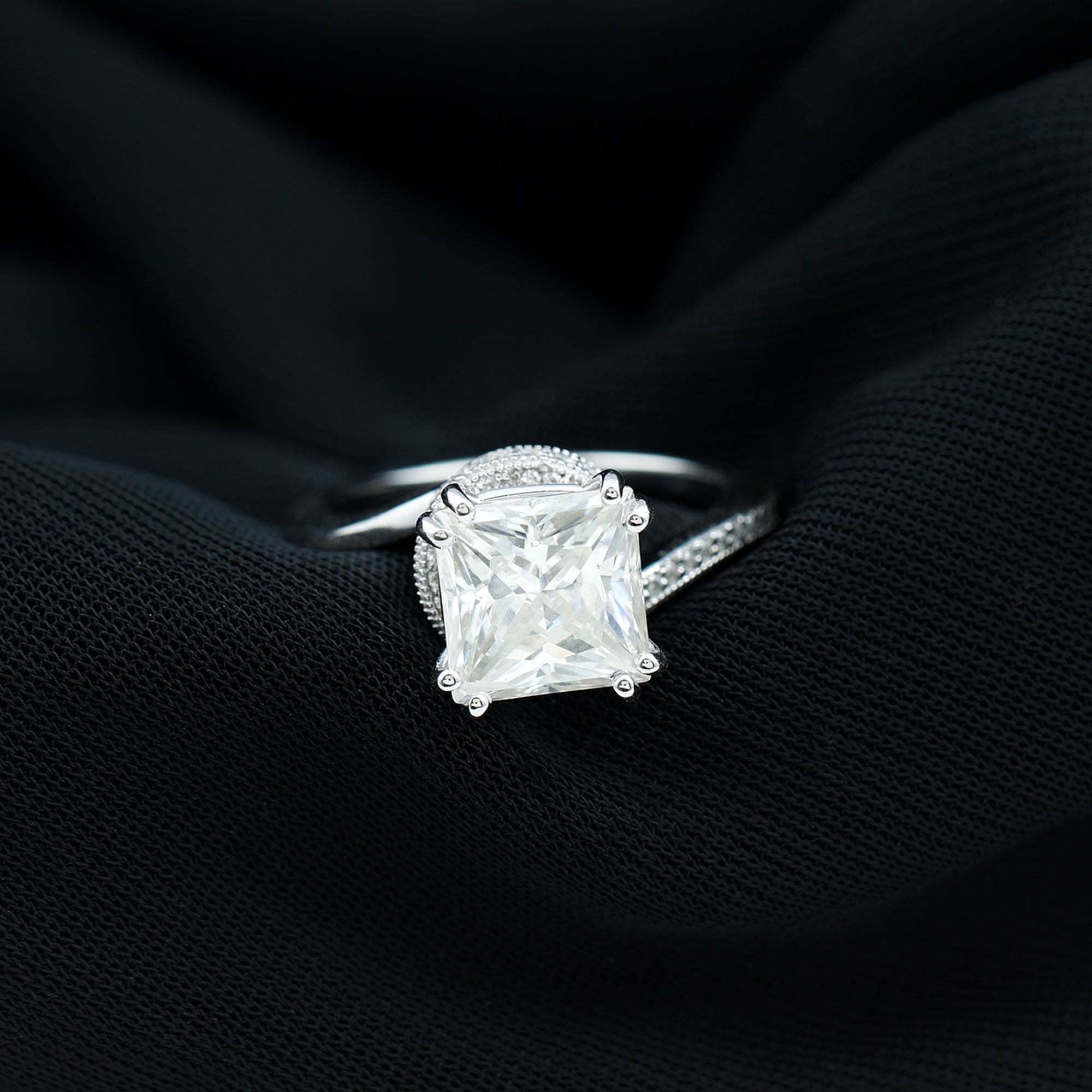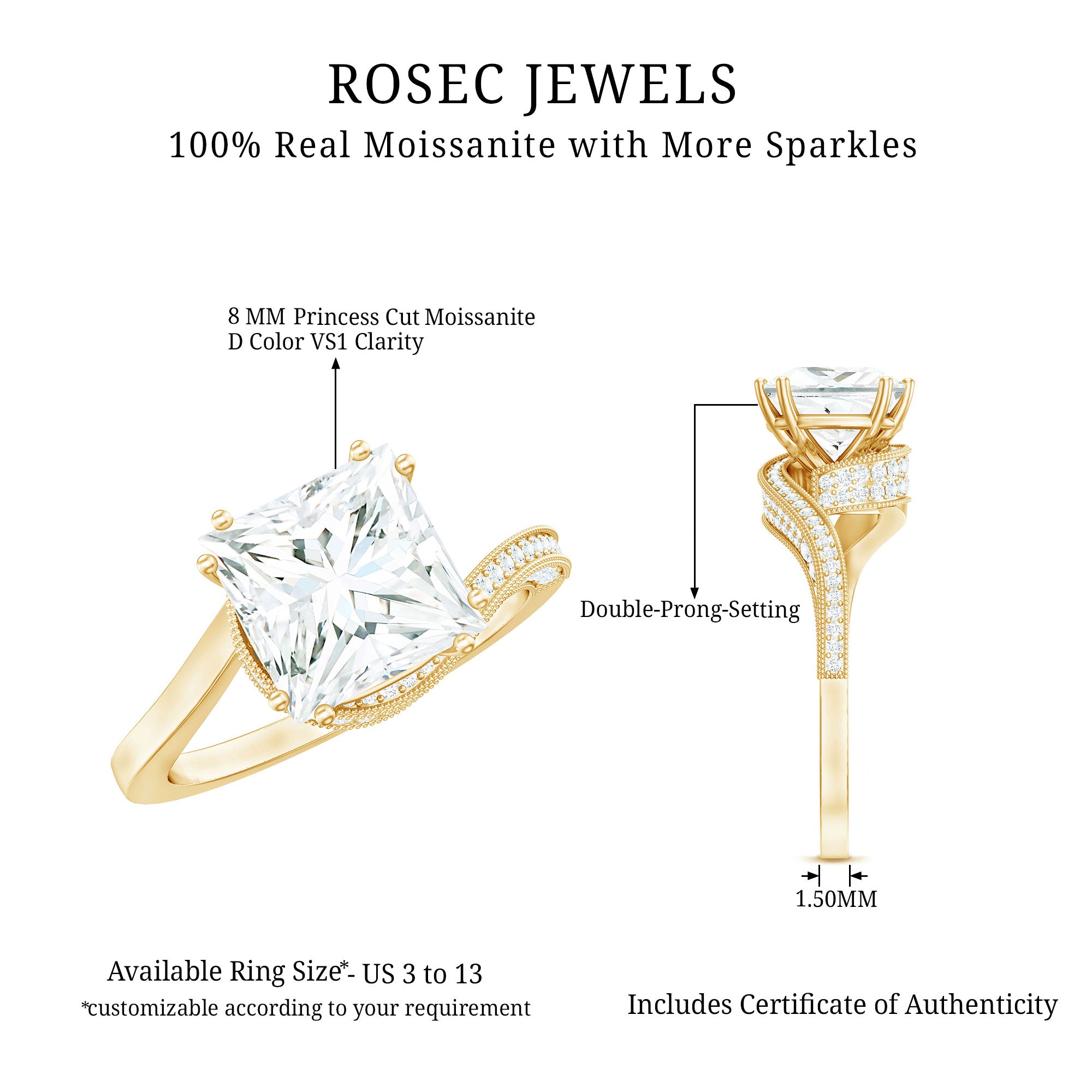 Bold in brilliance and rich in detail, this Princess Cut Moissanite Engagement Ring is where modern edge meets vintage charm. At the heart of this captivating Designer Ring lies a radiant 8 MM princess cut moissanite, known for its sharp symmetry and unmatched sparkle. Cradled in secure double prong setting, the center stone sparkles with its D color and VS1 clarity grade, drawing all eyes to its brilliance. What makes this 3 Carat Moissanite Ring truly unique is its elegant bypass shank, a graceful twist that symbolizes two paths coming together as one. Adorned with a row of shimmering round cut moissanites, the band glistens with every movement while adding a sense of flow and harmony to the design. Intricate milgrain detailing lines the edges of the band, giving a nod to vintage artistry and adding delicate texture to the sleek, polished finish. This Bypass Engagement Ring is not just a symbol of commitment, it is a work of art, designed for someone who appreciates timeless beauty with a modern twist. Ideal for a proposal that deserves nothing less than unforgettable.