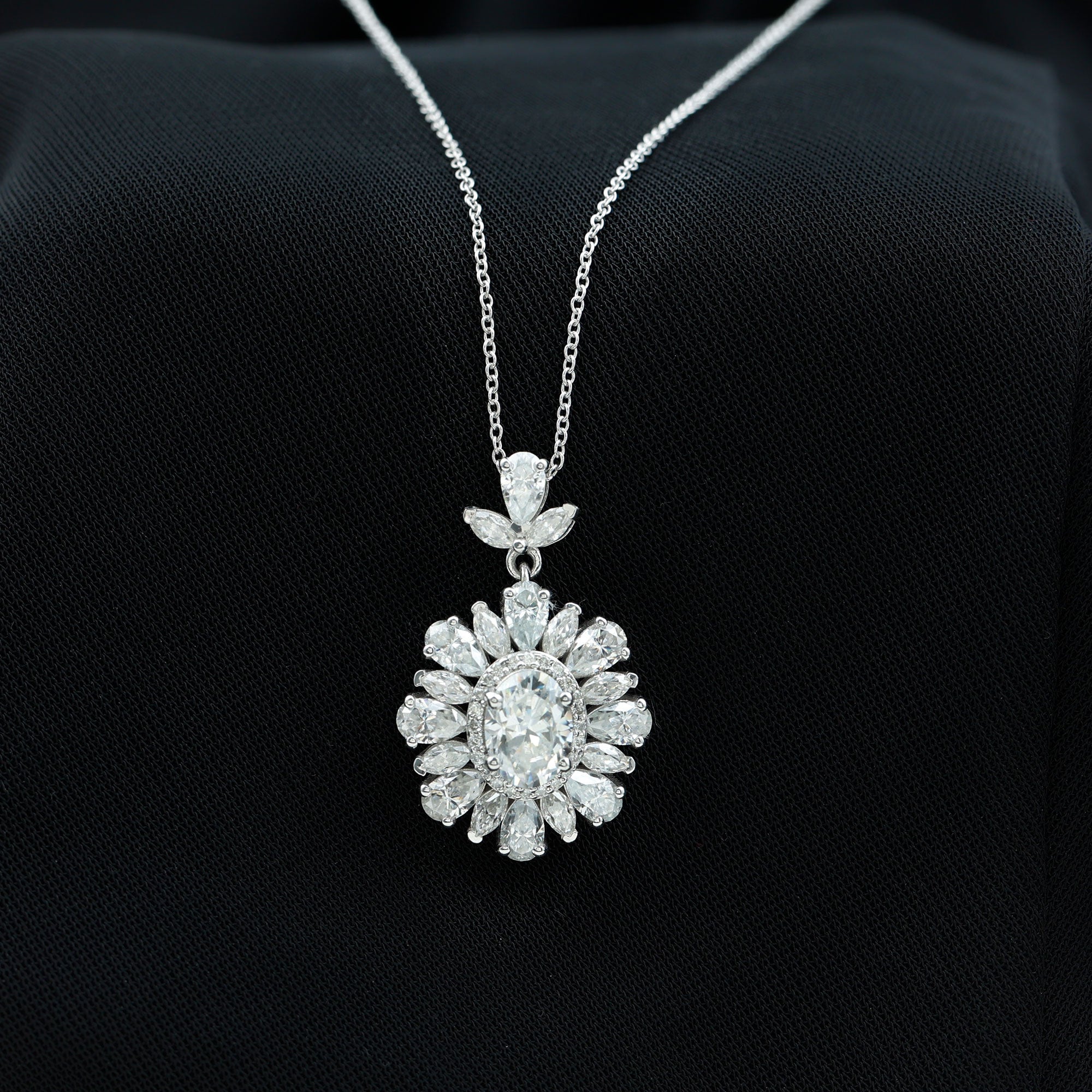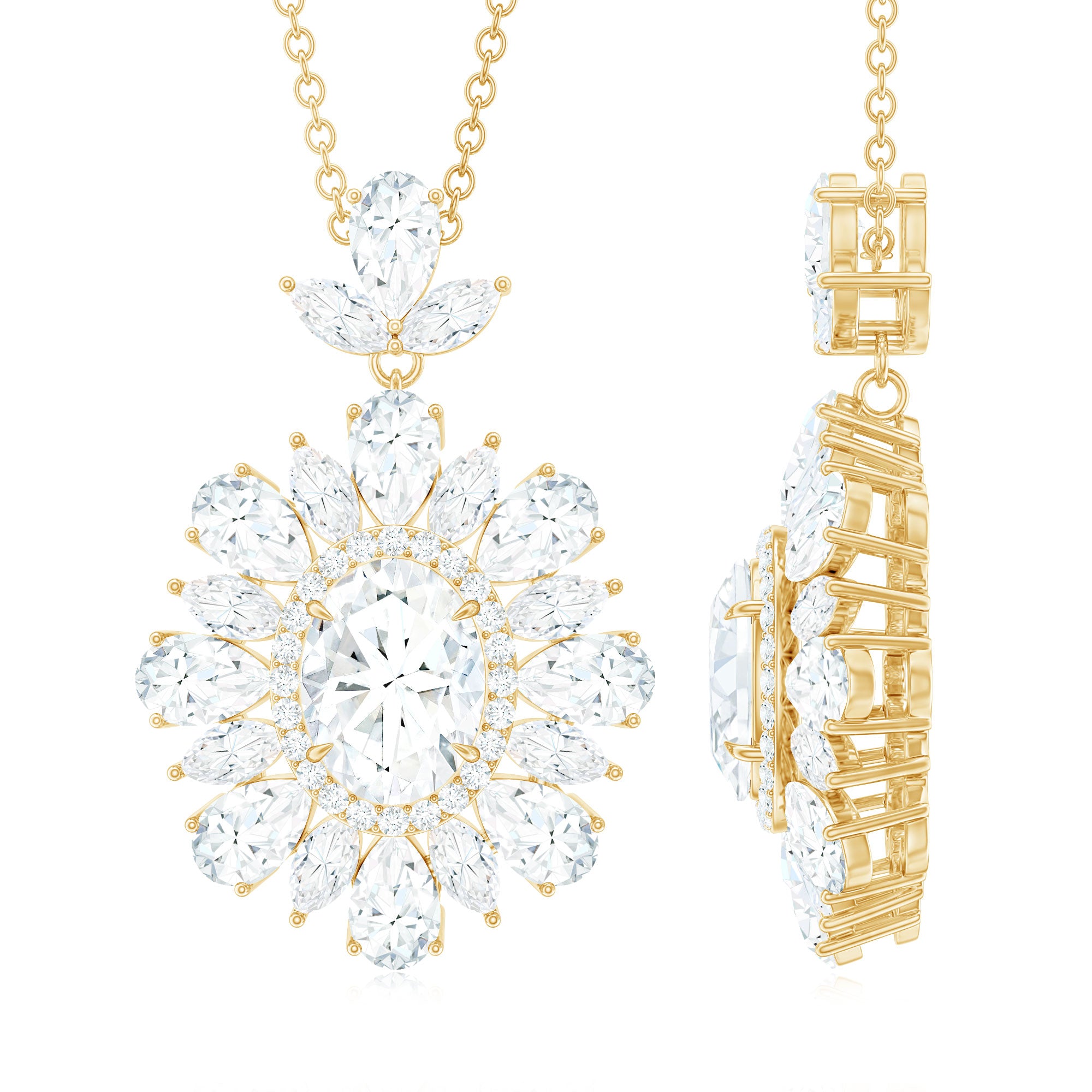 This Gold Moissanite Pendant is a perfect gift to make her smile. The unique Bridal Pendant is adorned with a oval cut moissanite in the center and round, pear and marquise Moissanite Halo, adding a touch of elegance to any attire. Get your hands on this Moissanite Pendant and flaunt it with pride.