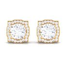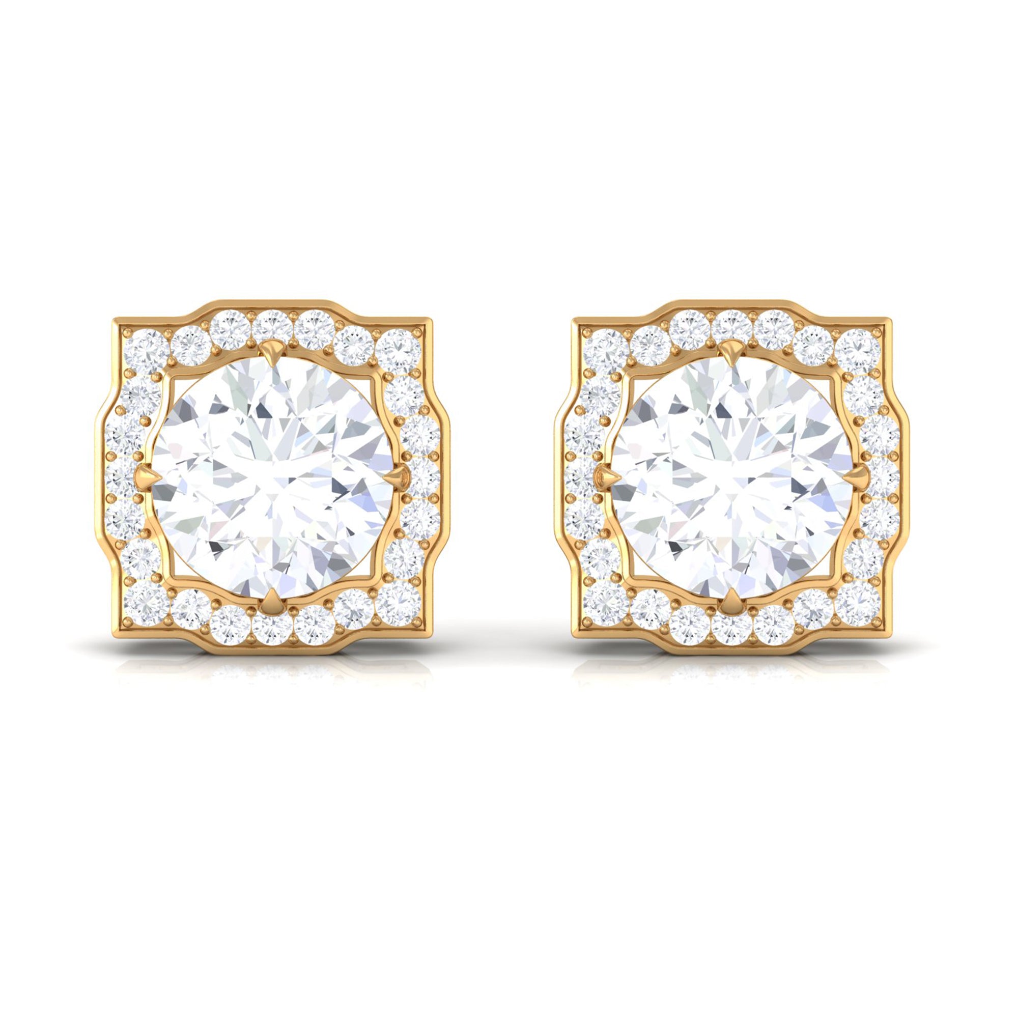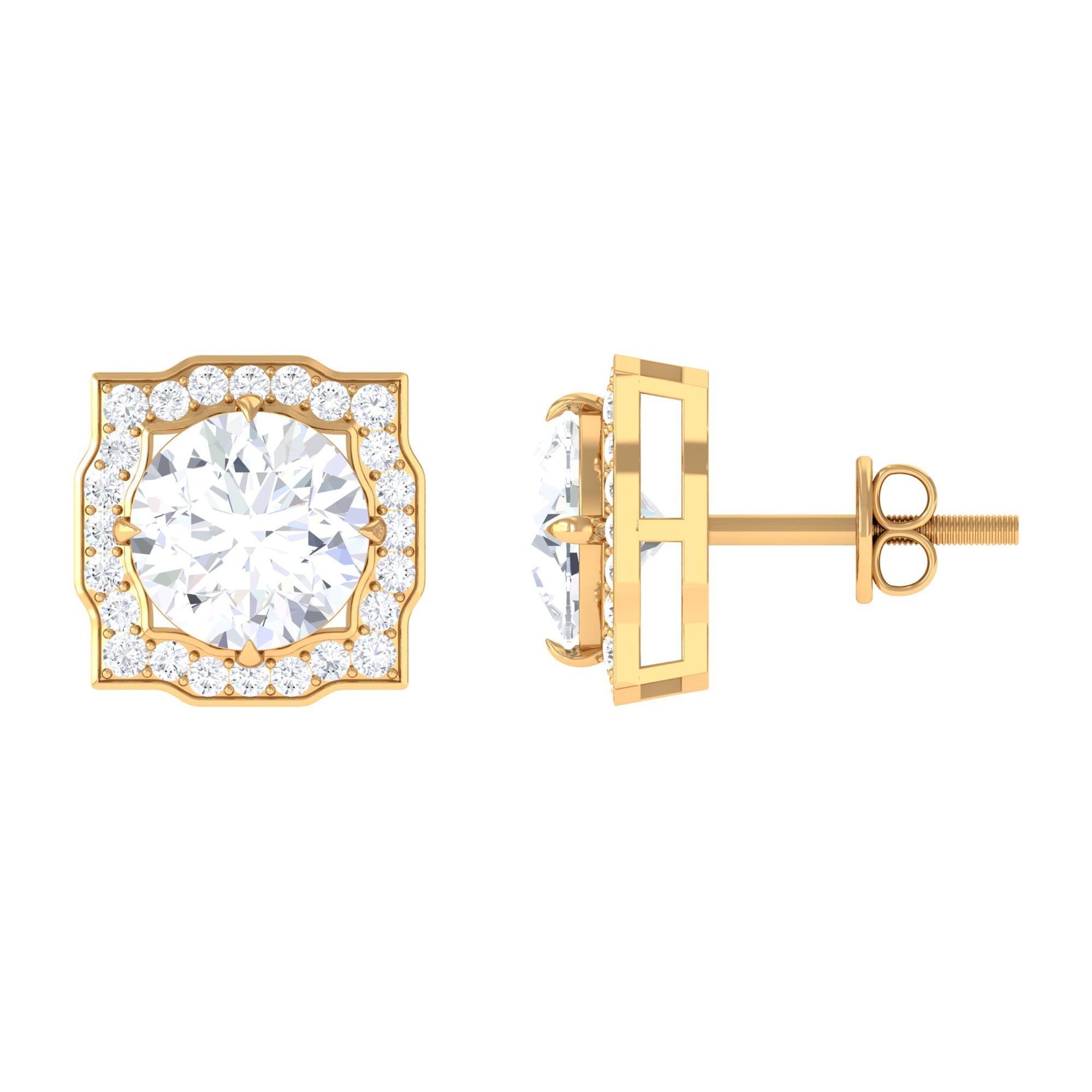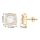 These Statement Stud Earrings embellished with Brilliant Round Cut Moissanite is set at the center as Solitaire in a Prong Setting encircled with small Brilliant Round Cut Moissanites, crafted in a Solid Gold Metal.