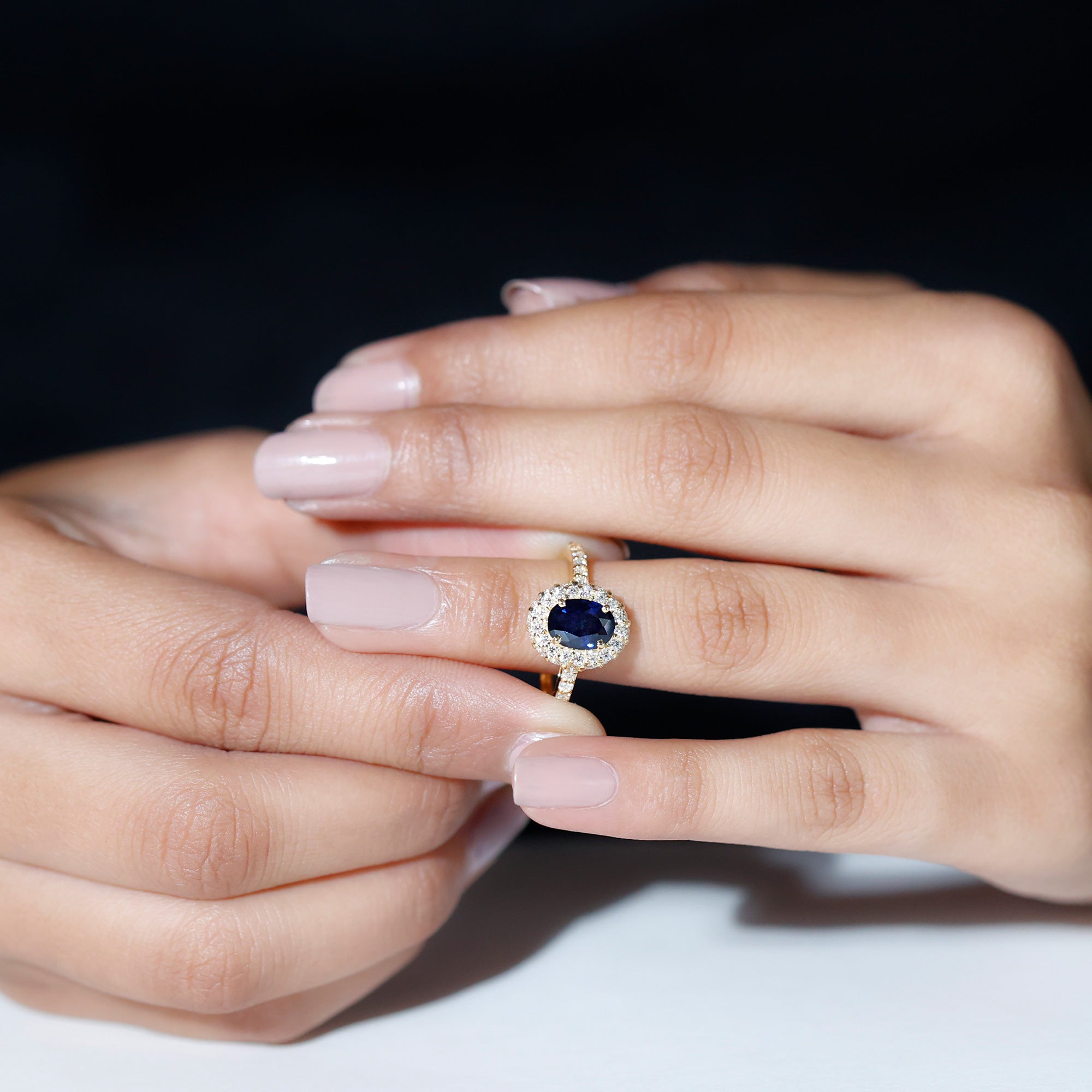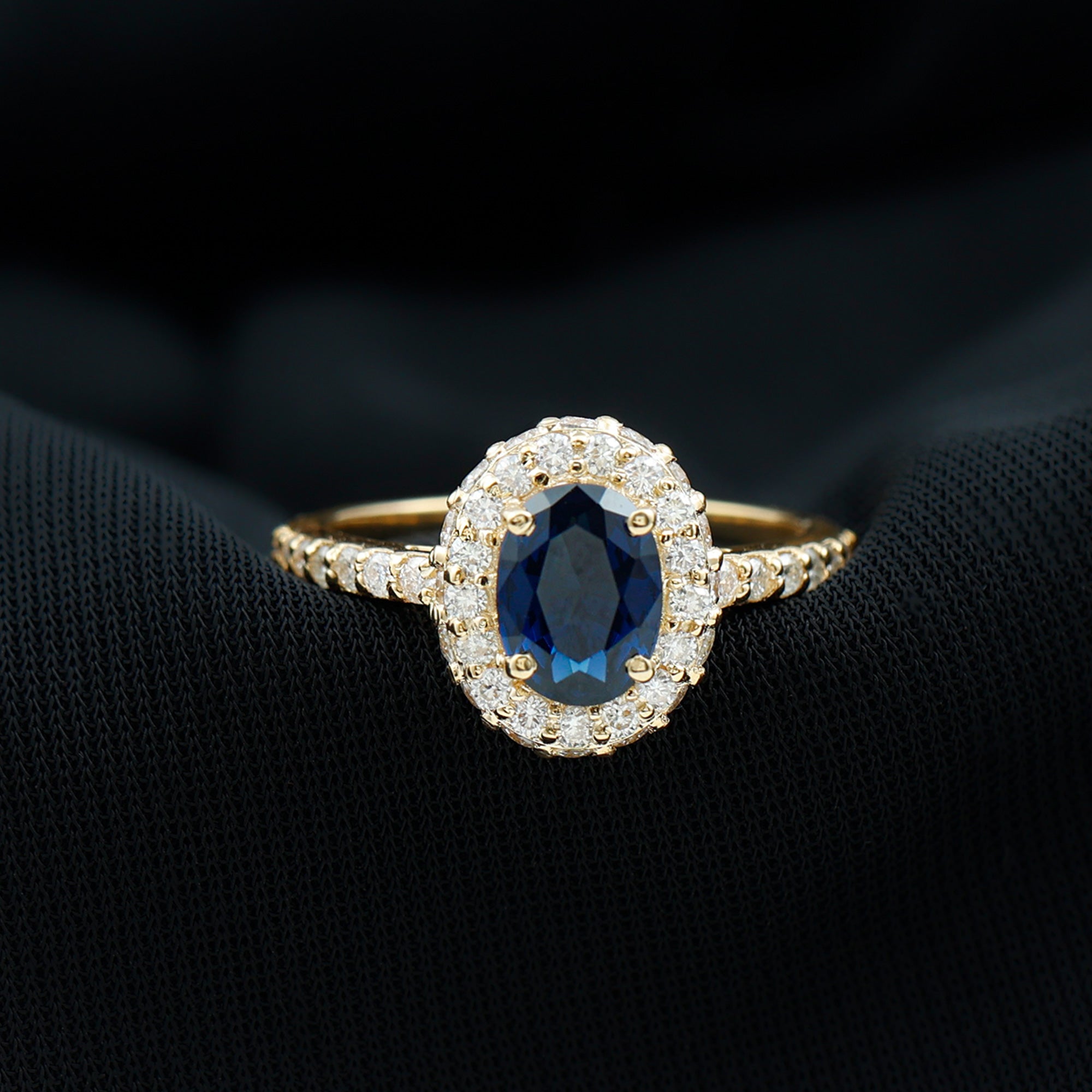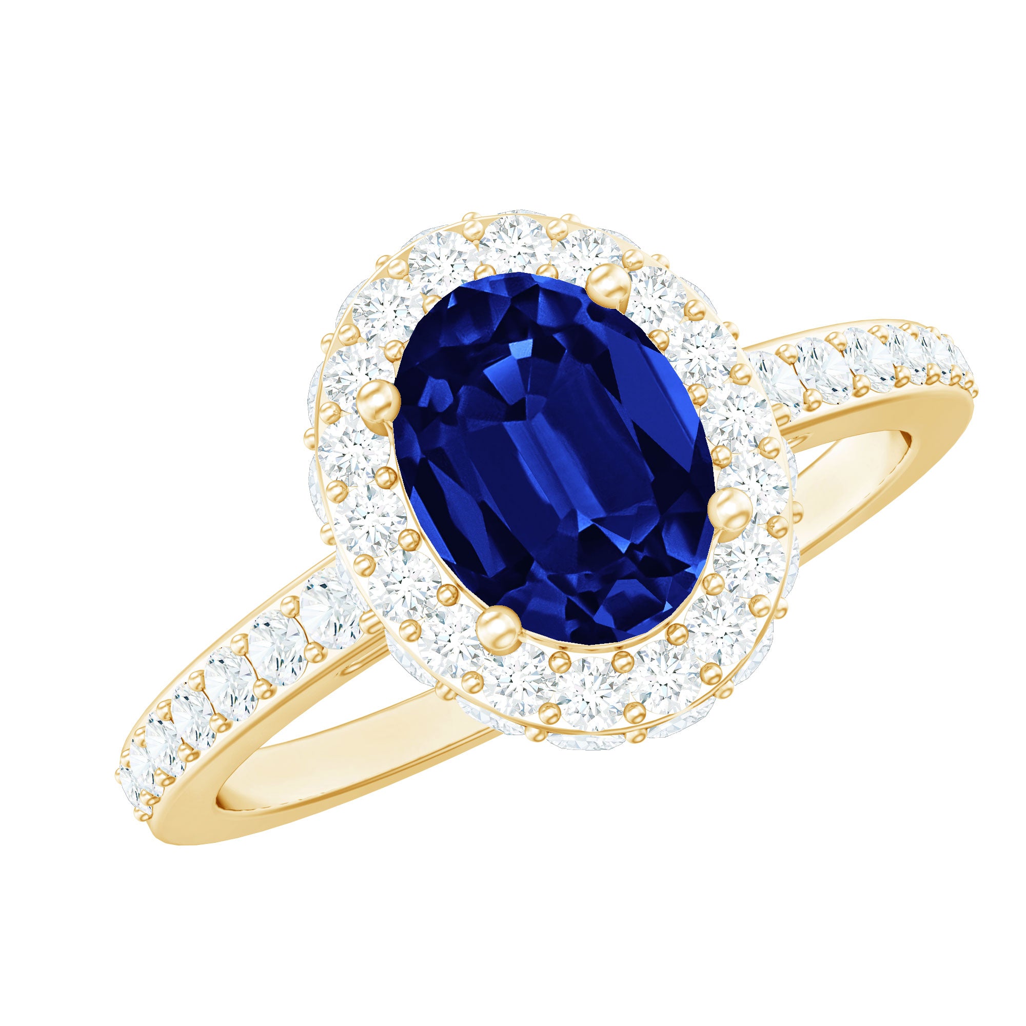 Crafted in precious gold, this Created Blue Sapphire Halo Ring is a stunning choice for your special occasion. It features an oval cut created blue sapphire in a prong setting, surrounded by a Diamond halo that adds an extravagant touch to the overall design. This classic blue gemstone engagement ring is sure to make a beautiful style statement and is the perfect gift for your loved one.