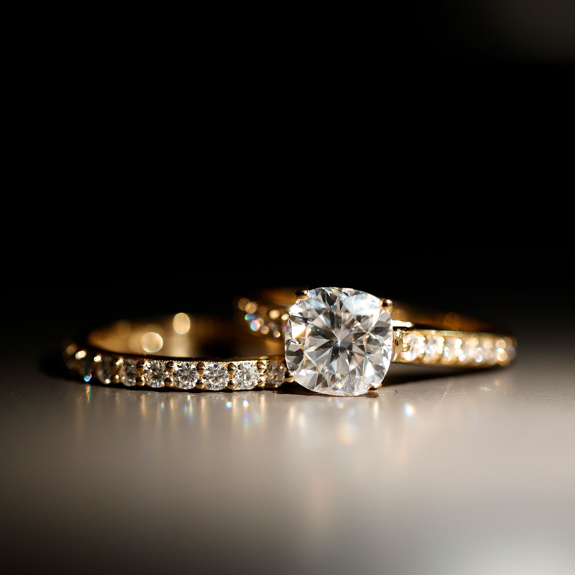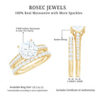 The Moissanite Bridal Ring Set is designed to capture hearts and is made to last forever. It brings together classic beauty and a touch of modern style, making it perfect for someone who loves elegance with a hint of sparkle. This Moissanite Wedding Set includes two rings - a Solitaire Engagement Ring and a Wedding Band, that fit perfectly together for a beautiful and romantic look. At the center of the engagement ring sits a stunning 8 MM cushion cut moissanite, held securely in basket setting. The band of the engagement ring is decorated with small round cut side stones, adding a gentle sparkle that highlights the main stone’s brilliance. The matching wedding band completes the Bridal Wedding Ring Set with a row of round cut moissanite stones arranged in a half eternity design. Made for both comfort and daily wear, this Moissanite Engagement Ring Set is smooth, secure, and easy to wear every day. It feels just as beautiful as it looks. The Cushion Cut Ring Set comes in a premium jewelry box, making it ready to be gifted for an engagement, wedding, or special occasion.
