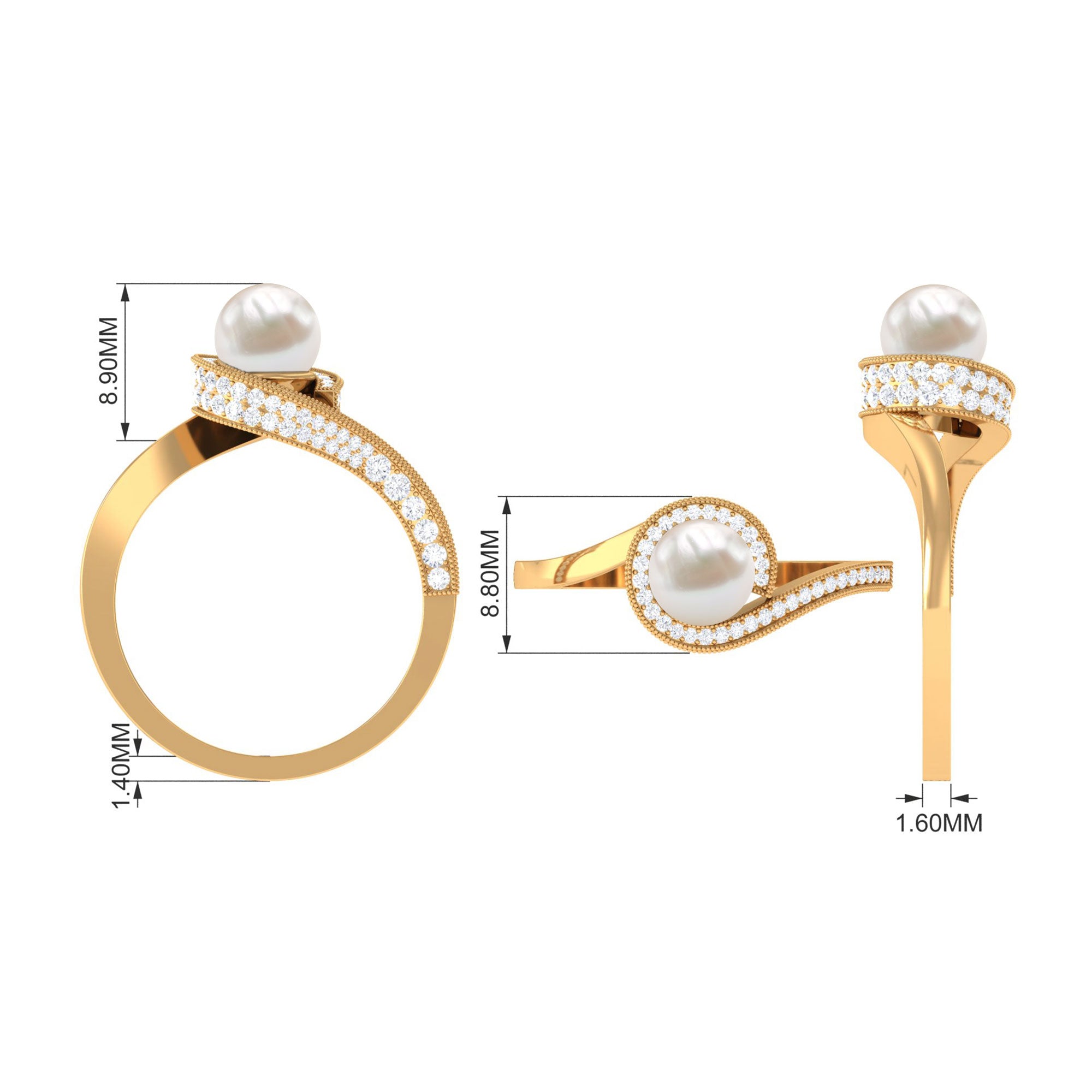 Elevate your style with our beautiful Bypass Engagement Ring, featuring a stunning Round Shape Freshwater Pearl at its center, accented with a shimmering Diamond halo and intricate beaded detailing. Crafted in gold, this Freshwater Pearl with Diamond Halo Ring exudes a luxurious and sophisticated charm, perfect for making a stylish statement on any occasion. With its elegant design and premium quality materials, this ring is sure to become a cherished addition to your jewelry collection, adding a touch of radiance and beauty to your everyday look.