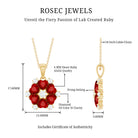 This exquisite Heart-Shaped Created Ruby Gemstone is set in a Prong Setting and surrounded by a delicate Diamond Flower Pendant that exudes sheer elegance. The Created Ruby Floral Pendant Necklace is a versatile piece worn as an everyday accessory or as office wear jewelry.