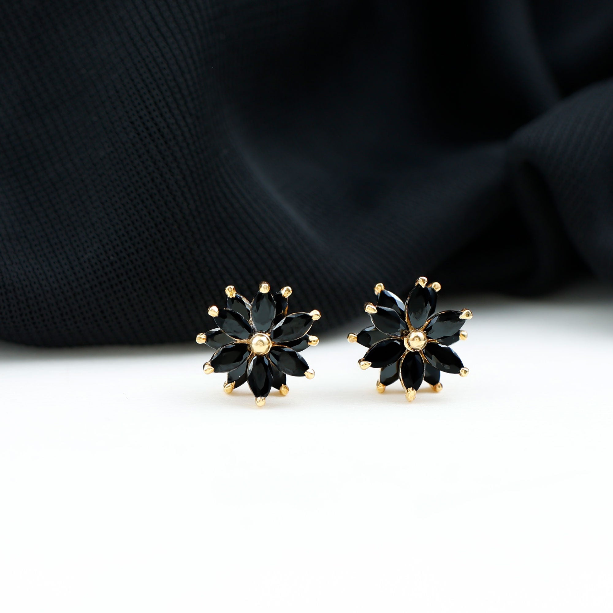 Add a pinch of spark to your outfit with these Stud Earrings, adorned with Marquise Shape Black Onyx Gemstone set in a floral pattern in Claw Setting. These lovely Floral Earrings are crafted in Solid Gold Metal