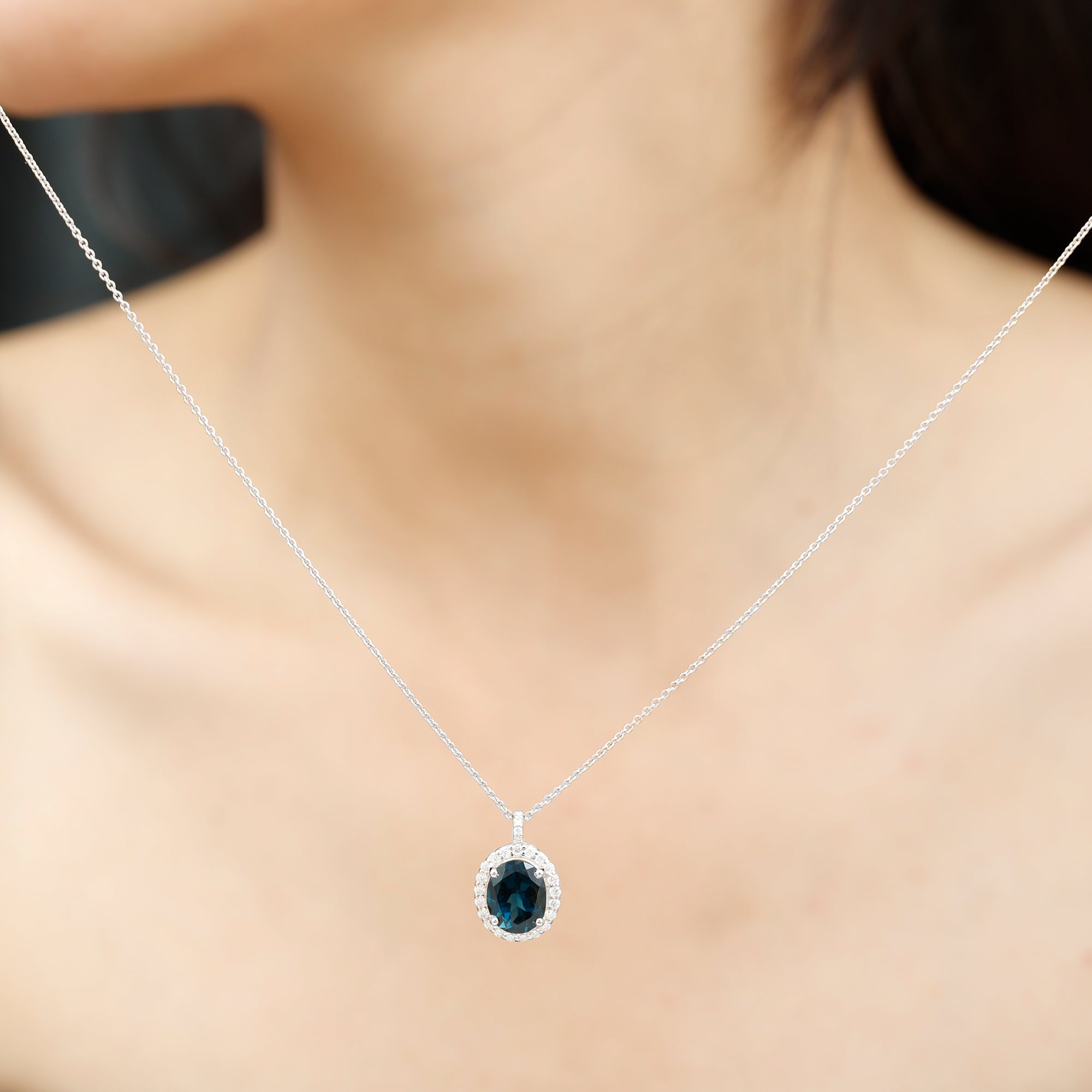 3 CT Oval Cut London Blue Topaz and Diamond Halo Pendant