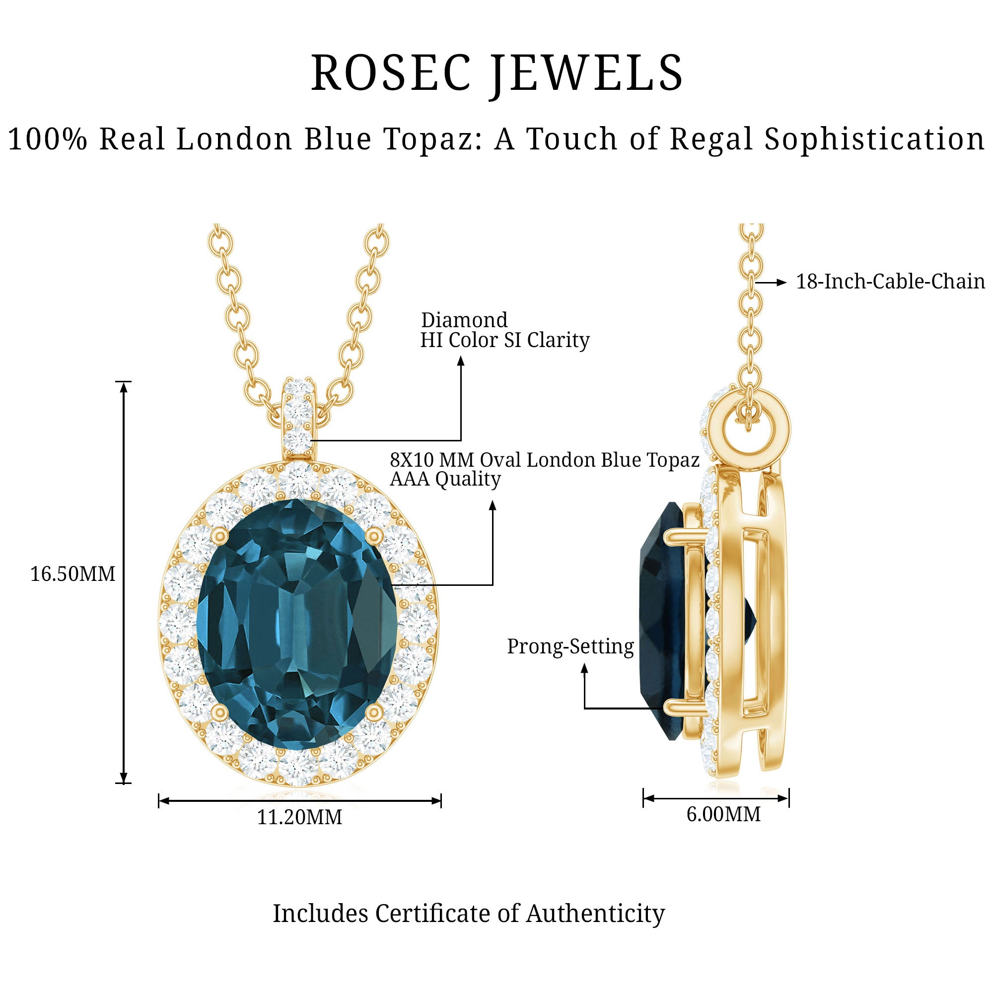 Enhance your neck with the exquisite elegance of the London Blue Topaz Pendant. Featuring an 8X10 MM Oval Cut London Blue Topaz in a secure Prong Setting, adorned with sparkling Diamond, this Cocktail Pendant effortlessly complements any ensemble. While this pendant symbolizes friendship, it also serves as a remarkable gift for those born in December.