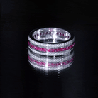 This Wedding Band features Princess Cut Created Ruby and Round Cut Moissanites in Channel Setting. This Wedding Band will be a beautiful and unique gift for a Woman.