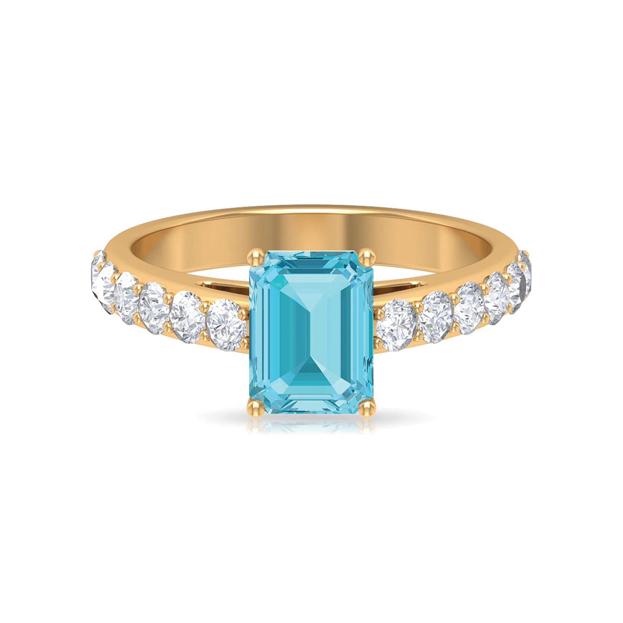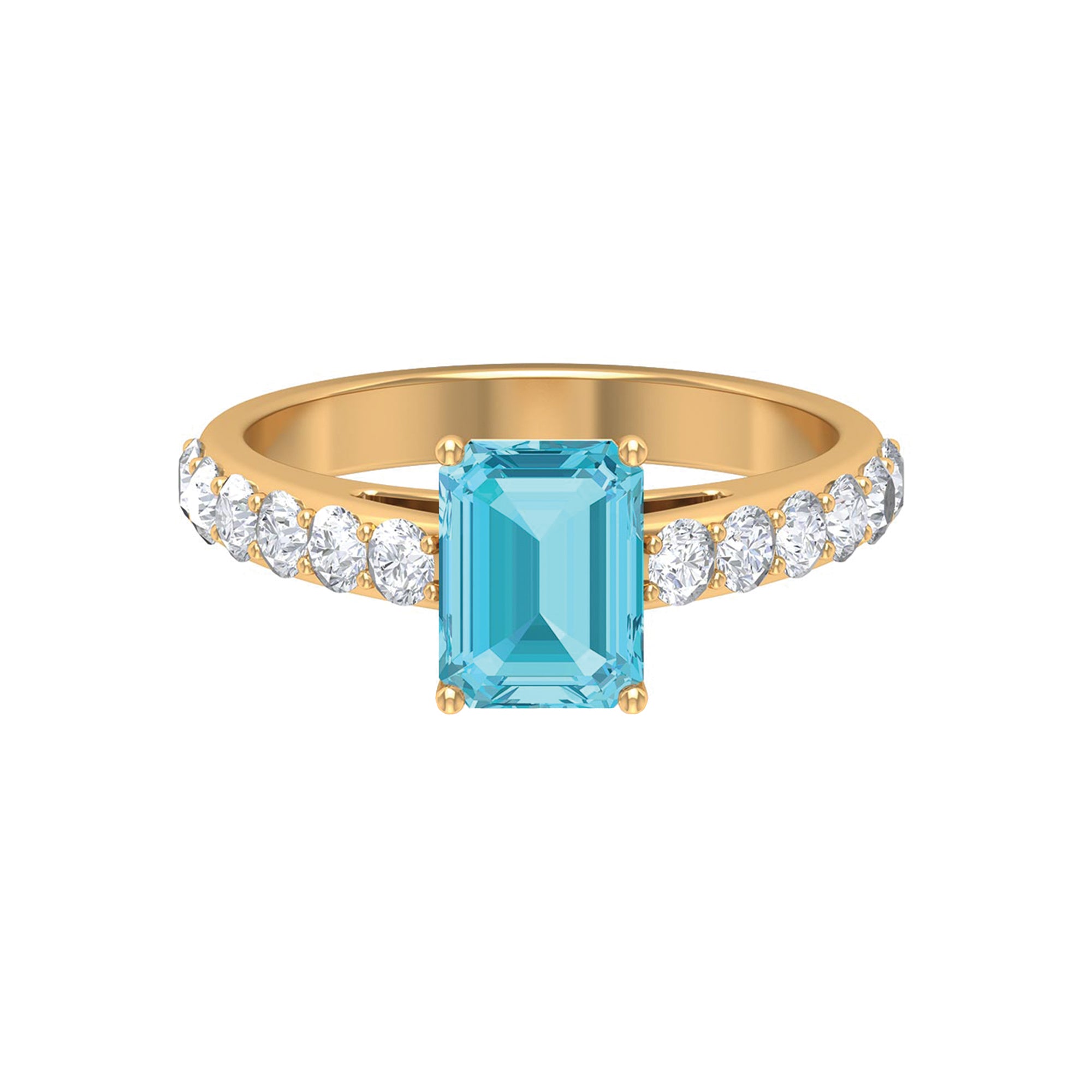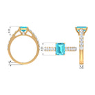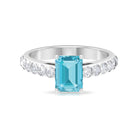 It is an Engagement Ring for Women adorned in Solid Gold and consists of an Octagon Cut Swiss Blue Topaz as Solitaire embellished in Prong Setting with Round Brilliant Moissanite as Side Stones embellished in Pave Setting, especially for you.
