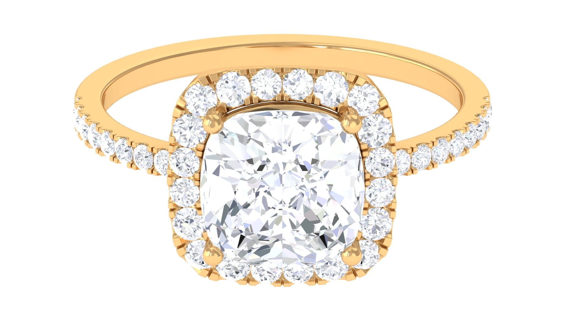 On the very special day of your life, give this amazing and elegant ring to your beloved and add more spark into her life. Adorn with Cushion Cut Cubic Zirconia set as solitaire in prong setting with halo and side stones, sculpted in Gold. This Simulated Diamond Engagement Ring is perfect for the occasion and surely make your lady happy.