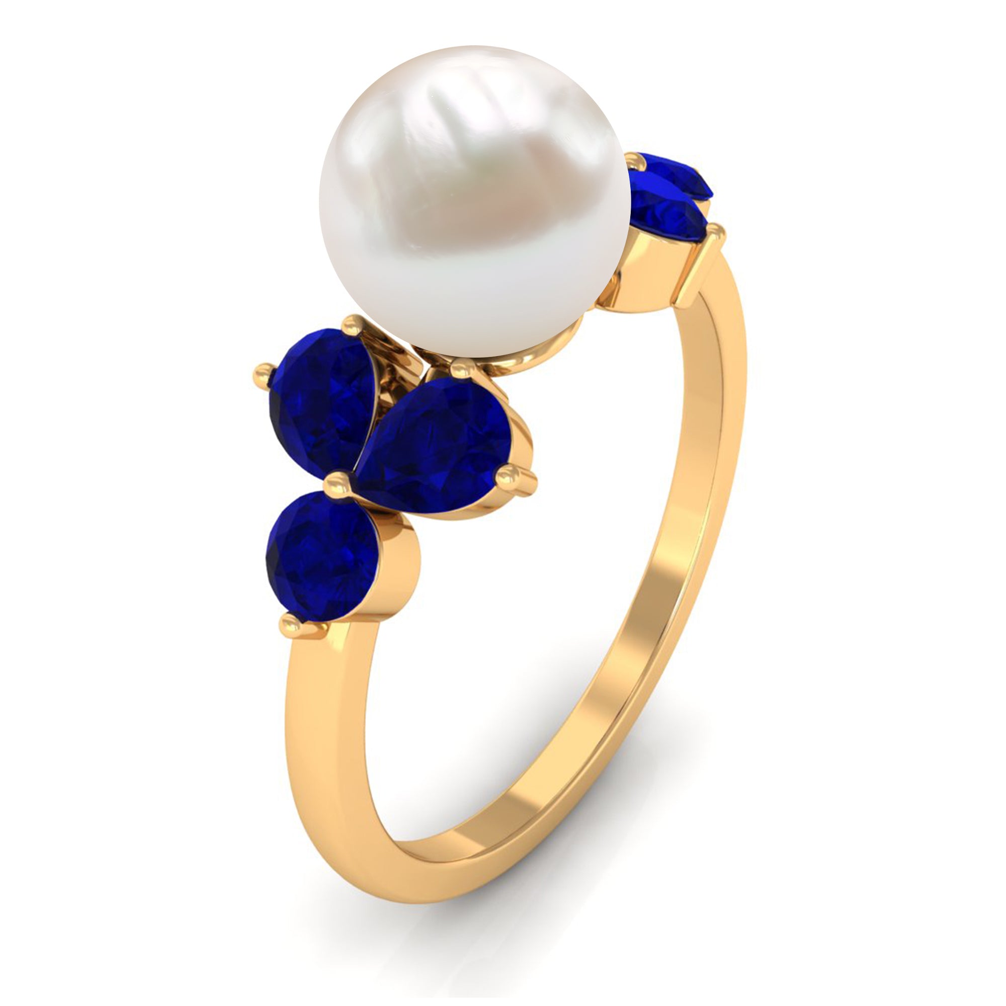 Make a bold and trendy statement with our alluring Solitaire Engagement Ring, featuring a Round Cut Freshwater Pearl in a stunning bead setting, accented with both Pear and Round Cut Blue Sapphires in a prong setting. Crafted in solid gold, this luxurious white pearl ring exudes a sophisticated and modern aesthetic, perfect for elevating any look to new heights. With its eye-catching design and premium quality materials, this Solitaire Ring is sure to become a cherished addition to your jewelry collection.