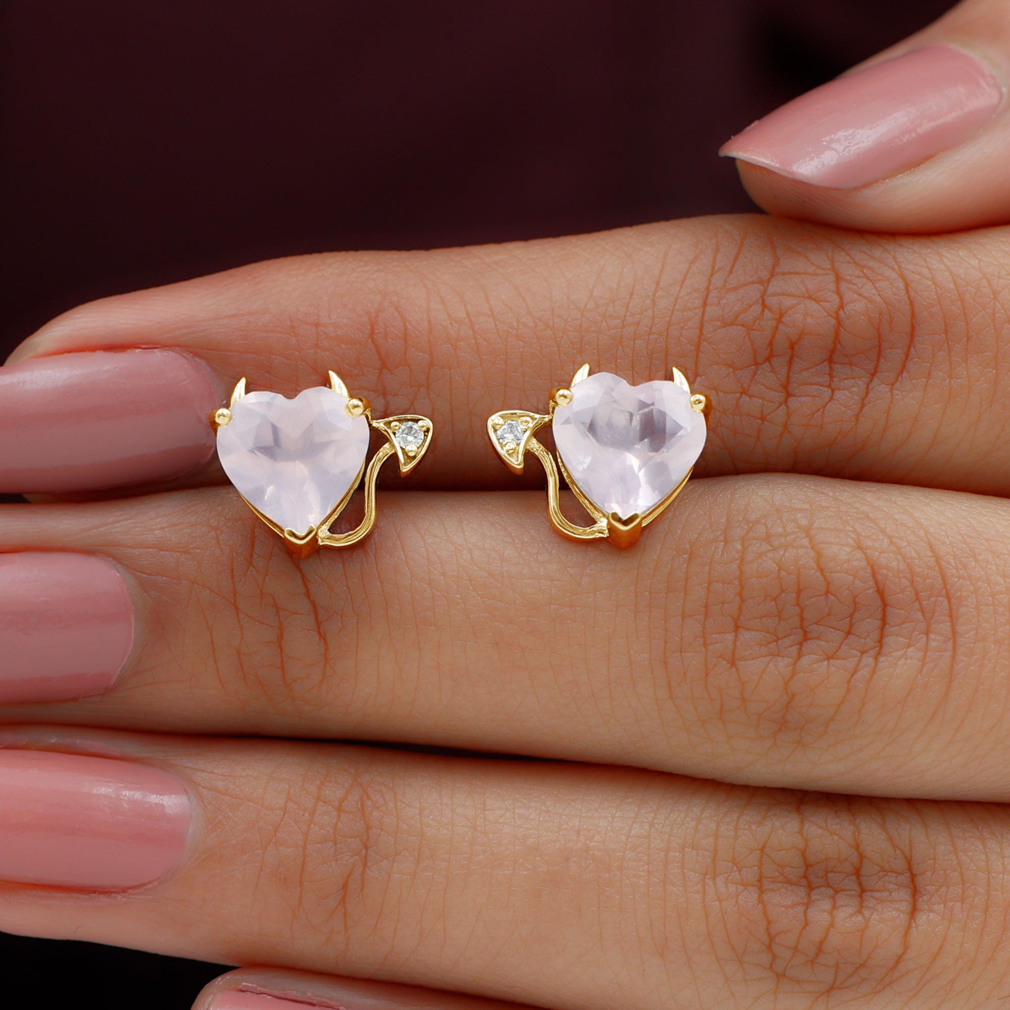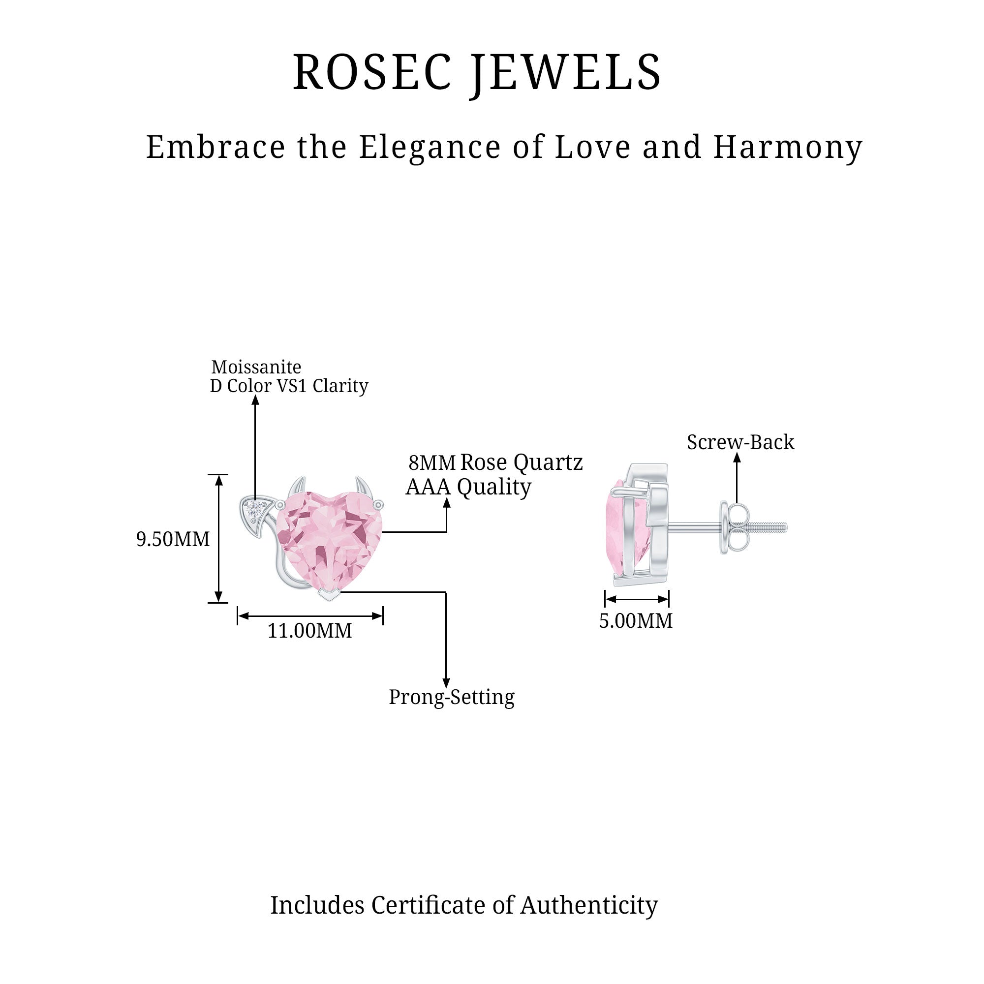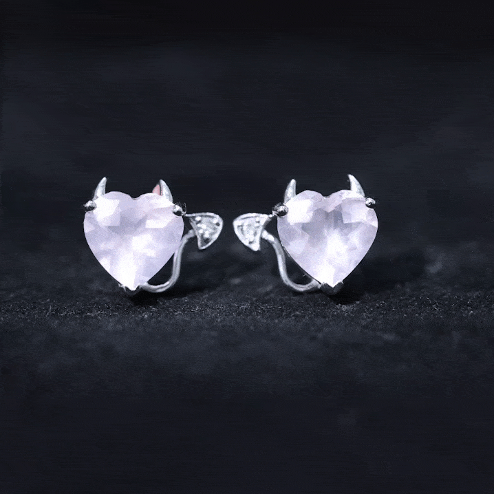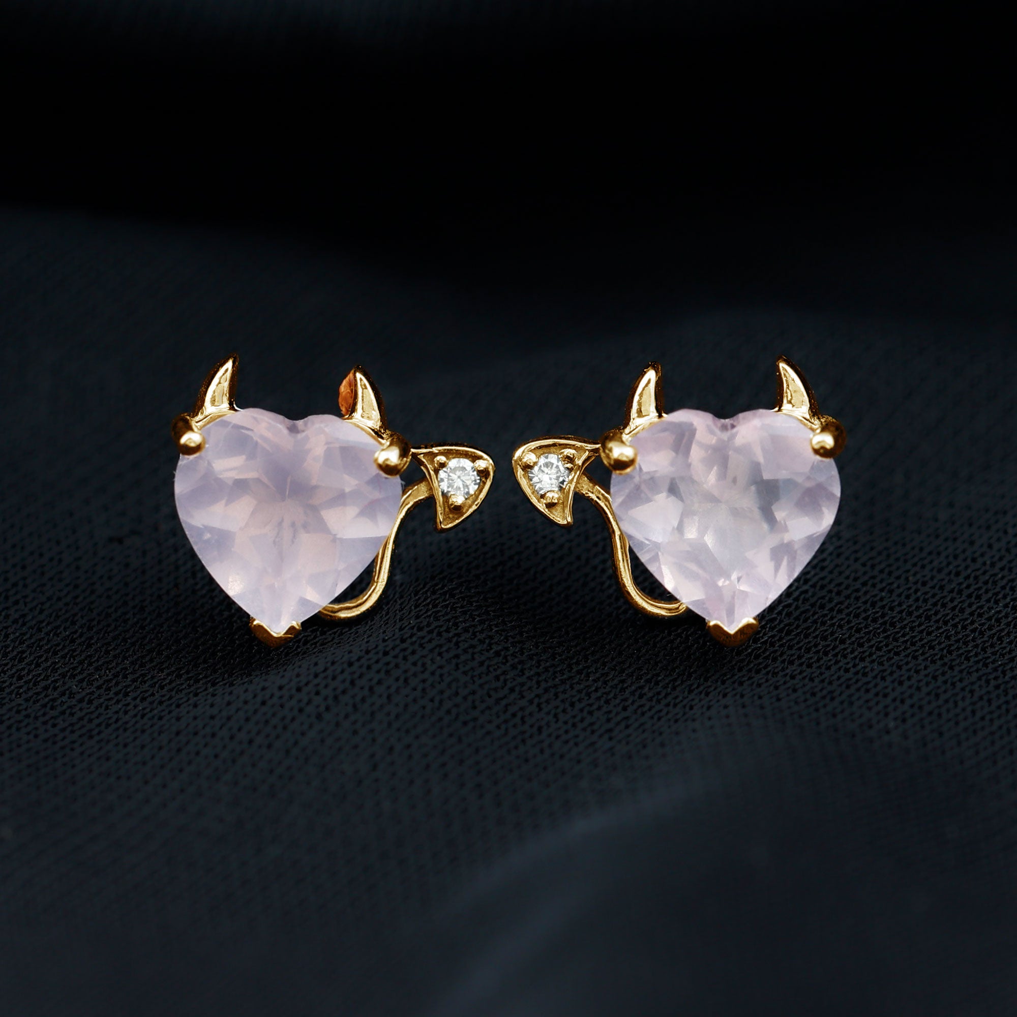 If you are drawn to mysterious gothic inspired jewelry with a romantic edge, these Rose Quartz Devil Earrings are designed just for you. The design features an enchanting 8MM heart shaped rose quartz of AAA quality set in secure prong setting. The heart symbolizing love and these Solitaire Stud Earrings are further accented by sleek horn and tail details adorned with shimmering D-VS1 quality moissanites. Crafted from high-quality metal and secured with a comfortable screw-back closure, these Heart Stud Earrings stay perfectly in place whether you are heading out for a special occasion or adding a hint of attitude to your everyday style. The combination of rose quartz, known for its connection to compassion and emotional healing, and the bold devil design creates a striking blend of elegance, romance, and personality. Perfect for Valentine’s Day, date nights, or simply expressing your more daring side, these Gothic Earrings offer a unique accessory that stands out effortlessly.