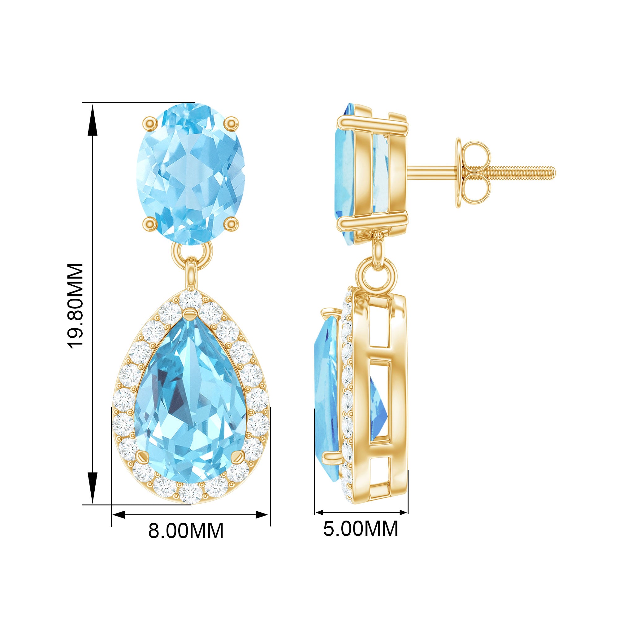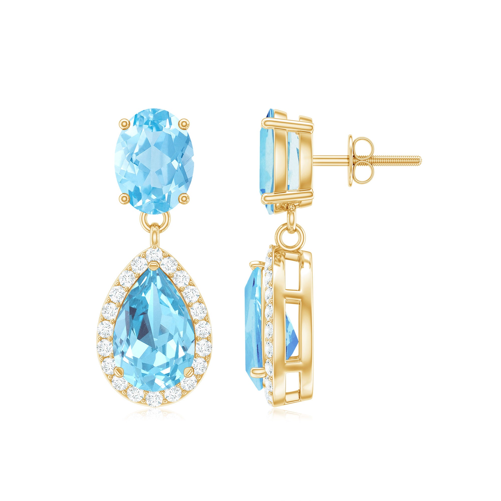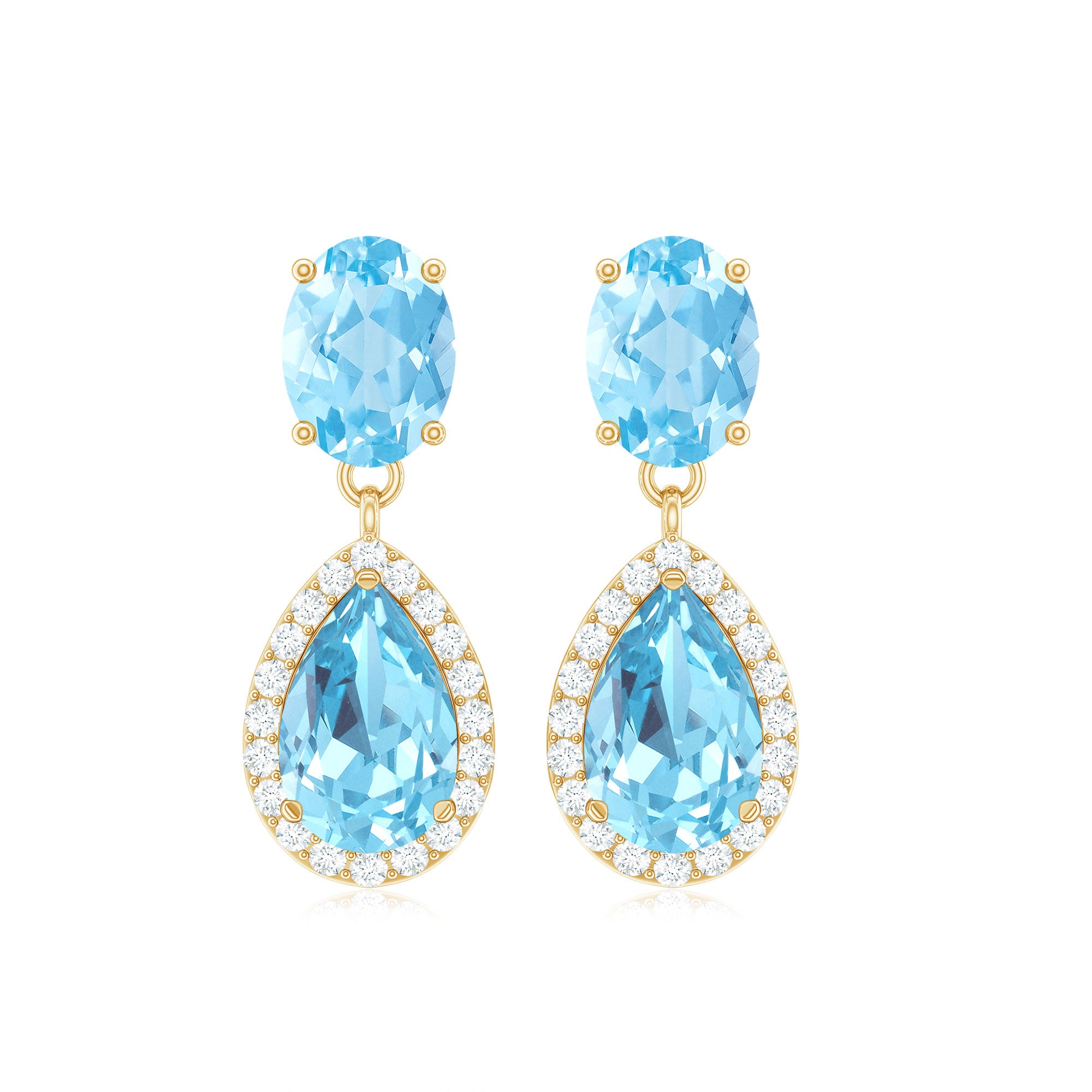 These Dangle Drop Earrings are embellished with Oval Shape Aquamarine Gemstone from which Pear Shape Aquamarine Gemstone is hanged which is encircled with Round Shape Moissanite in Halo Setting, crafted in a Solid Gold.