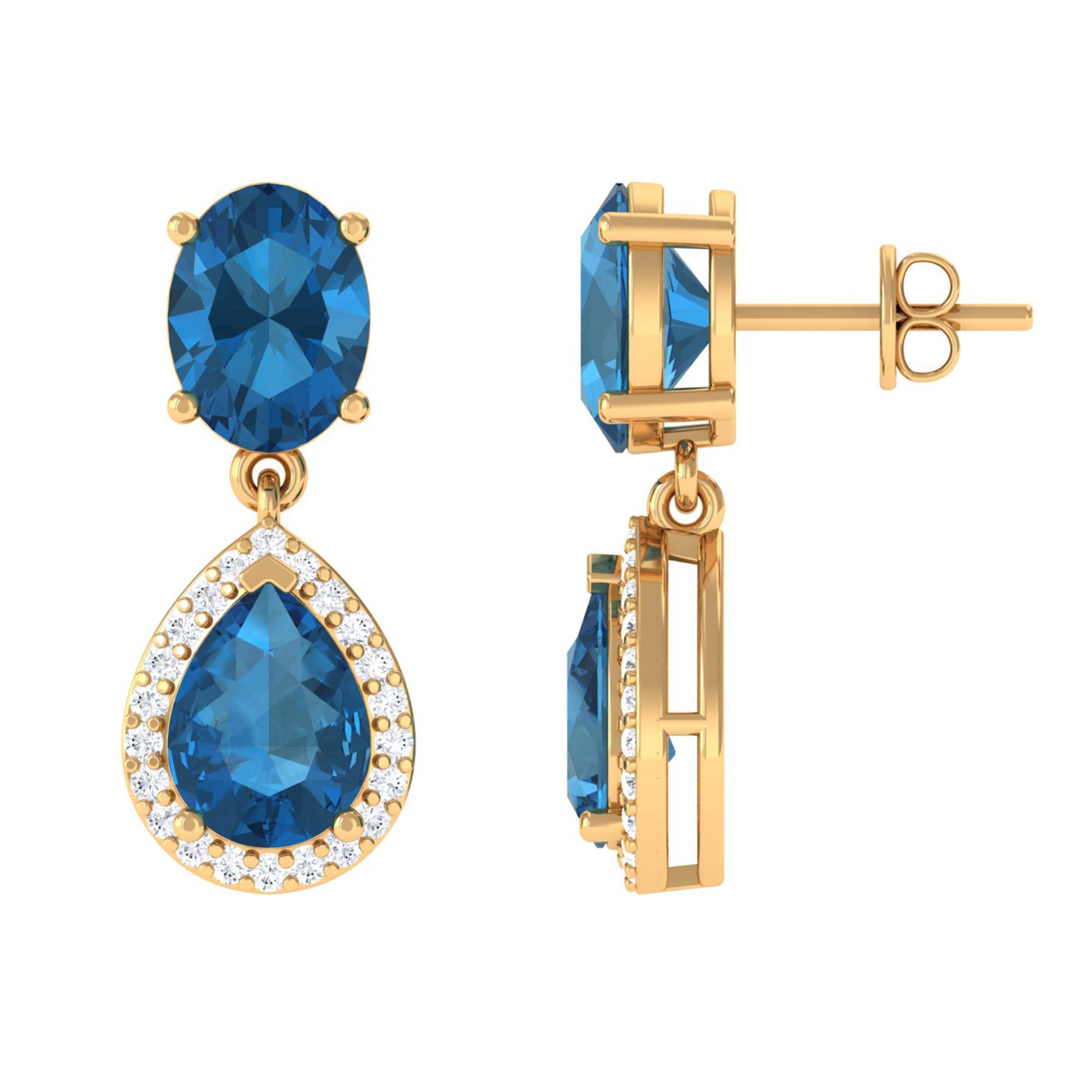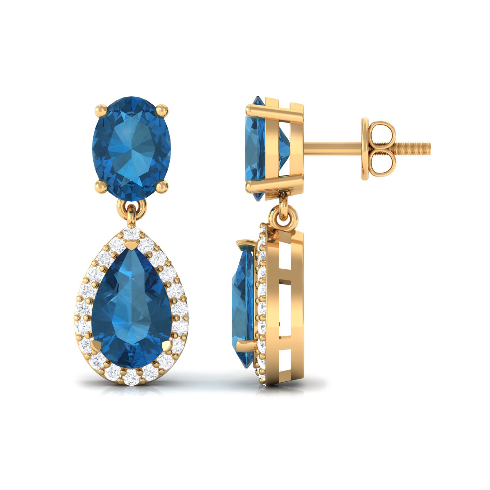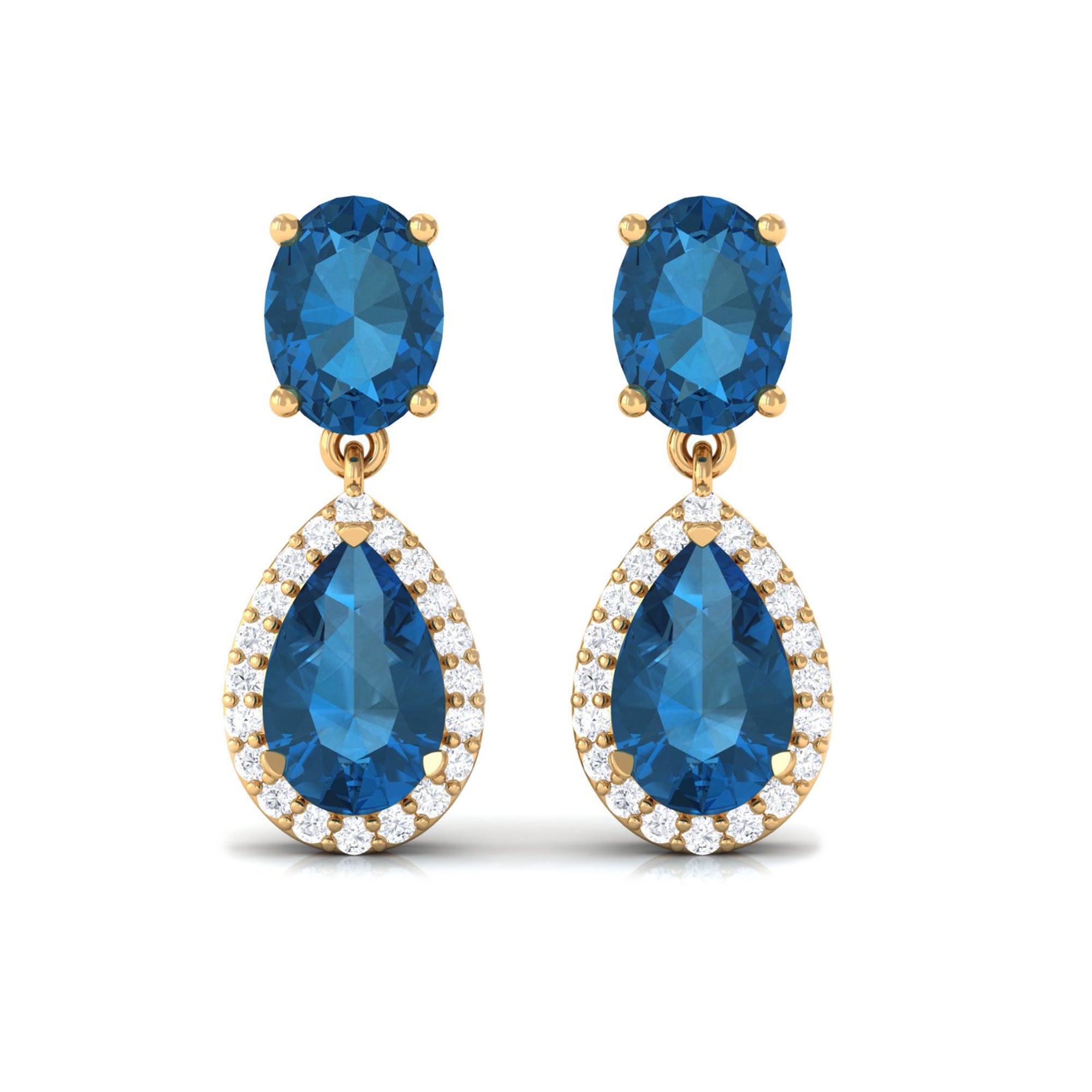 These Dangle Drop Earrings are embellished with Oval Shape London Blue Topaz Gemstone from which Pear Shape London Blue Topaz Gemstone is hanged which is encircled with Round Shape Diamond in Halo, crafted in a Solid Gold.
