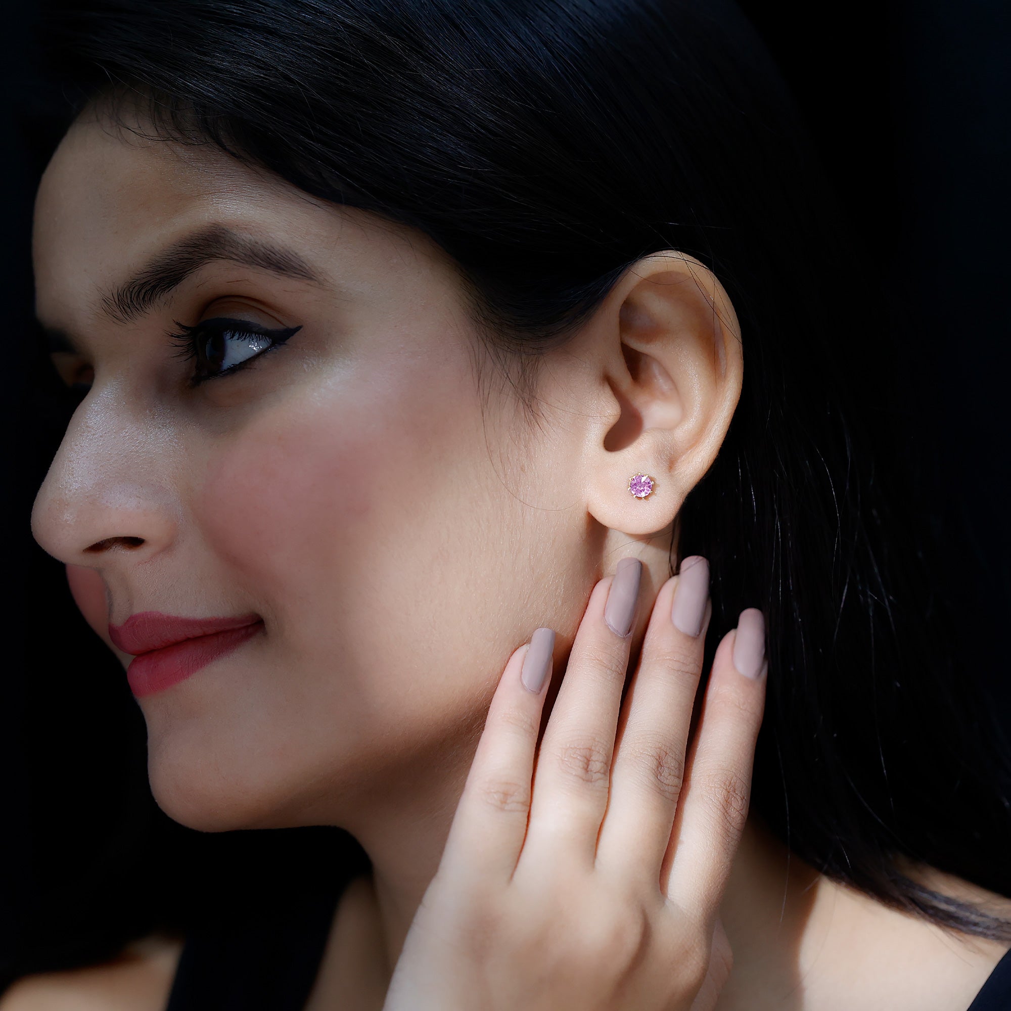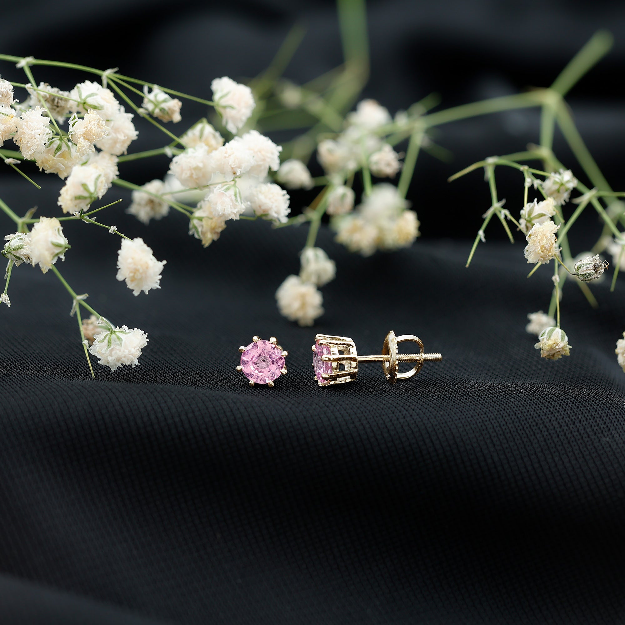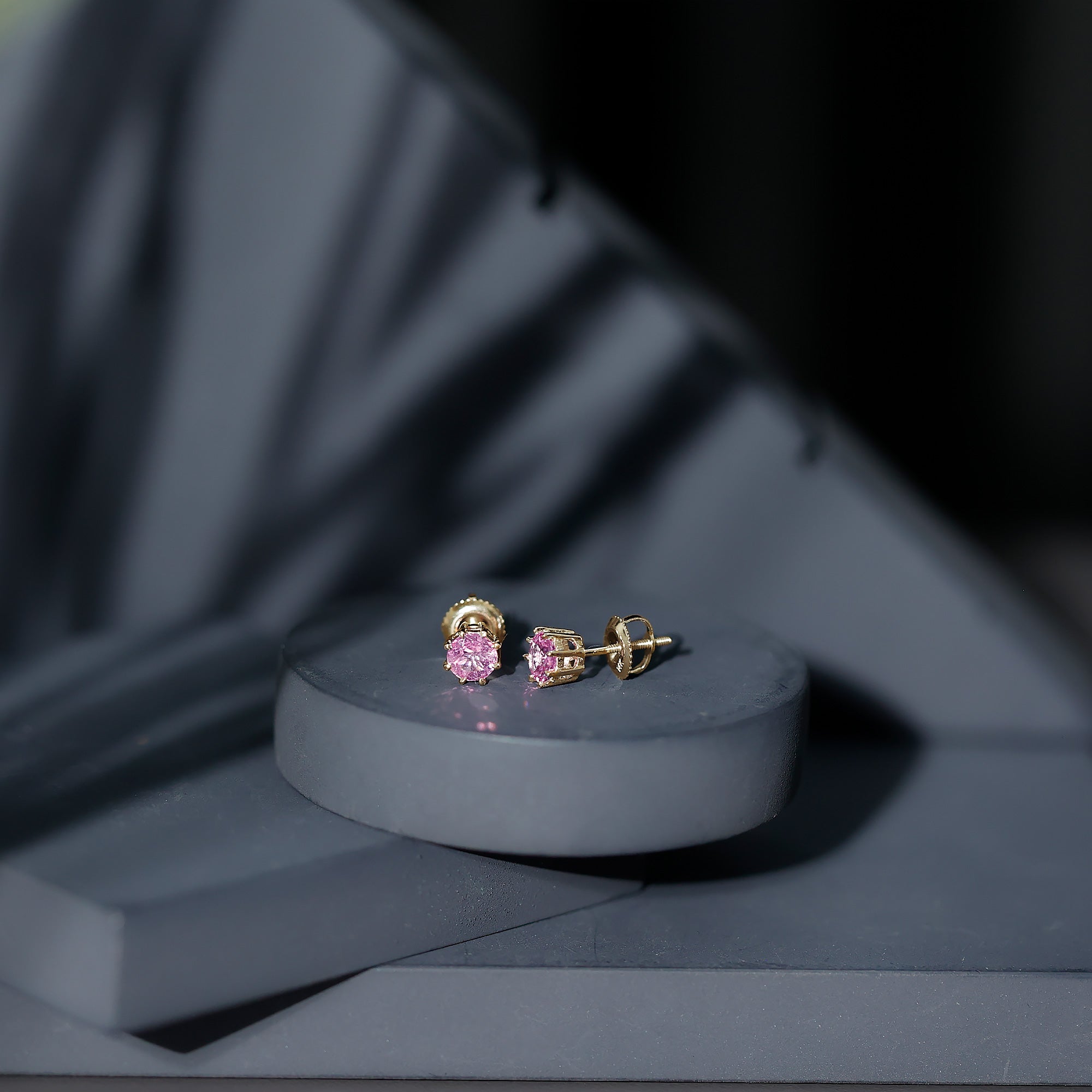 Whether it is New Year Party or Everyday dressing, this Stud Earrings fits with every look. These Earrings embellished with Round Cut Pink Sapphire set as Solitaire in 8 Claw Prong Setting. These Screw Back Earring are composed by Solid Gold.