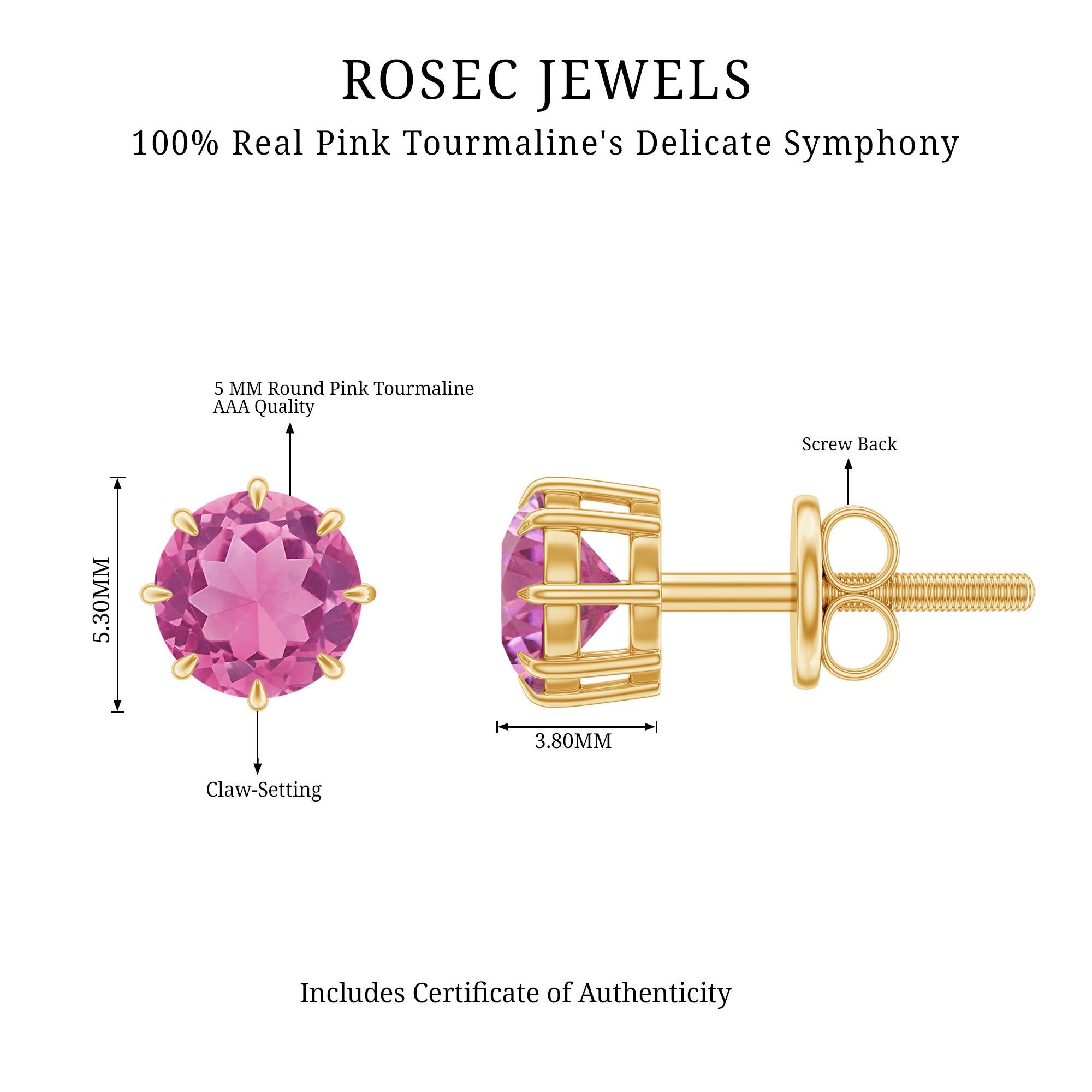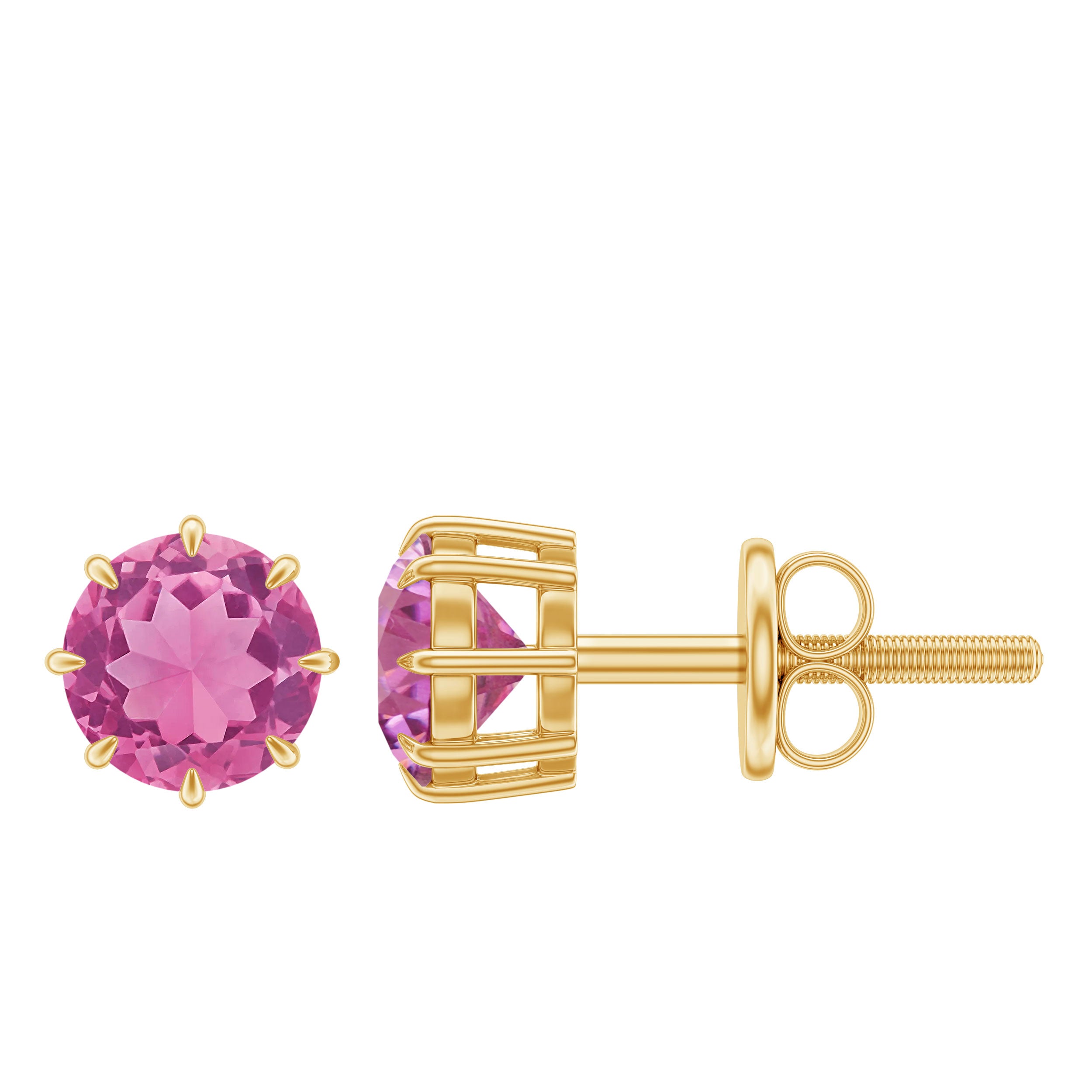 Whether it is New Year Party or Everyday dressing, this Stud Earrings fits with every look. These Earrings embellished with Round Cut Pink Tourmaline set as Solitaire in 8 Claw Prong Setting. These Screw Back Earring are composed by Solid Gold.