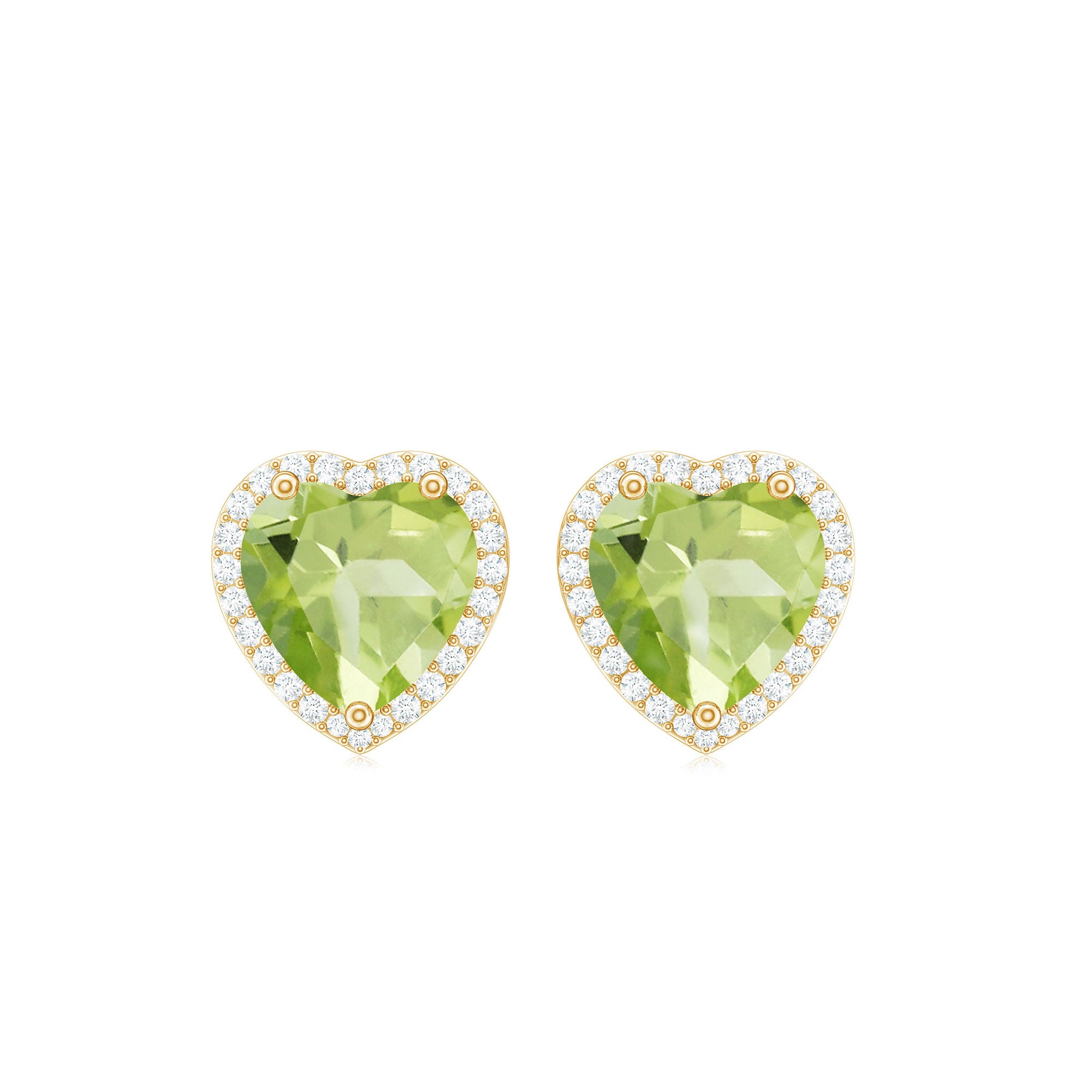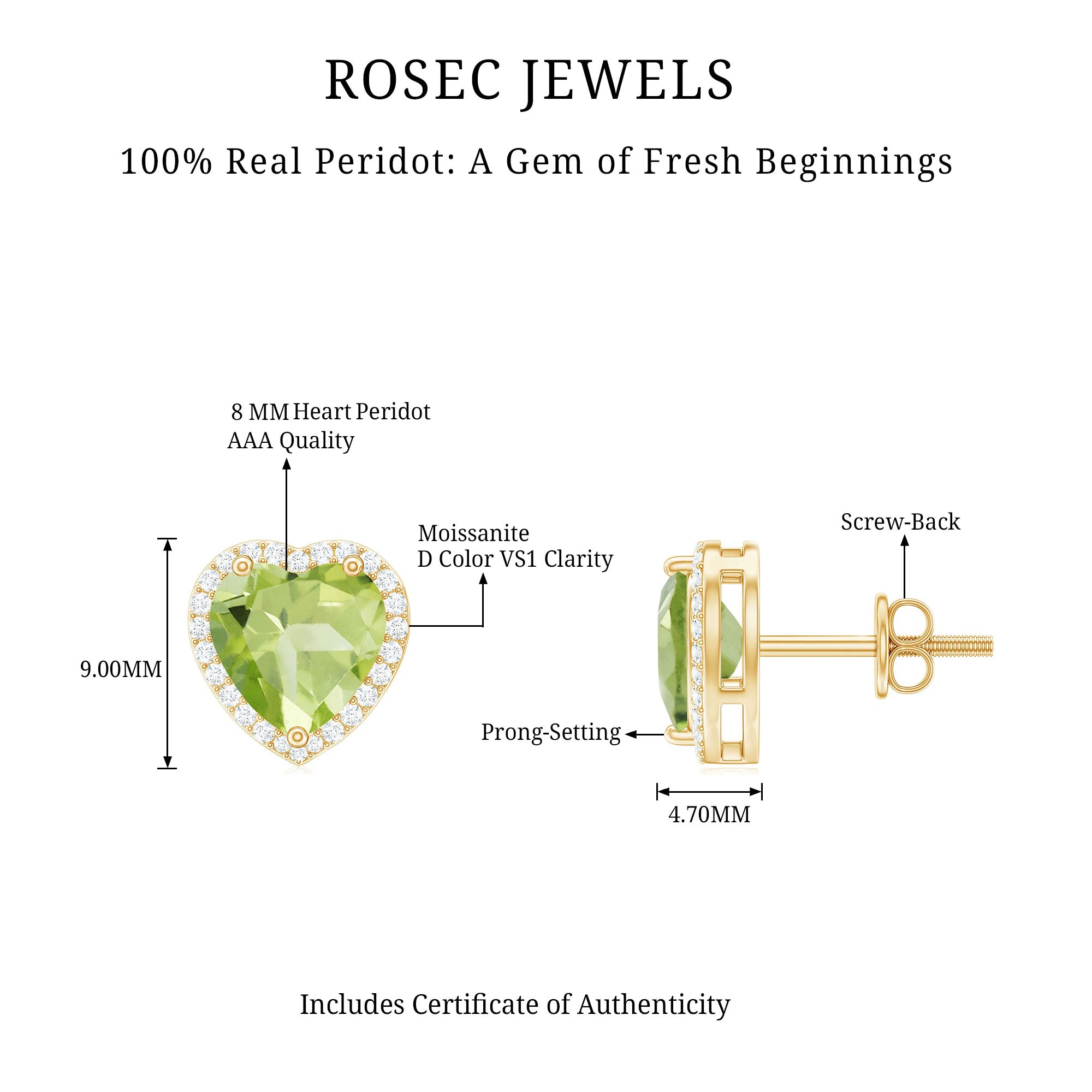 Add charm to your look when you flaunt these Stud Earrings studded with 8 MM Heart Shaped Peridot Solitaire enhanced by Round Brilliant Moissanite Halo adding to the brilliance of Halo Stud Earrings.