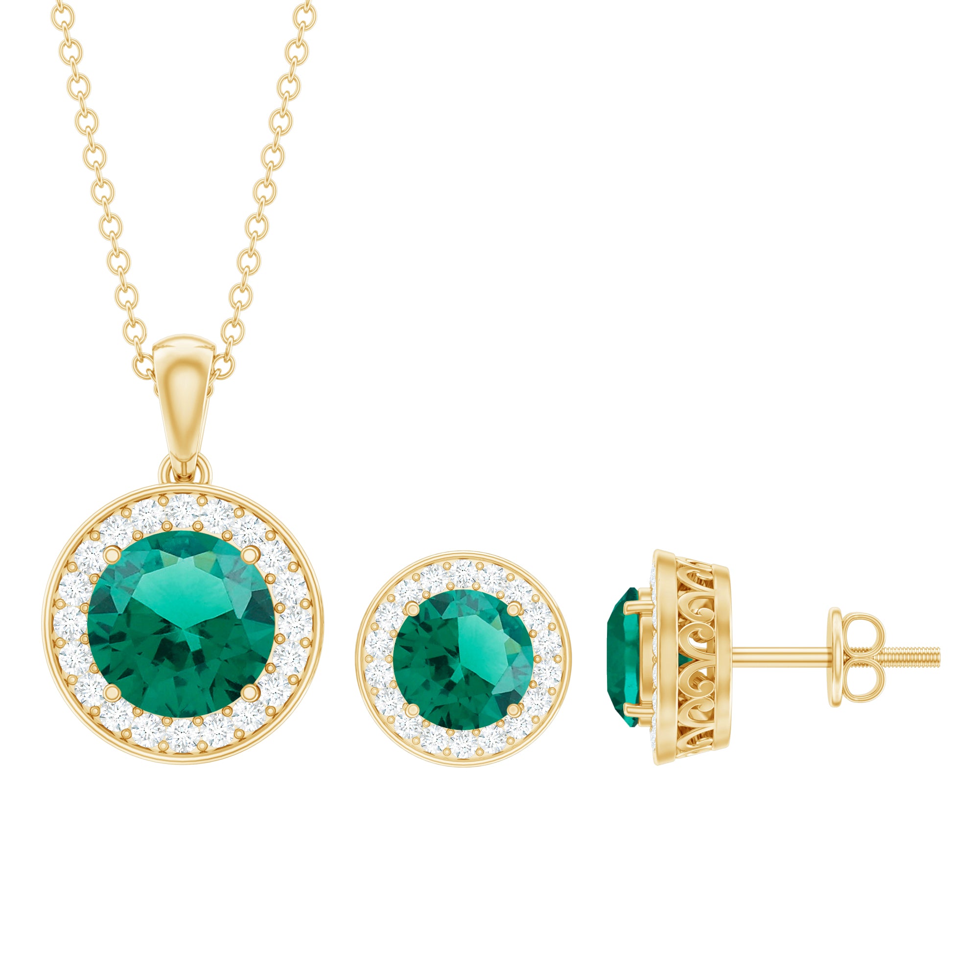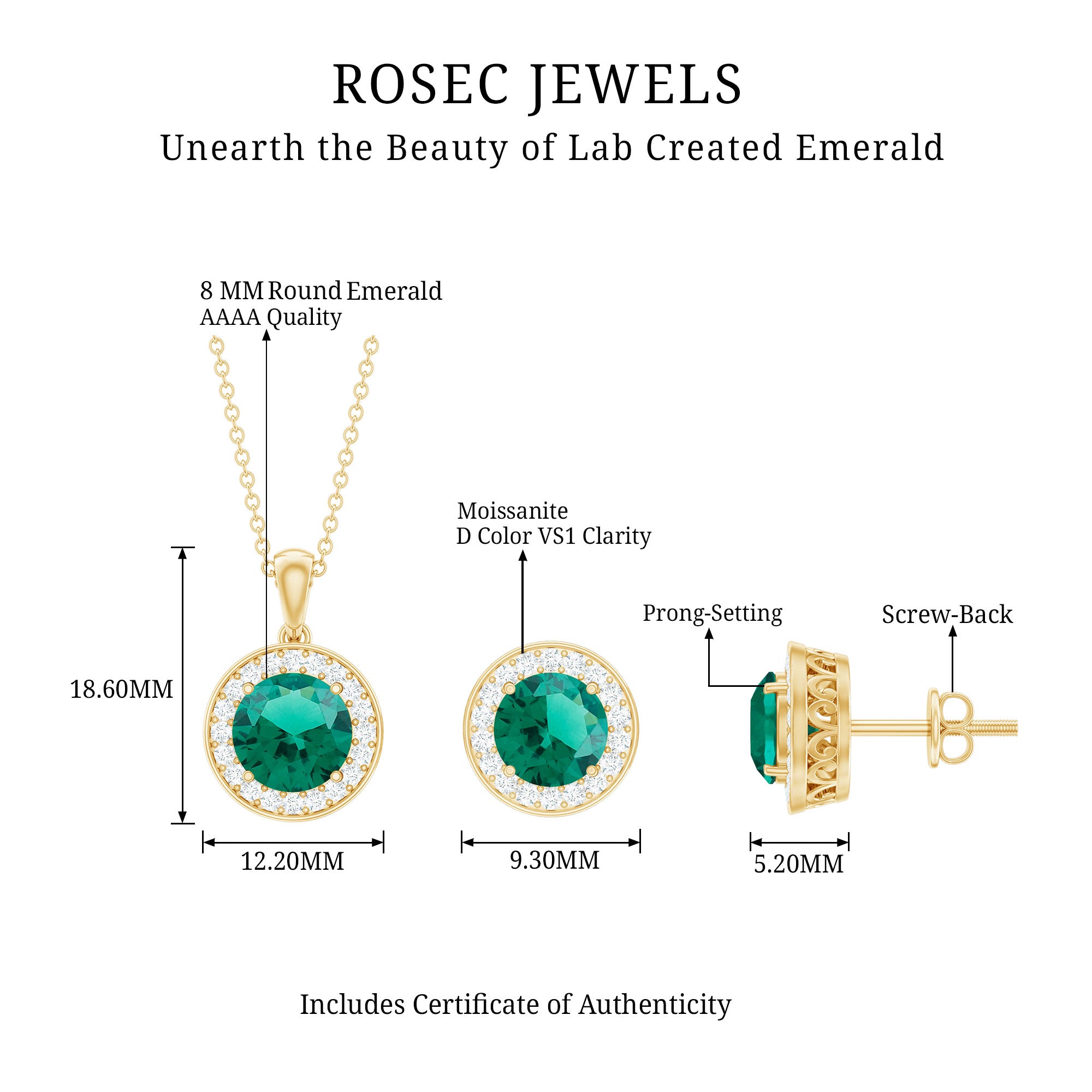 Illuminate your look with the captivating elegance of this Pendant and Earring Set. The vibrant green Round Lab Created Emerald is surrounded by a halo of dazzling Moissanite, creating a perfect blend of luxury and brilliance. Whether you are dressing up for a special occasion or adding a touch of grace to your everyday style, this Jewelry Set is the ultimate symbol of timeless beauty and modern allure.