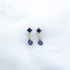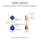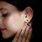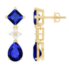 These earrings has that wow factor that youve been looking for. These earrings are studded with Princess Cut and Pear Cut Created Blue Sapphire and Dainty Round Moissanite. These Stud Drop Earrings will mesmerize your lady love for sure and she would get compliments whenever shell adorn these earrings. These Created Blue Sapphire Earrings are an alluring piece of fine jewelry, handcrafted in Solid Gold.