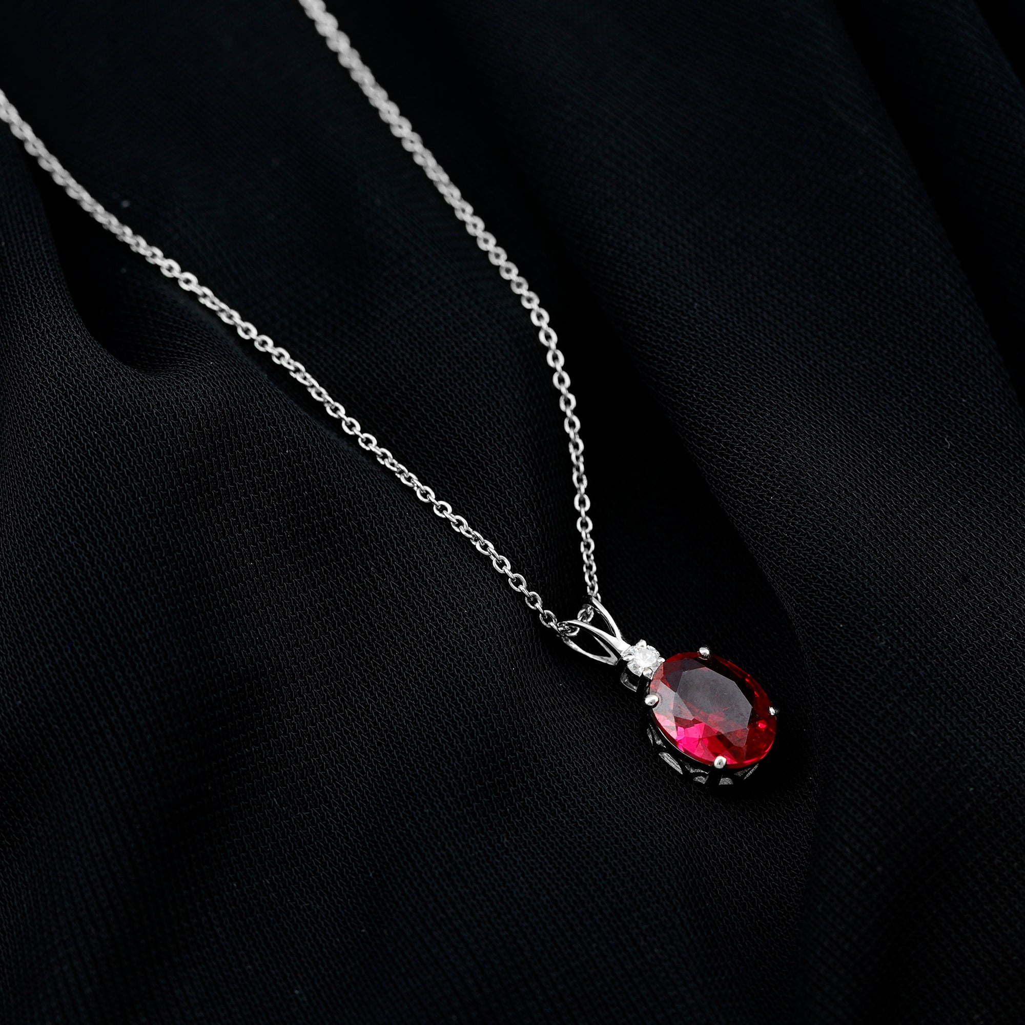 Bring beauty and confidence to your look with this elegant Solitaire Pendant Necklace, designed to stand out with rich color and shine. At the center of the pendant is a stunning 8X10MM oval cut lab created ruby, set securely in prong setting. Above the ruby sits a dainty moissanite that adds gentle sparkle and highlights the center stone. This subtle detail enhances the overall design. The Lab Grown Ruby Pendant is finished with a rabbit ear bail, allowing it to hang neatly and comfortably from the cable chain. Lightweight and easy to wear, this Oval Shaped Necklace rests beautifully on the neckline and pairs well with casual outfits as well as dressy attire. Made using AAAA quality lab created ruby and D-VS1 quality moissanite, it is an eco-friendly choice for those who value responsible jewelry. This Ruby and Moissanite Necklace comes neatly packed in a jewelry box, making it ready for gifting or safe storage. Ideal for birthdays, anniversaries, celebrations, or personal milestones, it is a timeless piece that adds elegance and meaning to any look.