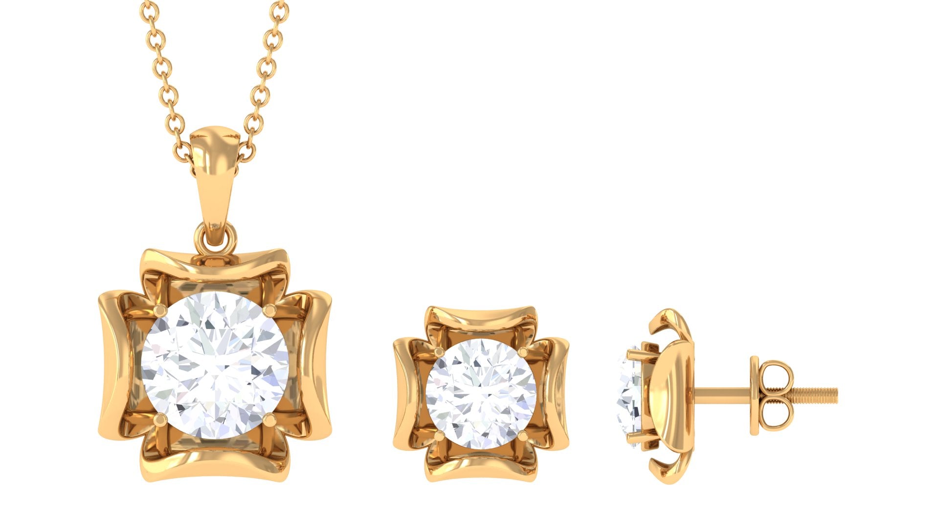 This Solitaire Jewelry Set is an elegant and timeless choice for any occasion. The set includes a stunning pendant necklace and matching earrings, each featuring a Round Moissanite stone in prong setting. This Jewelry Set is crafted with gold metal to give a luxurious look.