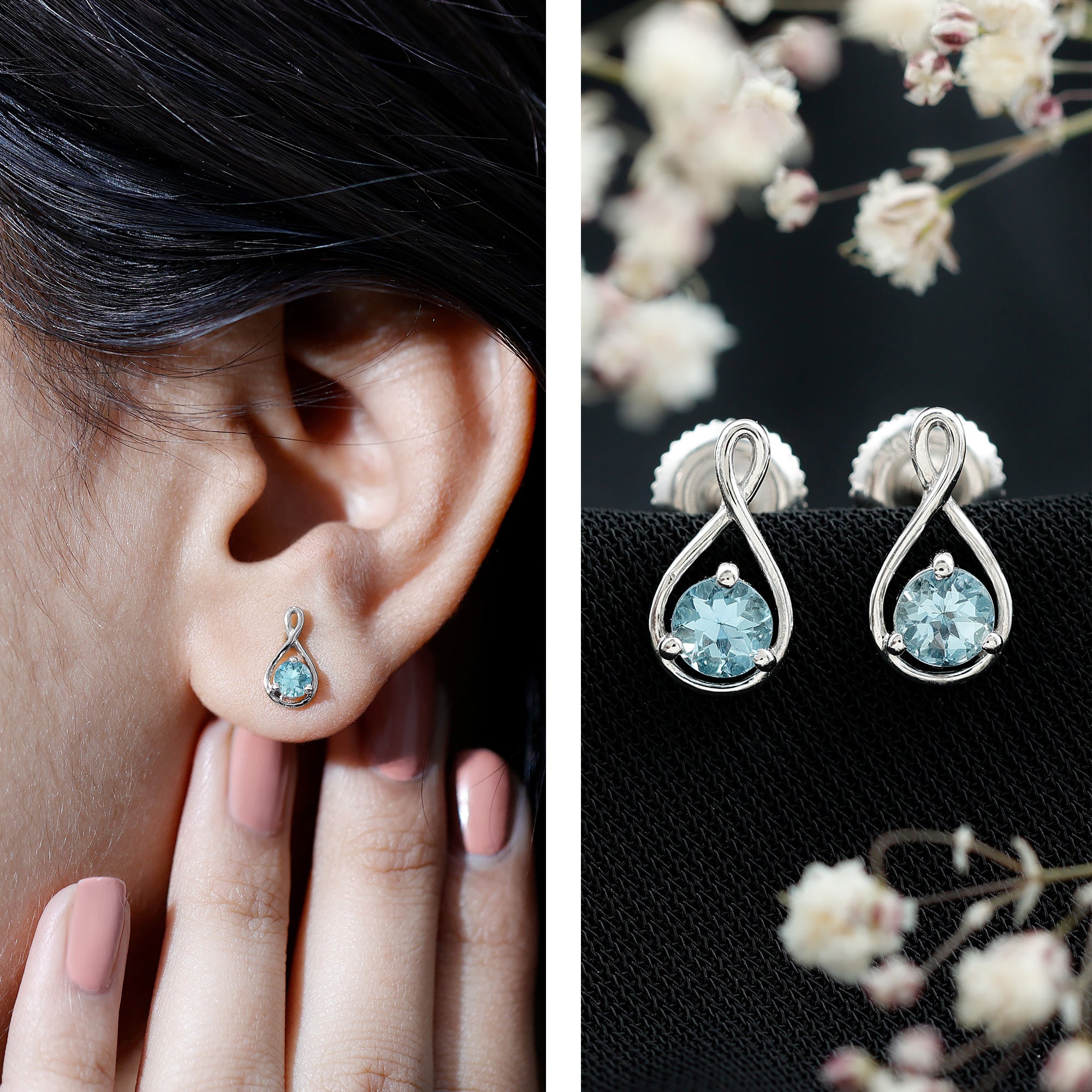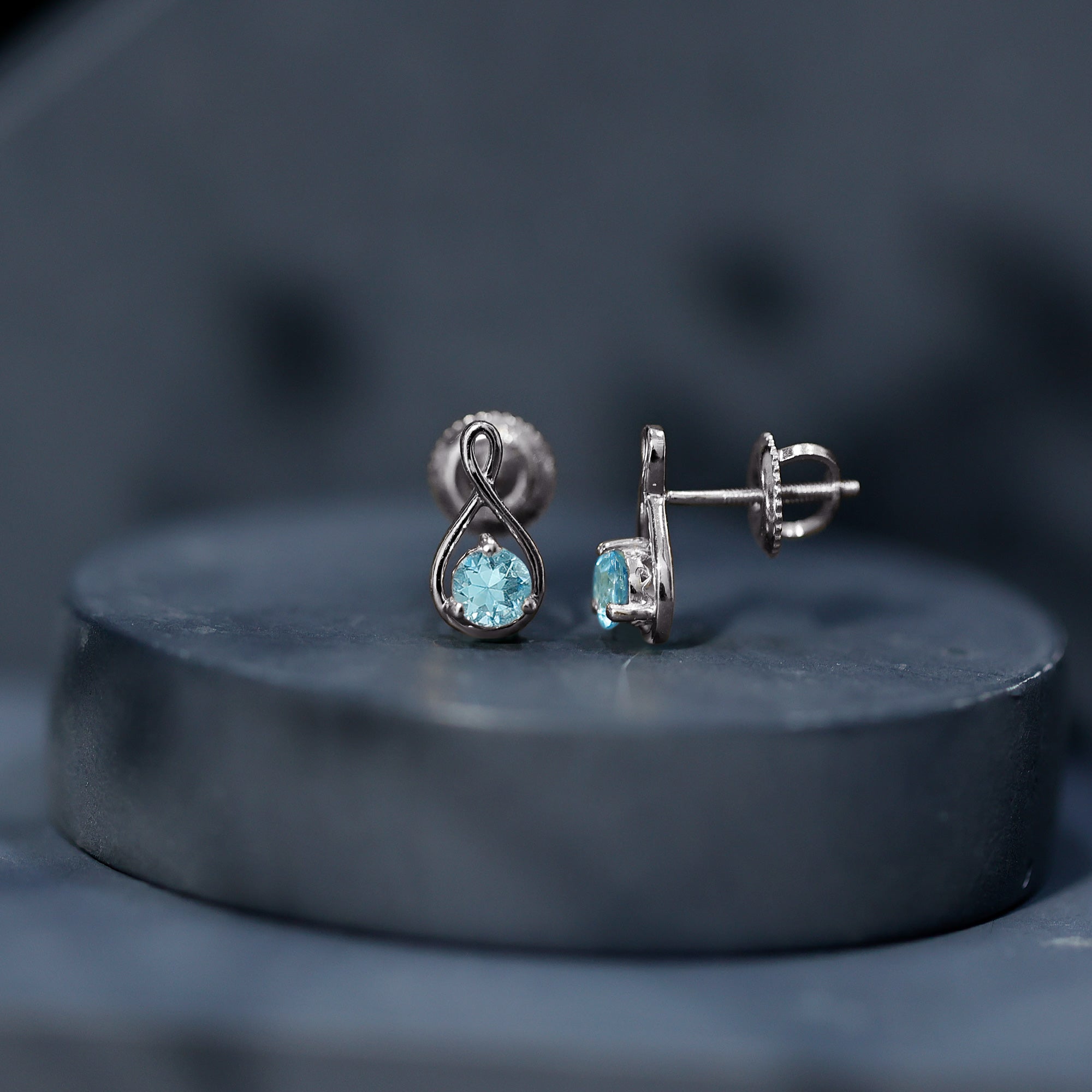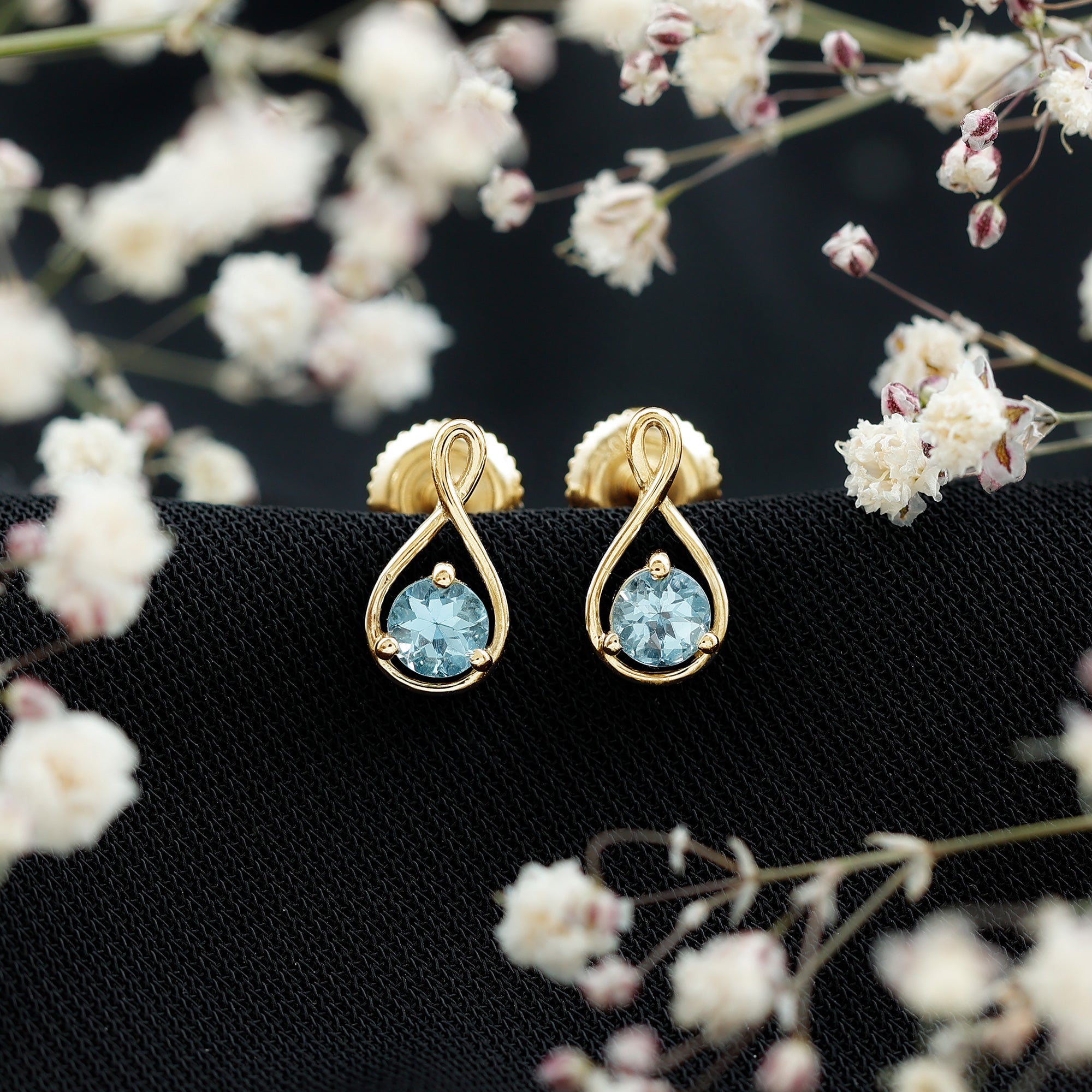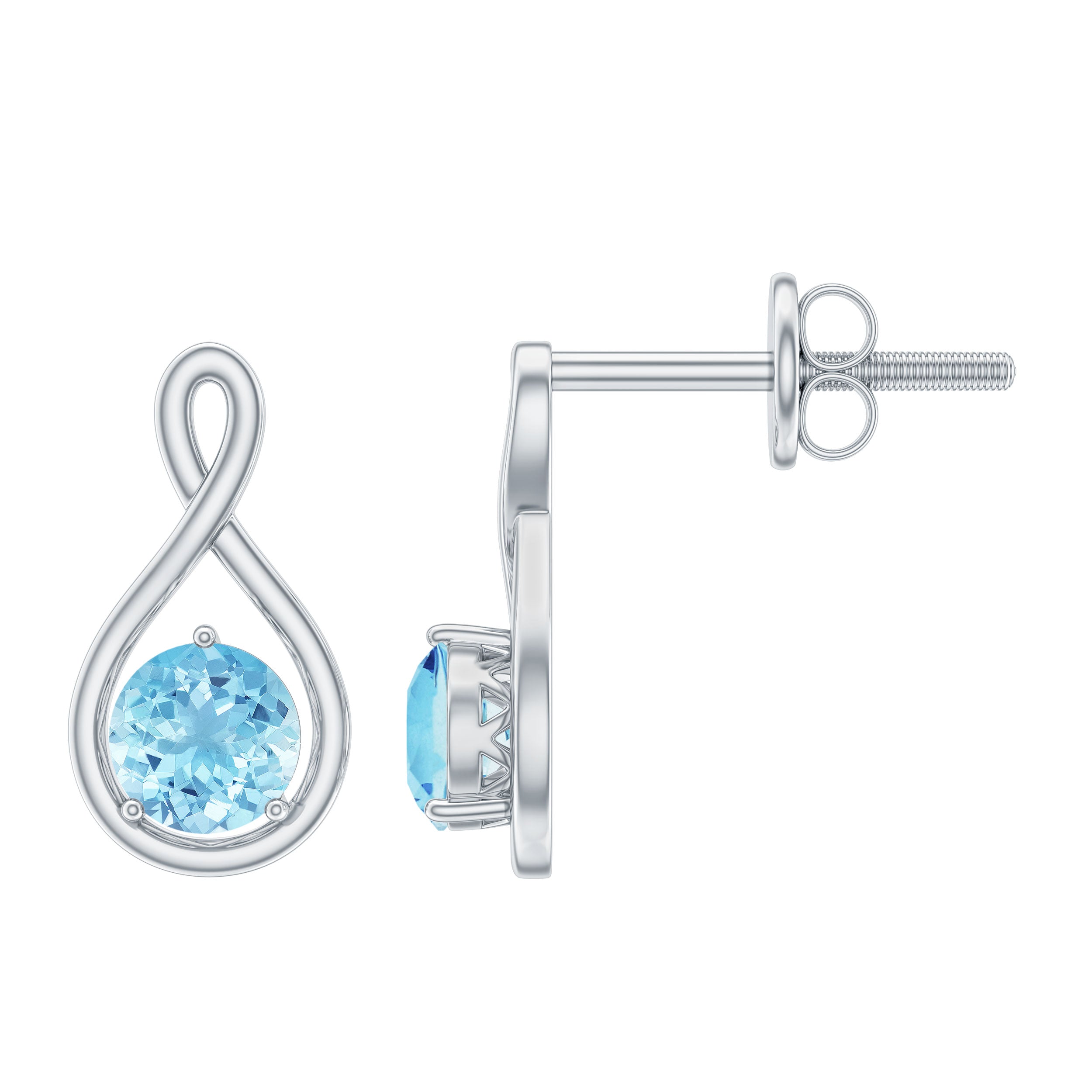 These Infinity Stud Earrings embellished with Round Cut Aquamarine Gemstone is set as Solitaire in a Prong Setting, crafted in a Solid Gold.