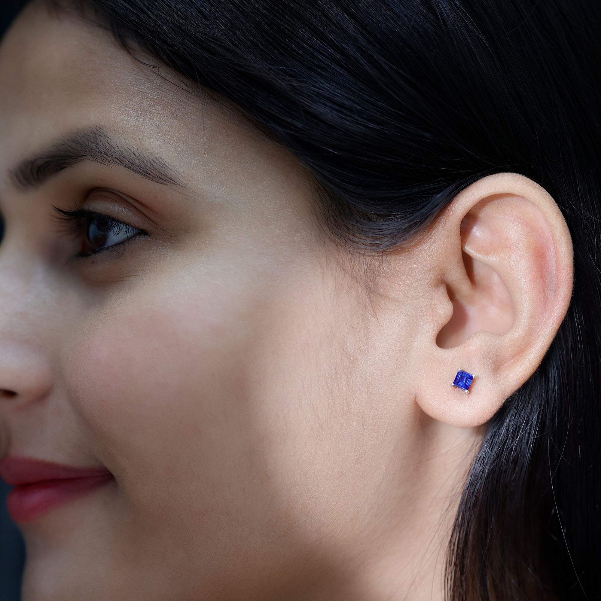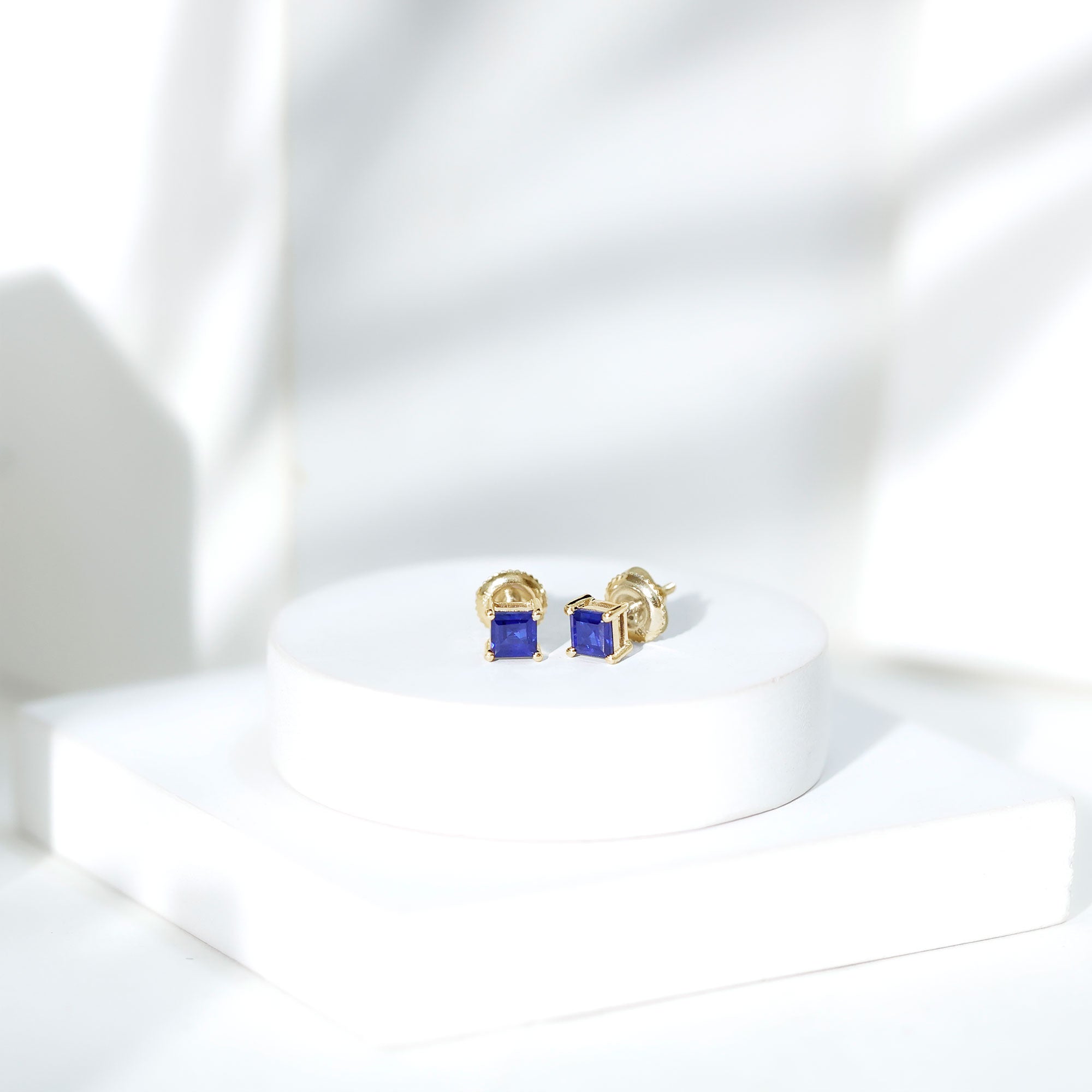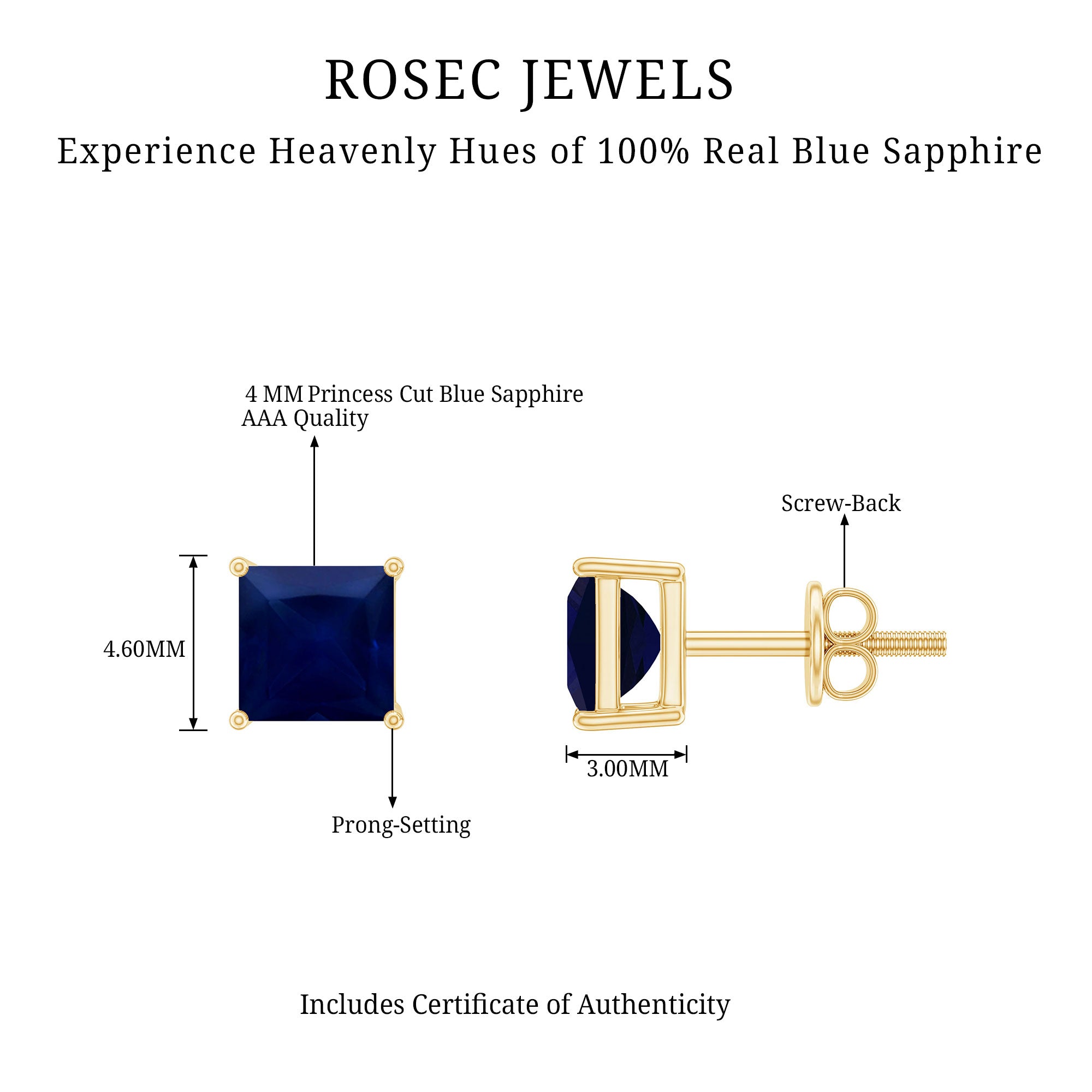 Indulge in a luxurious accessory with these stud earrings designed for women. The centerpieces of these earrings are Princess Cut Blue Sapphires, held in place by a 4 Prong setting. Crafted with care in solid gold metal, these earrings are sure to make you feel exceptional every time you wear them. Elevate your style with these stunning earrings and let them become a staple in your jewelry collection.