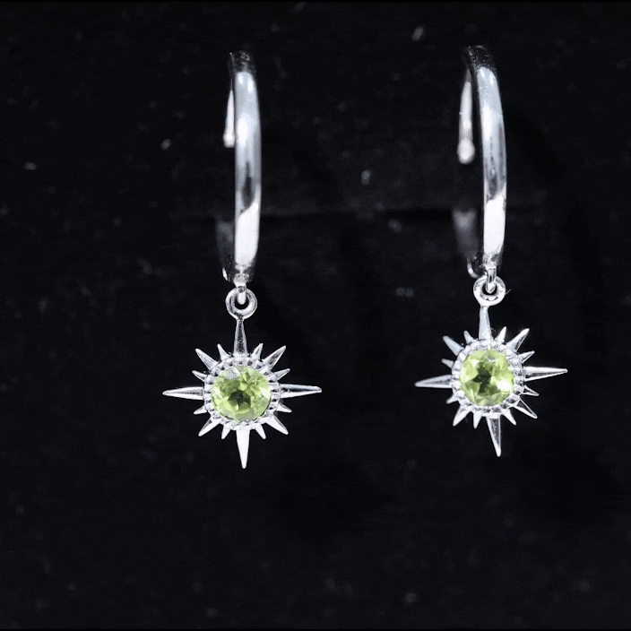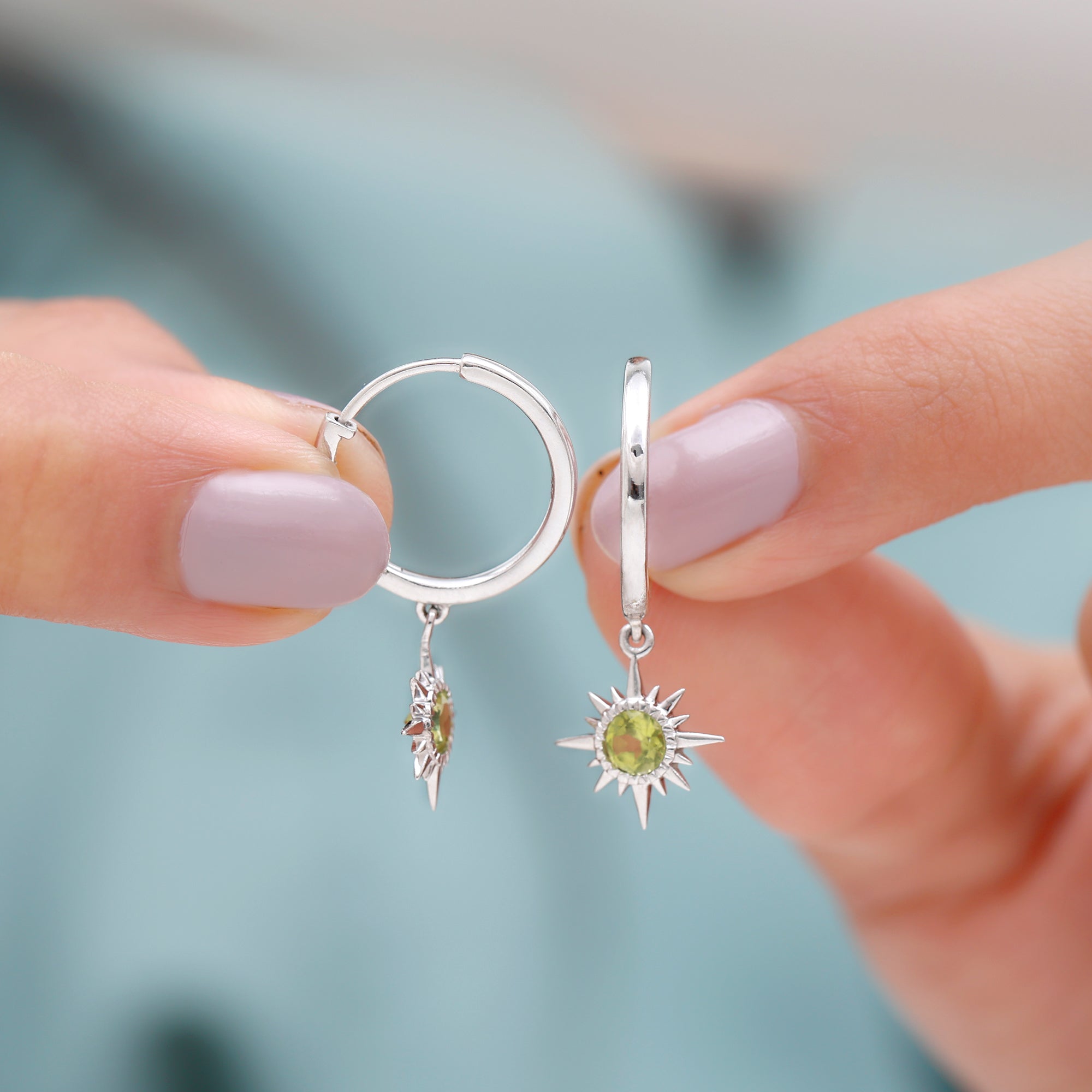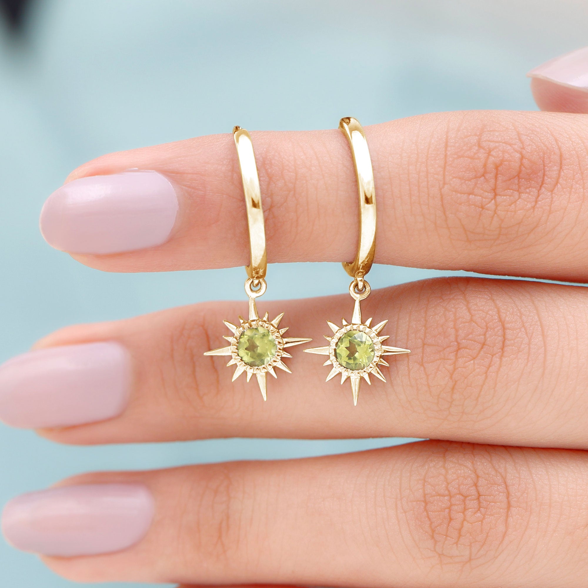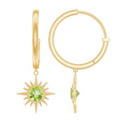 Express your love with these Sunburst Hoop Earrings embellished with Round Shape Peridot is set in a Bezel Setting. These Hoop Drop Earrings are crafted in Solid Gold.