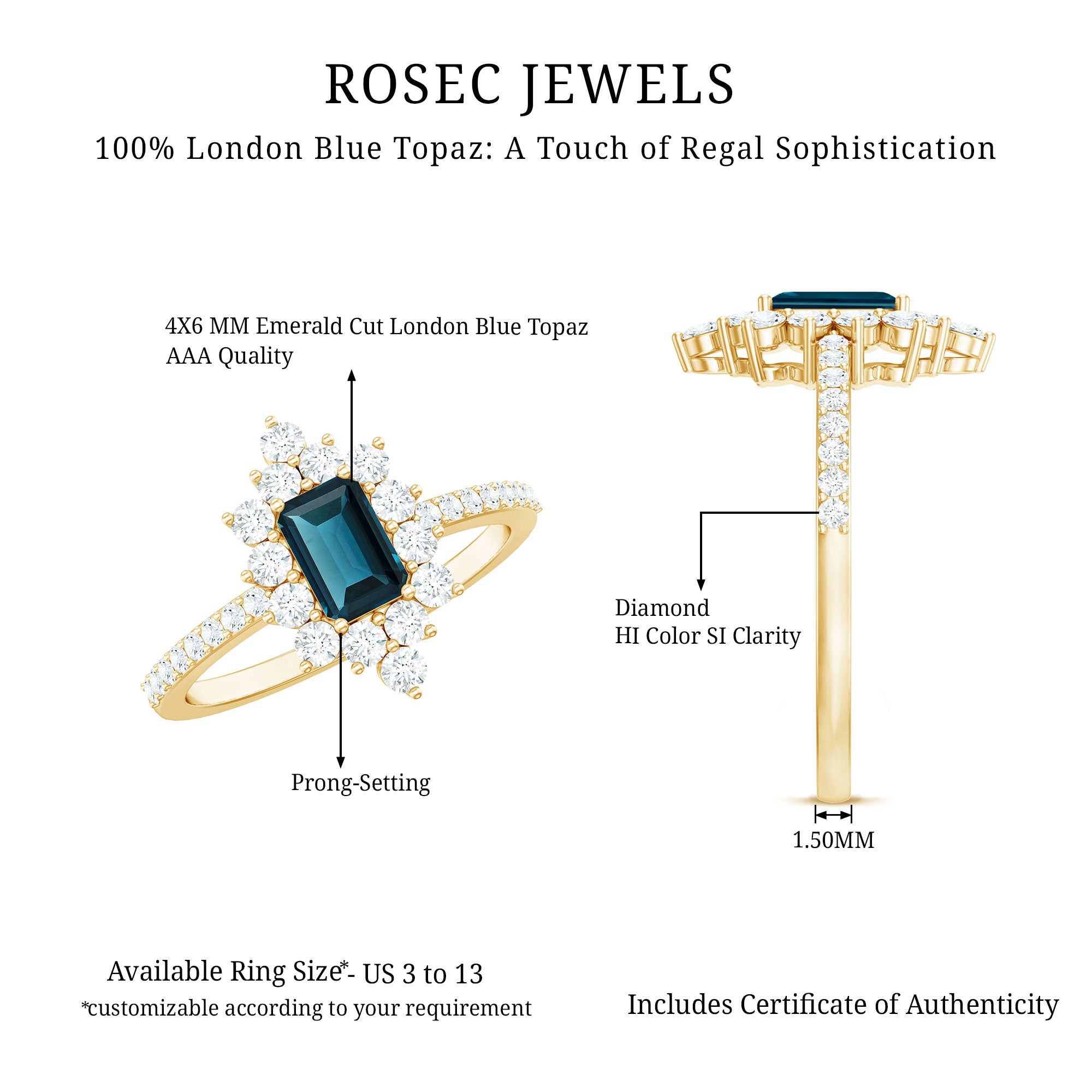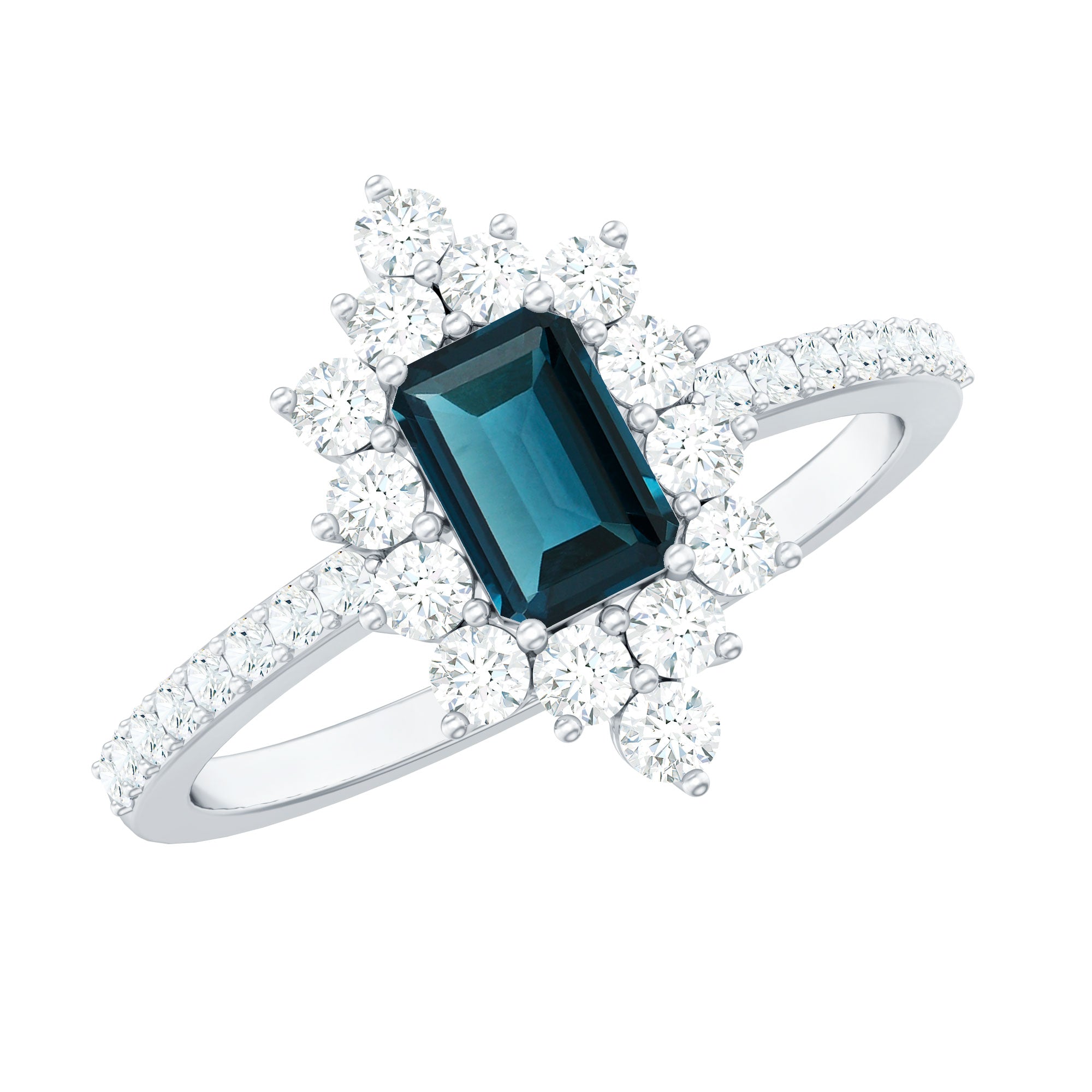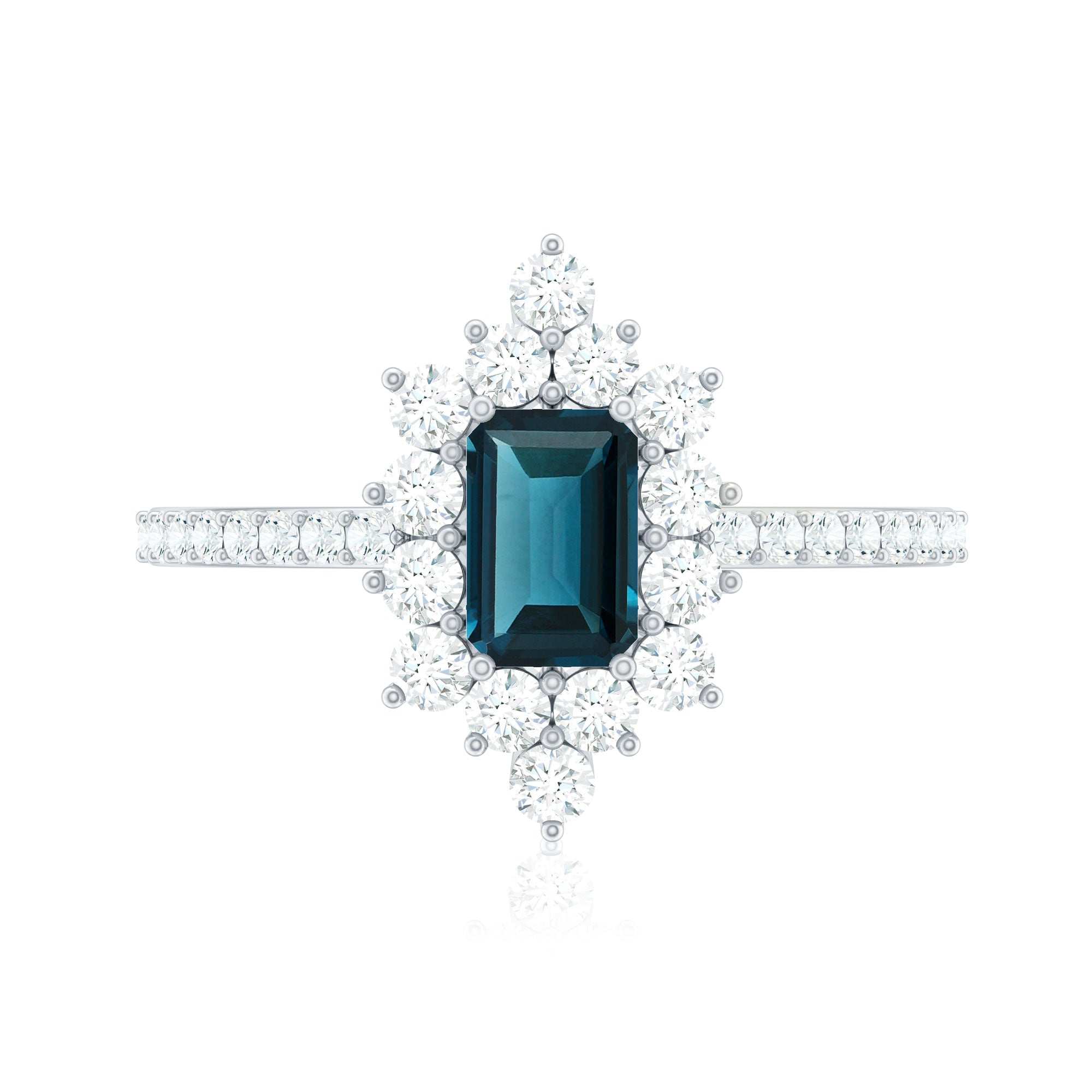 4X6mm Emerald Cut London Blue Topaz Antique Looking Engagement Ring with Diamond Halo
