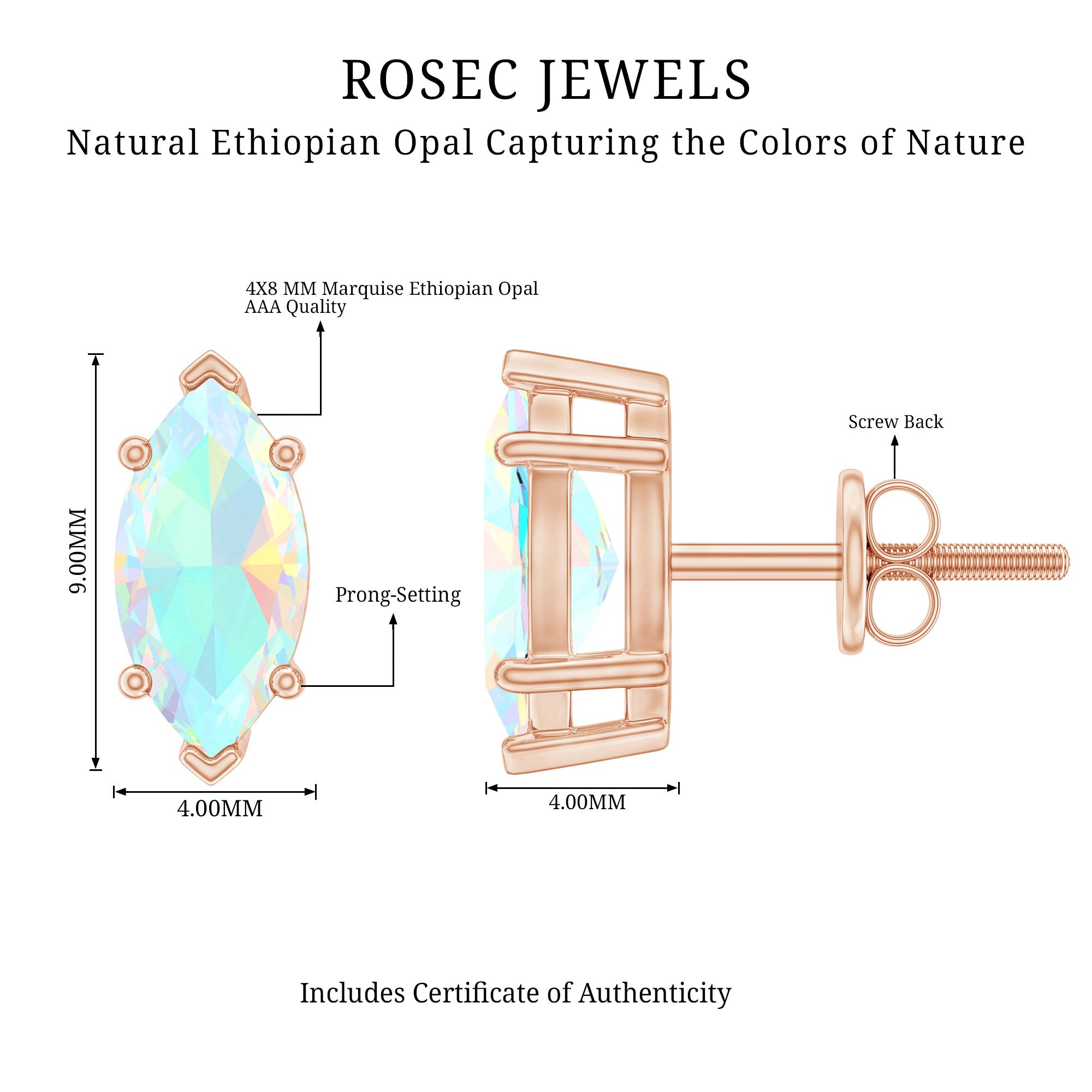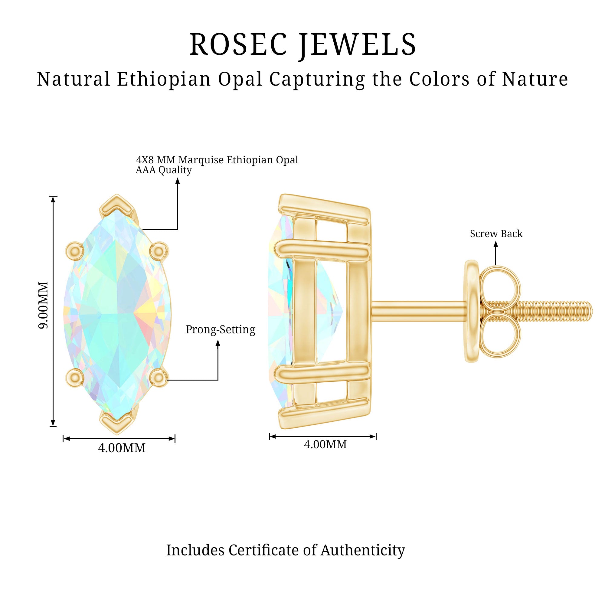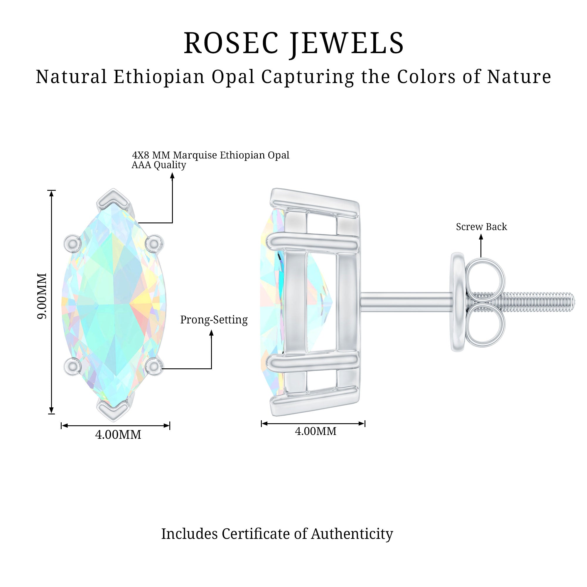Elevate your day-to-day look with the charm of these Ethiopian Opal Earrings, crafted to bring an enchanting glow to every moment. These Fine Earrings feature 4X8 mm Marquise Shape Ethiopian opal set in Prong Setting, known for its mesmerizing color that shifts beautifully as it catches the light. The elongated shape creates a graceful, eye-catching silhouette that feels modern yet timeless, perfect for anyone who loves jewelry that stands out in a subtle, effortless way. Secured with Screw Back Closure, these Opal Stud Earrings offer comfort and peace of mind, making them ideal for long days, busy outings or special occasions where you want to shine without worry. Packaged in a lovely jewelry box, these October Birthstone Earrings arrives in a ready for gift packaging, making them a thoughtful choice for birthdays, holidays or a little self-love moment. These Opal Studs pair seamlessly with everything from classic to flowy dresses, giving you endless styling versatility. Elegant and captivating, they are the kind of earrings you will reach for again and again, simple enough for everyday wear yet filled with the kind of beauty that instantly brightens your entire look.